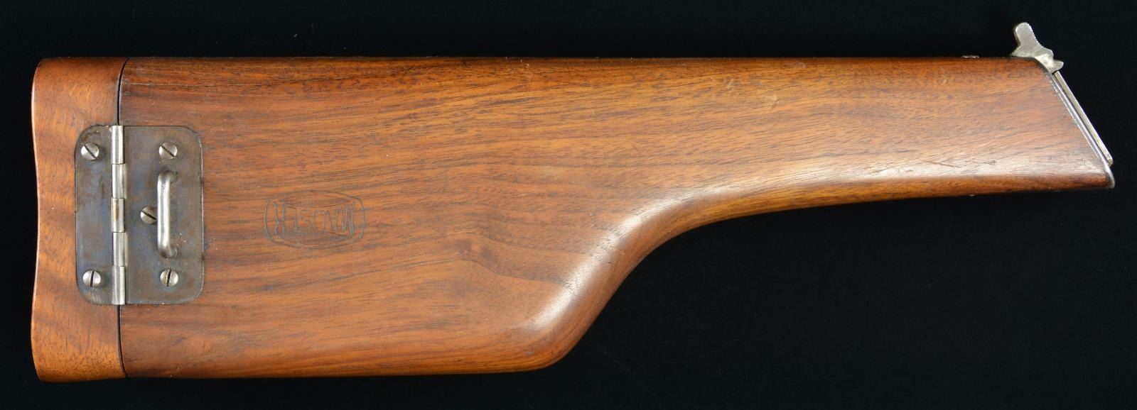 Overall: 14 1/4". Stock Iron numbered "030". Back of stock by hinged has Mauser banner. CONDITION: Wood has very good overall appearance w/ light handling marks. Hinge & iron show fair traces of blue mixed w/ peppery oxidation & brown patina. (02-16945-26/MD). $300-500.