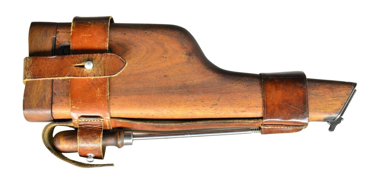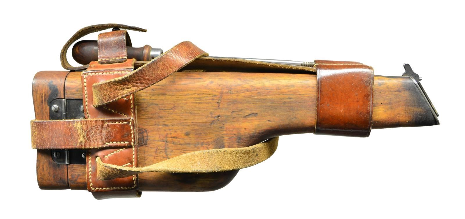 Very rare stock set from 1940 order of 7,800 shipped to Luftwaffe. Pistols were numbered w/ in 83000 to 93000 range. Stocks have Mauser Banner by hinge base plus proof of eagle over "Kax" over "30" below banner. Release button has concentric circles. No numbers on stock iron. Leather harness assembly is complete w/ cleaning rod. & shoulder straps. This same style rig shown on page 165 of "THE BROOMHANDLE PISTOL 1896-1936" by Erickson & Pate. CONDITION: harness & cleaning rod are in remarkable very good to excellent condition. Front edge of stock iron has nice traces of Nitre blue; faded to grey tone on balance. Hinge base very good w/ out typical spots of oxidation & only light edge wear. Wood has open grained, cleaned appearance w/ oiled look; no varnish or gloss. Lid has epoxy repaired spit that was complete separation approx. at mid point going top to bottom. Sm. chip missing in handle cut of lid that would correspond to center rear of grip. (02-16945-4/NW). $800-1,200.