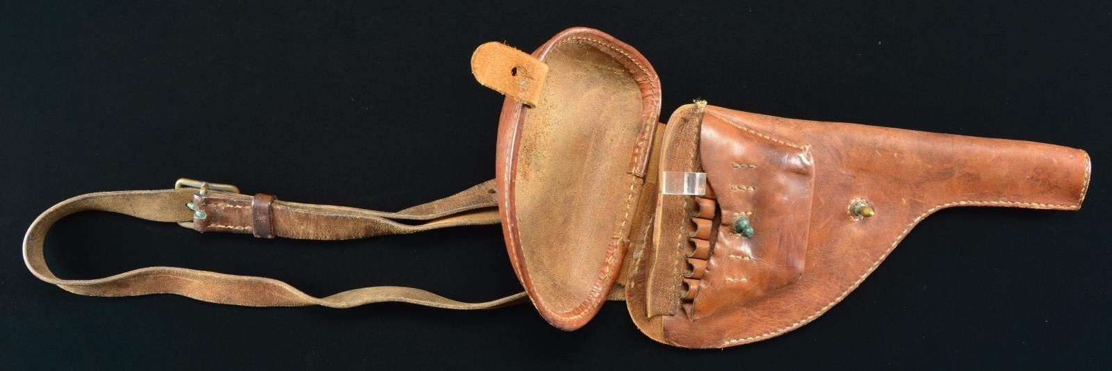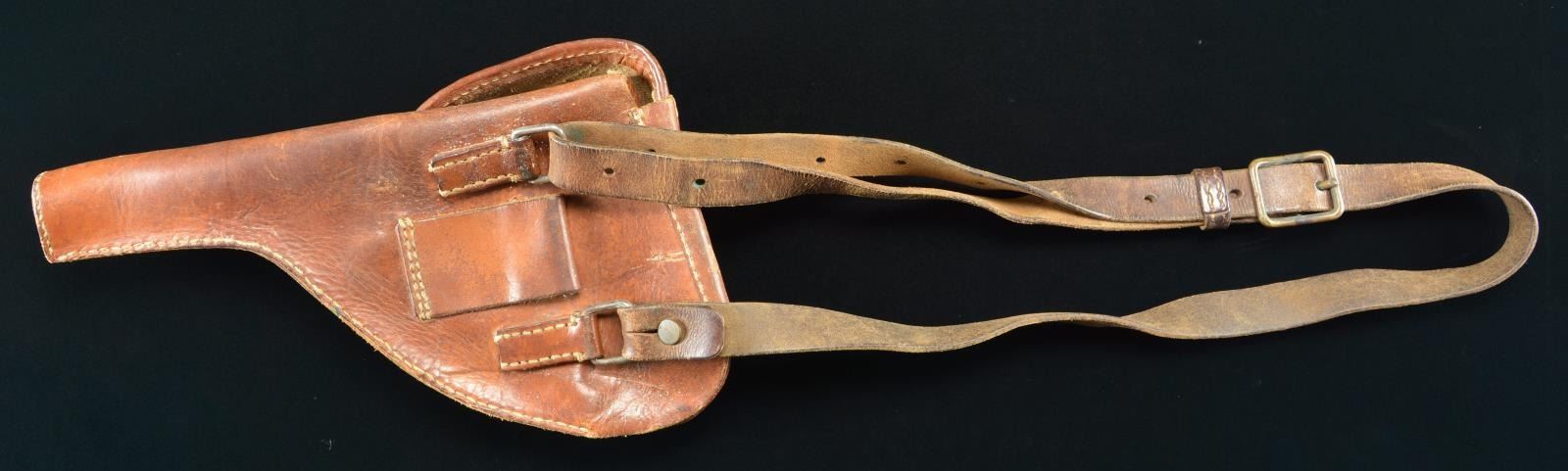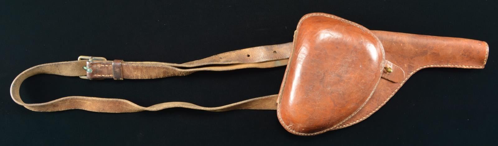 Very good unmarked brown clamshell holster w/ shoulder strap & single wide belt loop for C96 Mauser style pistol such as Chinese copy. Obviously influenced by Japanese Type 14 holsters w/ ammo pouch under clamshell having 3 rows of cartridge loops for 8, 6 & 4 rounds. Ammo pouch flap secured by brass stud; clamshell cover has attached strap that also secures to brass stud. Slight verdigris on studs, strap buckle & in cartridge loops. Slightly lesser condition for strap being oiled & darker w/ some light cracking of leather. Photo of similar holster shown on P264 of "THE BROOMHANDLE PISTOL 1896-1936" by Erickson & Pate. Great enhancement to Mauser or Asian firearms collection. (02-16946-6/NW). $250-400.