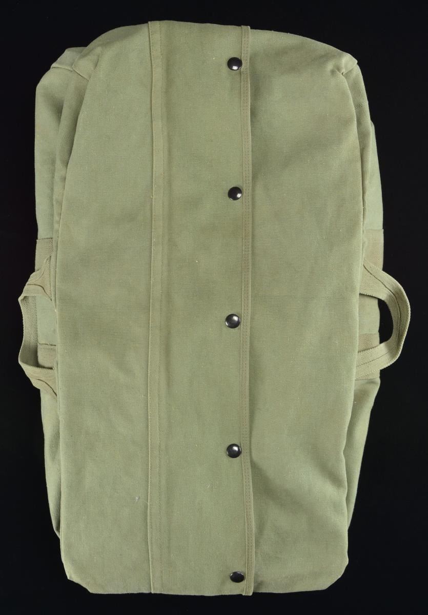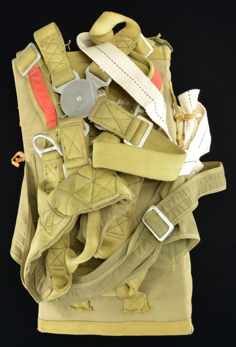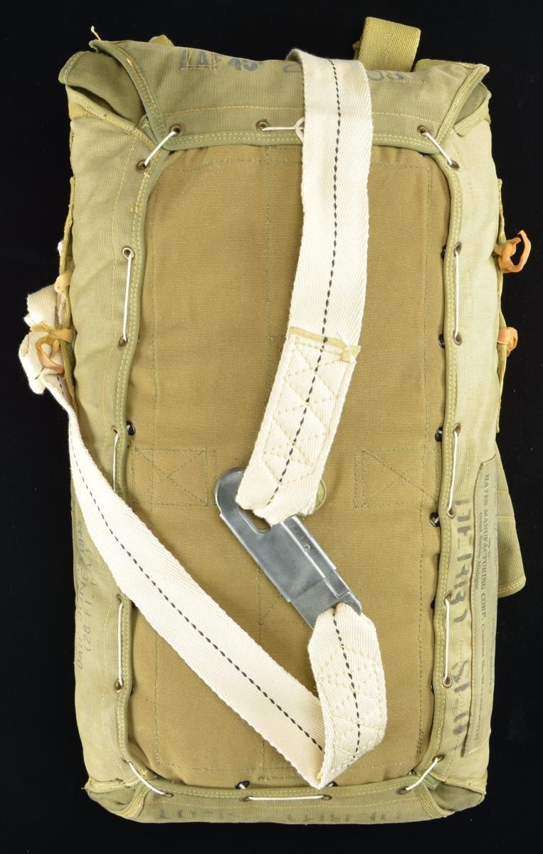PARACHUTE. A seldom seen example of a US WWII T7 parachute. The label on the side of the parachute reads “Gov’t. No. AAF 45-254 408 Type-T7 PARACHUTE CAMOUFLAGE Dwg. No. 44J9634-3 Mfg. by HAYES MANUFACTURING CORP. CONTRACT NO. W-33-038-ac-7737 Grand Rapids, Michigan”. Cover is stenciled “DERRY SLOT”. The top of the pack is stenciled “AAF 45-254408”. Chute comes with all white & green cotton canvas straps & metal buckles intact. The parachute is contained within a green canvas carrying bag. CONDITION: parachute has not been unpacked, but appears to be in superb condition. (02-18113-5/BF). $3,500-5,000.