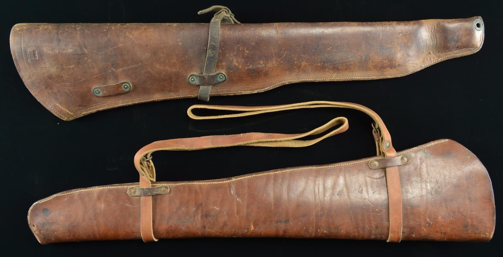 1) M1904. A russet leather M1904 rifle scabbard for use with the 03 Springfield rifle. This example is approx. 33 1/2" long and is marked “U.E. CORP. 1918 J.M.C”. The top securing strap is missing but the lower one is present. CONDITION: the body of the scabbard has the usual scuffs & scrapes, but no notable damage.