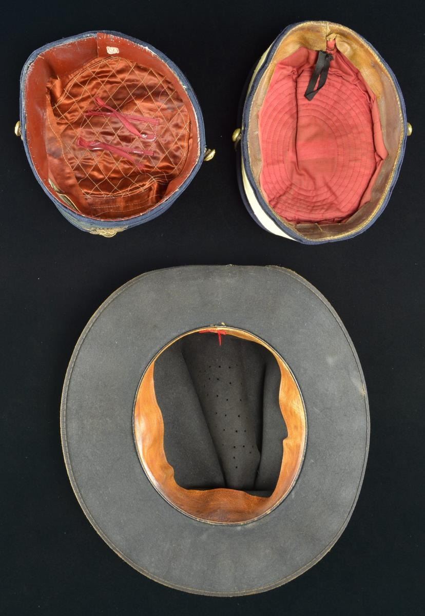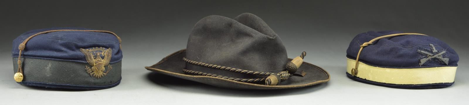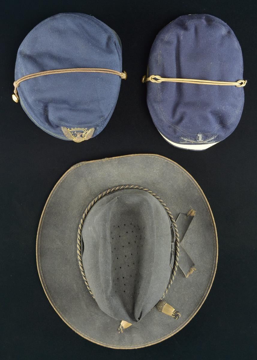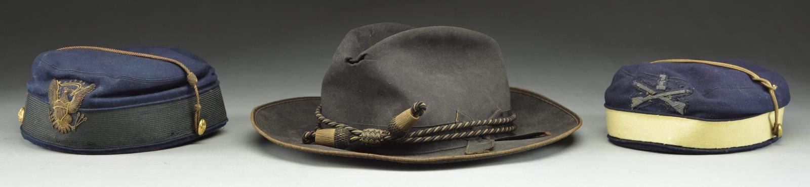 HATS. 1. Slouch hat, black felt, sewn silk edging, 1.75” patent leather sweatband, size 7 label. Tied black ribbon with flat bow and Civil War/ Indian War era officer’s hat cord with acorn knots. Manufactured with small vent holes in top. Very good overall with 1” worn hole in front top fold. 2. Pillbox fatigue cap, navy blue wool, buff band, embroidered insignia with crossed Rifles and “1”. Good overall, bullion chinstrap with tin back eagle “I” buttons, quilted red cotton lining, 1.25” patent leather sweatband. 3. Pillbox fatigue cap, navy blue on 2” OD band, bullion chin strap, eagle side buttons, direct embroidered American eagle insignia, quilted red silk liner with frayed San Francisco makers label. fair to good overall, lacquered 1.5” sweatband dry and cracked but complete. PROVENANCE: From the Lifelong Collection of Glen E. Mattox. (02-18932/JS). $800-1,200.
