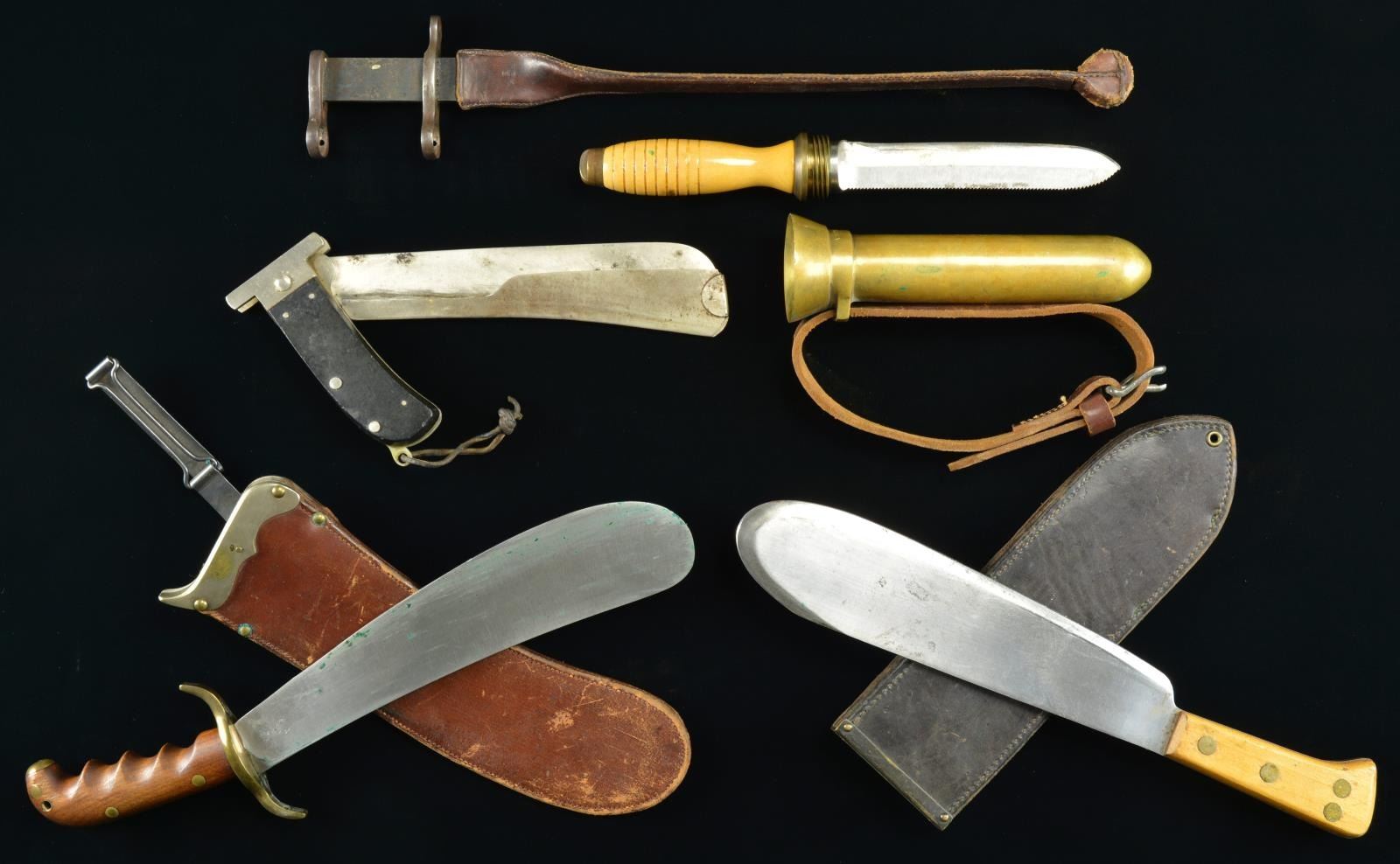 4) MACHETE. An Army Airforce survival knife of the WWII era. This folding machete measures 11 1/2" closed. Blade is unmarked and is complete with its sheet metal protective covering. 2-Piece composite grip with lanyard hole intact. CONDITION: knife shows light to moderate wear overall with heavy sharpening to the blade.