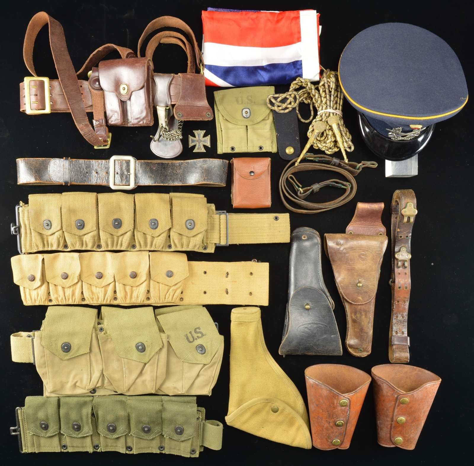This large group includes 1 green cotton canvas Marine Corps 10 pocket cartridge belt with interlocking buckle dated 1945. / 1 WWI USMC 2 pocket 45 Cal. clip pouch dated 1918. / 1 Tan cotton canvas 9 pocket cartridge belt with subdued rimless button closures and interlocking buckle. / 1 Green cotton canvas 6 pocket cartridge belt missing female buckle. / 1 Tan cotton canvas 10 pocket cartridge belt with snap closures and interlocking buckle by Russel dated 1916. / 1 Tan cotton canvas equipment belt with matching 45 Cal. clip pouch dated 1918 and russet leather sword hanger. / 1 Tan cotton canvas 45 Cal. clip pouch dated 1918. / 1 Green cotton canvas clip pouch dated 1943. / 1 Pair of goggles in a brown full leather pouch. / 1 Tan cotton canvas full length rifle sleeve with carrying strap likely for an 03 Springfield. / 1 Russet leather holster for a 45 Cal. automatic pistol. / 1 Black leather holster for a 45 Cal. automatic pistol. / 2 BAR clips. / 1 Modern nylon British flag. / 1 Black & gold bullion British Naval aiguilette. / 1 Tan canvas action cover marked “L.C.C. & CO., 6-18”. / 1 Light green cotton canvas backpack with all straps intact marked “BAKER LOCKWOOD MFG. CO. INC. 1941”. / 1 Light green cotton canvas pouch. / 1 Green cotton canvas equipment backstrap set. / 1 BAR tan cotton canvas cartridge belt with 4 large pockets and 1 pocket for two 45 Cal. auto clips. Belt also has metal cup intact and is marked on the reverse “L.C.C. & CO., 10-18 RIFLEMAN’S RIGHT” & “LEFT” on other side. / 1 BAR tan cotton canvas cartridge belt with 4 large pockets and 1 pocket for two 45 Cal. auto clips. Belt also has metal cup intact and is marked on the reverse “P.B. & CO. RIFLEMAN’S RIGHT” & “....LEFT BROWNING COLT 5-1918” on other side. / 1 Pair of russet leather cuff covers marked “GRAY HORSE T 1899”. / 1 Green cotton canvas pouch with a clip on carrying strap. / 1 Private purchase russet leather “Sam Brown” belt with 45 Cal. clip pouch, over the shoulder strap, and chain saber hanger. / 1 Military rifle sling for an 03 Springfield. / 1 Black leather private purchase waist belt. / 1 Leather canteen sling. / 1 English tan canvas holster dated 1925. / 1 Green cotton canvas strap. / 1 Steel mess kit with utensils. / 2 Aluminum canteens with tan cotton canvas & leather covers. / 1 Aluminum canteen with a green cotton canvas cover dated 1944. / 1 Green cotton web equipment belt with canteen & cover dated 1956. Belt also includes a first aid kit in pouch and a miscellaneous pouch. / 1 West German visor cap. / 1 WWII 2nd class iron cross in rough condition with no suspension ring or ribbon. CONDITION: all items show light wear and appear fully serviceable except as noted. (02-17951/BF). $900-1,300.