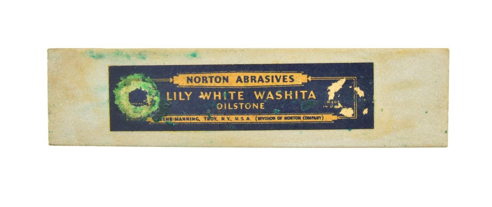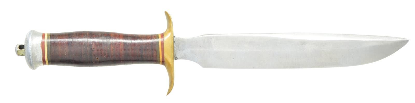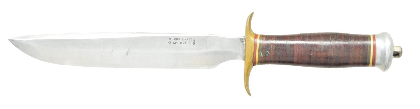 No. 1 FIGHTING KNIFE. Blade length is 7 13/16" w/ carbon steel blade w/ 1 1/2" sharpened false edge. Knife is 12 7/8" overall. Double sided curved brass hand guard. Smooth leather washer grip w/ red, white & black spacers at either end. Oval aluminum pommel w/ protruding hex nut which is drilled for a lanyard. Knife is marked on left side of blade "RANDALL MADE SPFLD. MASS." flanked by the trademark "RANDALL Scimitars". Unmarked brown leather sheath w/ white stitching & brown colored rivets. Sheath has belt loop, retaining strap & oil stone pocket. Oil stone includes original Norton Lily White Washita label. Randall knives have been produced since 1937 w/ the Springfield Fighting knife produced by North Hampton Cutlery Co. w/ design & proto type supplied by Bo Randall. This knife was produced in the late WWII period w/ approx. 1200 being made. One notable user of this Model Randall knife was General James Gavin, Commander of the 82nd Airborne Division. Randall knives were mfg. starting in 1937 & the tradition of these extremely high quality knives continues today. CONDITION: blade appears to be very lightly sharpened w/ no significant scratches. Blade has several sm. areas of discoloration. Brass guard has turned a pleasing dark patina w/ very light edge ware. Leather handle has very light wear & scattered sm. handling marks. Pommel & nut are turning gray. Brown leather scabbard is in very good condition w/ very light wear & scuffing plus functional snaps & tight stitching. Original Oil stone has appearance of very light use w/ light staining & label is complete & legible. PROVENANCE: From the Lifelong Collection of Glen E. Mattox. (02-18450/RW). $1,500-2,500.