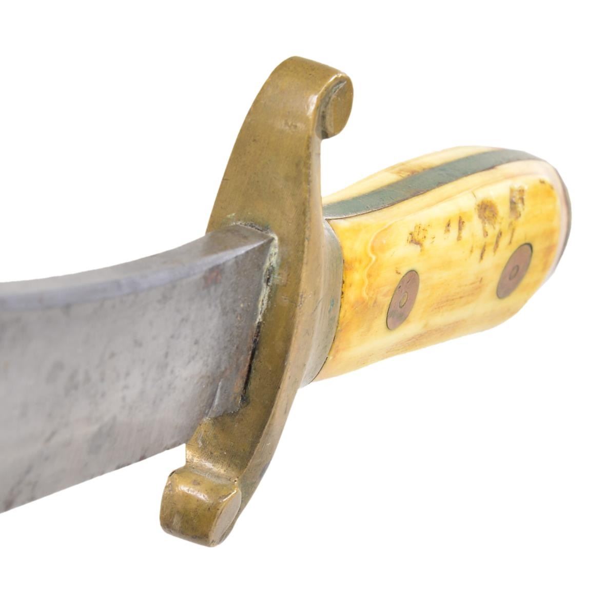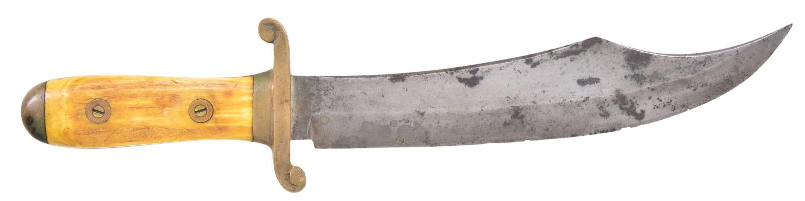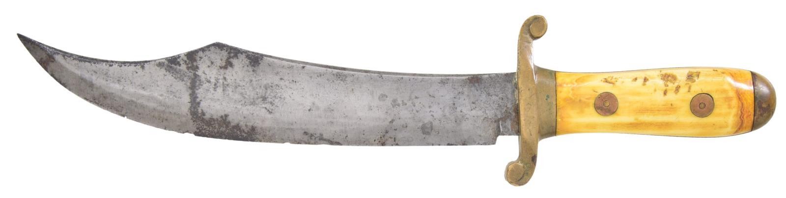 CLIP POINT BOWIE. This is unusual form made from a Krag rifle bayonet with a really good look. 12.5” overall, 8.25” upswept clip point, 1” wide in choil, 1.2” at strat of cutting edge, tapers out to 1.6” at clip. Grip is cast brass with heavy pommel & “S’ crossguard inset for 2 elephant ivory slab grips which are retained by brass screwed escutcheons. Very unusual and never seen another. CONDITION: very good overall, blade is gray with staining & pitting, brass grip & escutcheons have medium mustard/copper patina, slabs have aged yellowing. (02-16798/JS). $1,200-1,800.