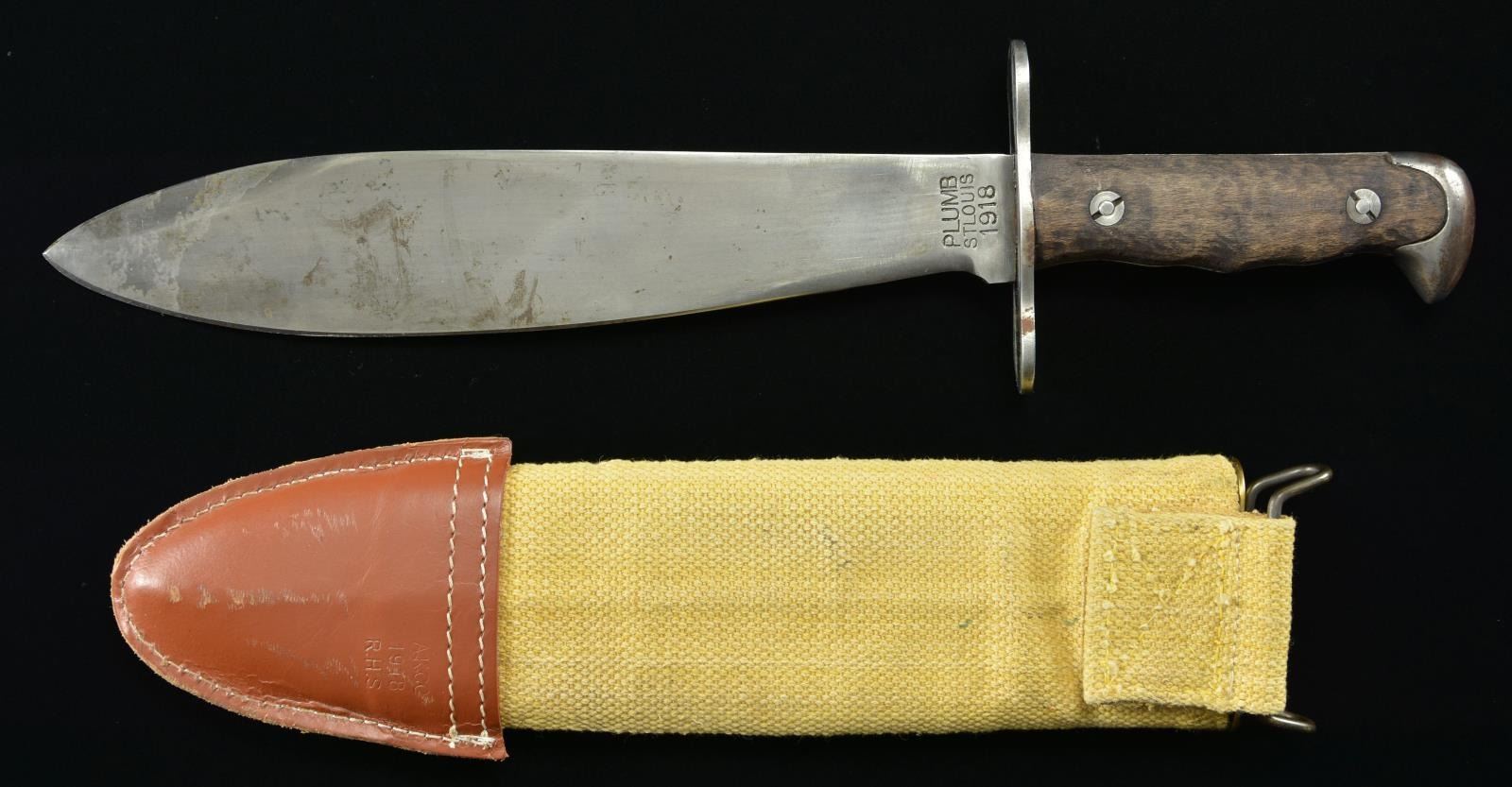1) BOLO. This bolo knife has an overall length of 16 1/2" with a blade length of 10 1/4". The blade is marked near the hilt “US. MOD 1917 C.T.” on one side and “PLUMB STLOUIS 1918” on the other. The scabbard has a canvas & leather cover. The leather tip is marked “A.K. CO. 1918 R.H.S.”. CONDITION: light wear overall.