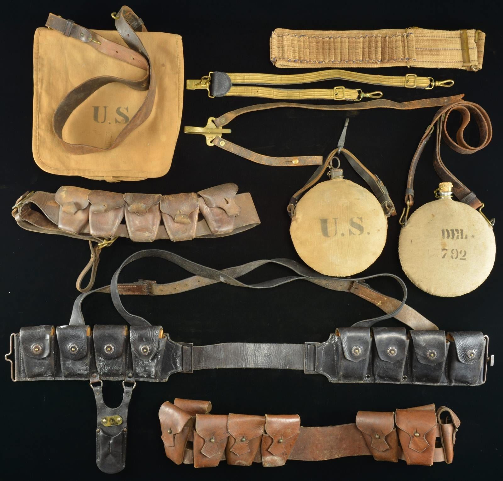 This fine group includes 1 Spanish American War era haversack marked “U.S.” on the front flap and “ROCK ISLAND ARSENAL” on the inside. Haversack is complete with leather sling. / 1 Spanish American War era canteen marked “U.S.” on the front and “DEL. 792” on the reverse. Canteen has a “make do” stopper with original leather sling. / 1 Spanish American War era canteen marked “U.S.” on the front. Canteen has a leather mounted troops suspension sling. / 1 Tan Mills belt likely for a Krag rifle. Buckle is a C-type closure. / 1 British M1903 cartridge bandolier in russet leather with 9 pockets and brass buckles. / 1 British 1903 cartridge bandolier in russet leather for the cavalry with 5 total pockets. / 1 Large dark leather 8-pocket bandolier with shoulder straps. Bandolier has snap catches on the front and an interlocking iron buckle closure. / 1 Pair of saber hangers with gold bullion facings. / 1 Russet leather & brass cavalry saber hanger. CONDITION: all items generally show light wear with no damage. The Mills belt is well-worn. The British cavalry bandolier is quite dry. Cavalry saber hanger has one broken strap. (02-17942/BF). $700-1,000.