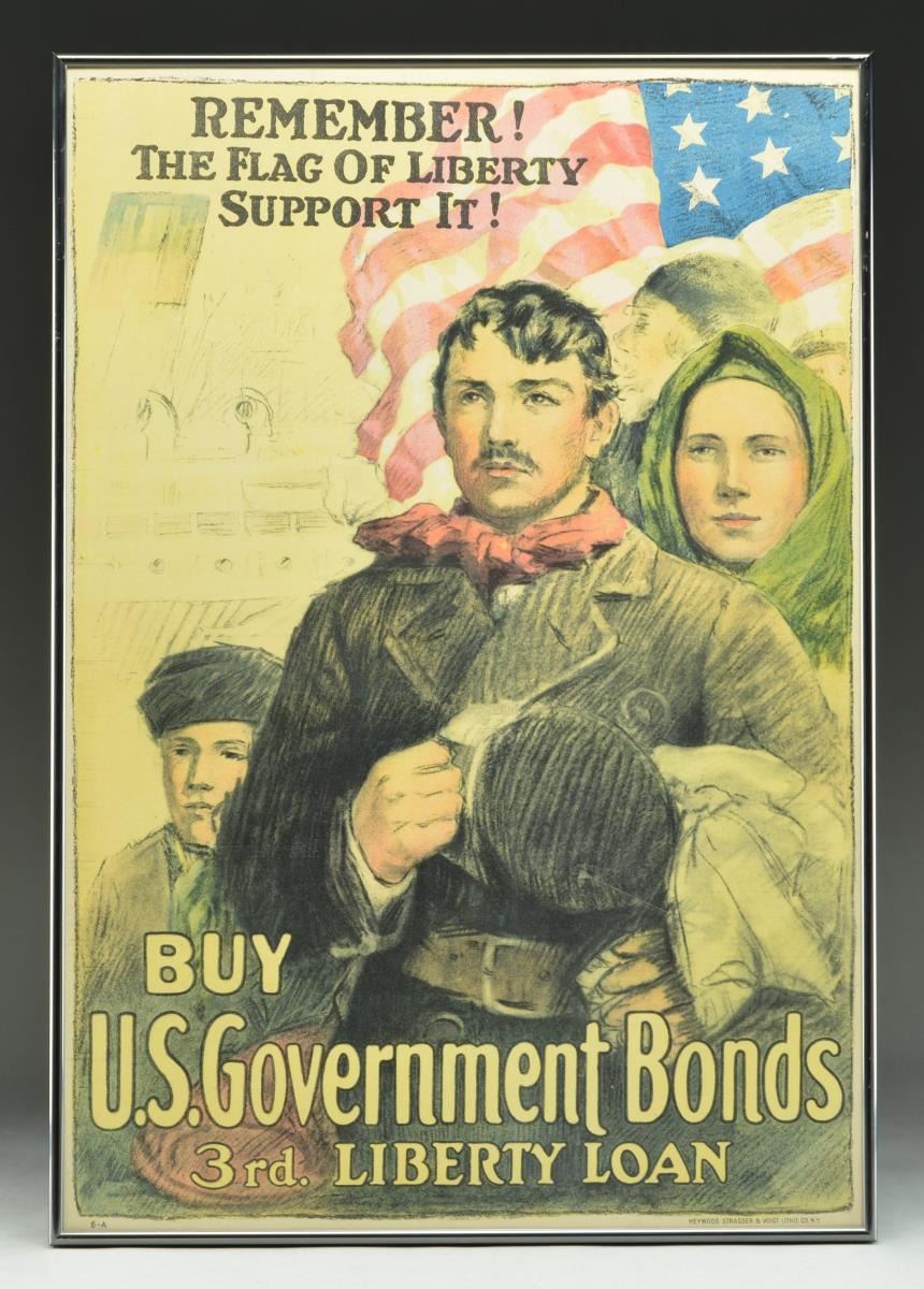 3) Attractive poster advertising government bonds for the 3rd Liberty Loan. The poster shows an immigrant family standing at attention. The father has removed his cap as a salute to the American flag shown waving in the background. The background also depicts subdued outlines of a passenger ship and the poster is lettered "REMEMBER!" "The Flag of Liberty Support It! Buy U.S. Government Bonds. 3rd Liberty Loan" Poster is unsigned but marked in lower left corner 6-A & marked in lower right corner "HEYWOOD STRASSER & VOIGT LITHO. CO. N.Y.". The subtle subdued colors have great visual appeal. CONDITION: poster in very good condition w/ little or no visible wear or staining.