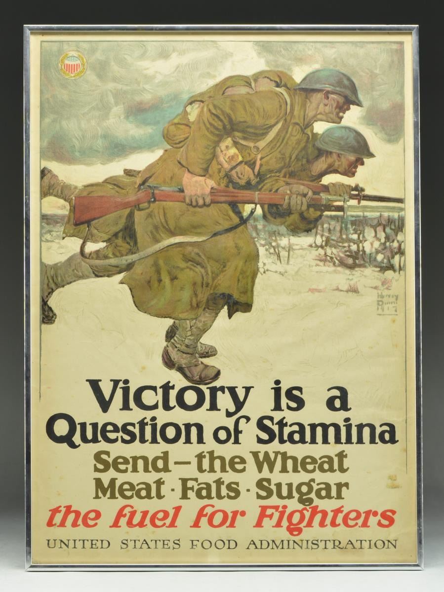 2) This poster is from the United States Food Administration. The US Food Administration was formed to encourage the voluntary conservation of food by the public. This administration was headed by Herbert Hoover who was the 31st U. S. President of the United States. The poster is from a lithograph signed by Harvey Dunn, 1917. Marked also in lower right hand corner "LATHAM LITHO & PIC. CO. BROOKLYN NY". The poster which has the Food Administration logo in the top left corner shows 2 grimacing American soldiers w/ bayoneted rifles running to attack German trenches in a winter scene. The poster states: "Victory is a Question of Stamina. Send - the Wheat - Meat - Fat - Sugar. The fuel for Fighter" "United States Food Administration". The poster is framed professionally in glass fronted metal frame. CONDITION: the poster has some scattered sm. spots of staining & edge wear but retains it prominent coloration. The glass front has a sm. crack in the lower left corner.