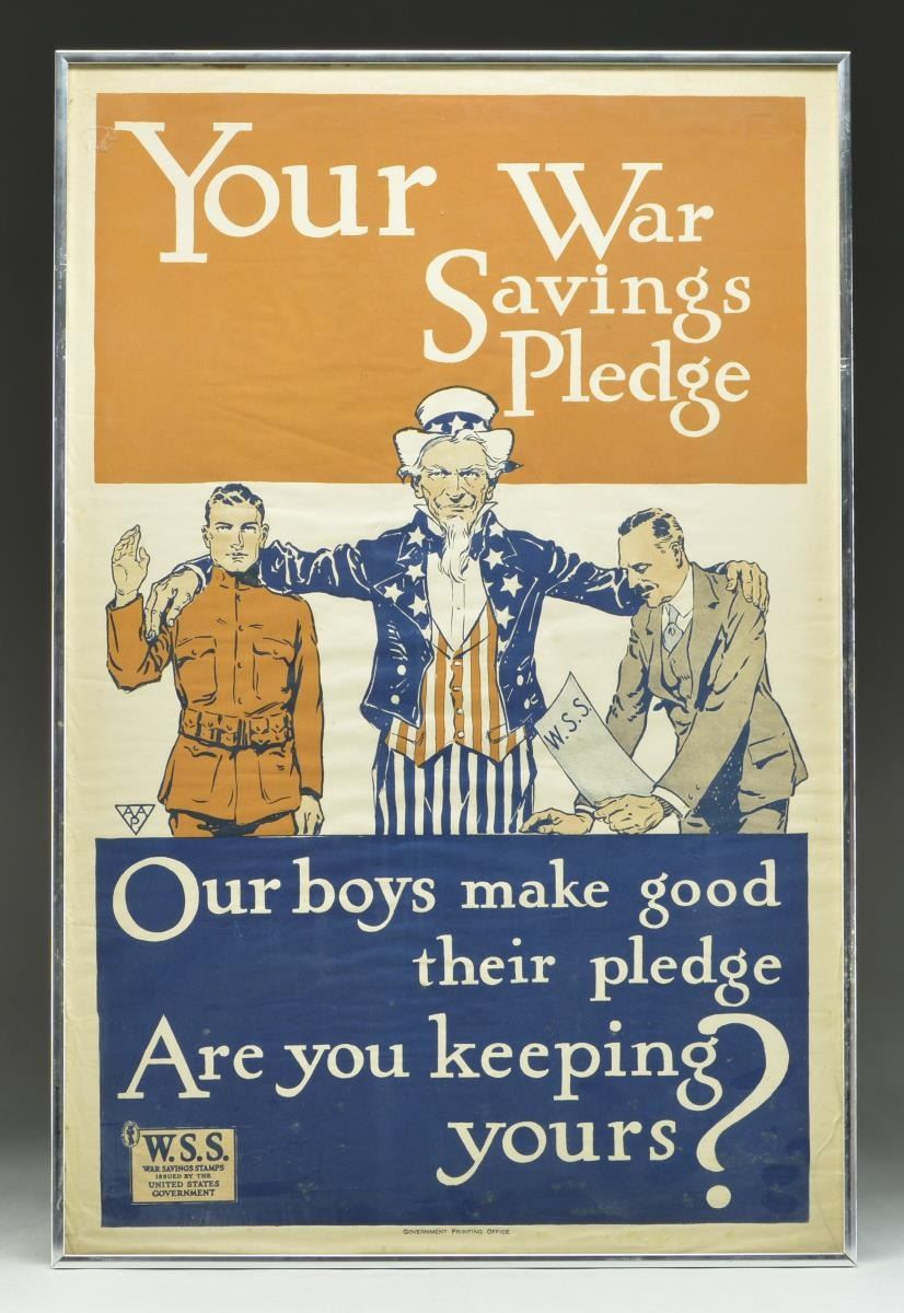 1) This poster by the U.S. Treasury Department is an appeal to the public to continue to purchase the stamps issued by the treasury department to support war efforts. They were available in denominations of $.25 and $5. The $5 stamps earned 4% interest and could be redeemed in 5 years. The picture shows a stern faced Uncle Sam w/ his outstretched arms encompassing a uniformed soldier w/ an upraised right hand & a well dressed business man holding a W.S.S. document. The poster is titled "Your War Savings Pledge" & "Our Boys Make Good Their Pledge Are You Keeping Your?" The polychromatic colors in poster are blue, white & tan & poster has a Boxed W.S.S. War Savings Stamps title. Poster marked at bottom "Government Printing Office". Poster is approx. 21 1/2" W X 32 1/2" L. CONDITION: Poster has very good appearance w/ some light staining, folding & sm. tears near edges. Glass front has approx. 8" crack along the bottom right edge.