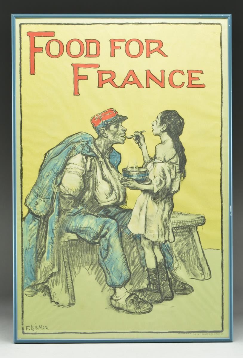 2) Poster entitled "Food for France" showing a French girl feeding soup to a wound French Pouliu. Signed in the lower left corner "F. Luis Mora". Marked in right corner; "THE W. F. POWERS CO. LITHO, N.Y.". Poster has yellow background, red lettering. The figures appear to be a charcoal drawing except the blue uniform & red soldier's cap. Mounted in a blue colored professional frame measuring 20 1/2" W X 30 1/2" L. CONDITION: poster in very good condition but w/ scattered spots of staining & sm. tear in lower left corner.