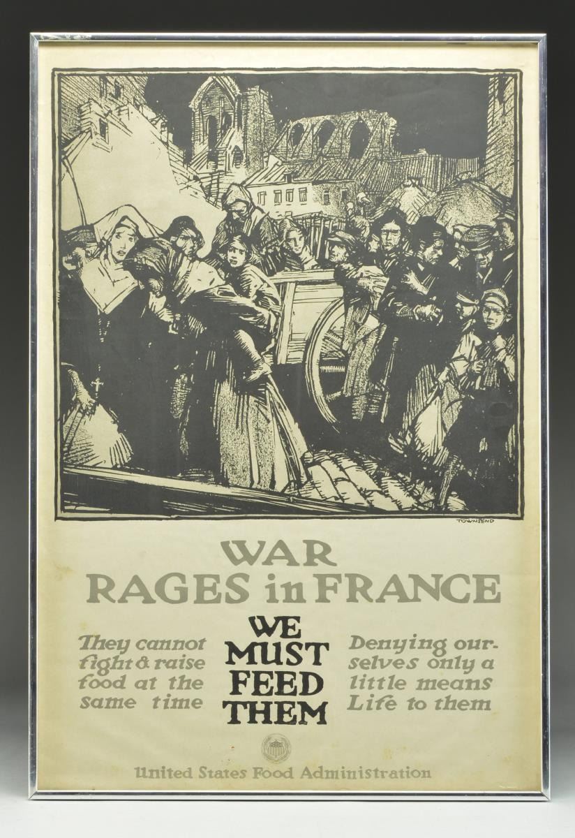4) Heart rending mono chrome poster by the UNITED STATES FOOD ADMINISTRATION entitled "WAR RAGES IN FRANCE" showing a rendering of French refugees of all ages in the shell ruins of a town as they flee to safety. The slogan is "WE MUST FEED THEM". "They can not fight & raise food at the same time / Denying ourselves only a little means Life to them." This poster by Townsend is not marked as to the printing company. Mounted in the silver colored professional frame which measures 20 1/2"W X 30"L. CONDITION: poster is very good condition & legible. Balance of poster has foxing & light stains w/ scattered edge wear.