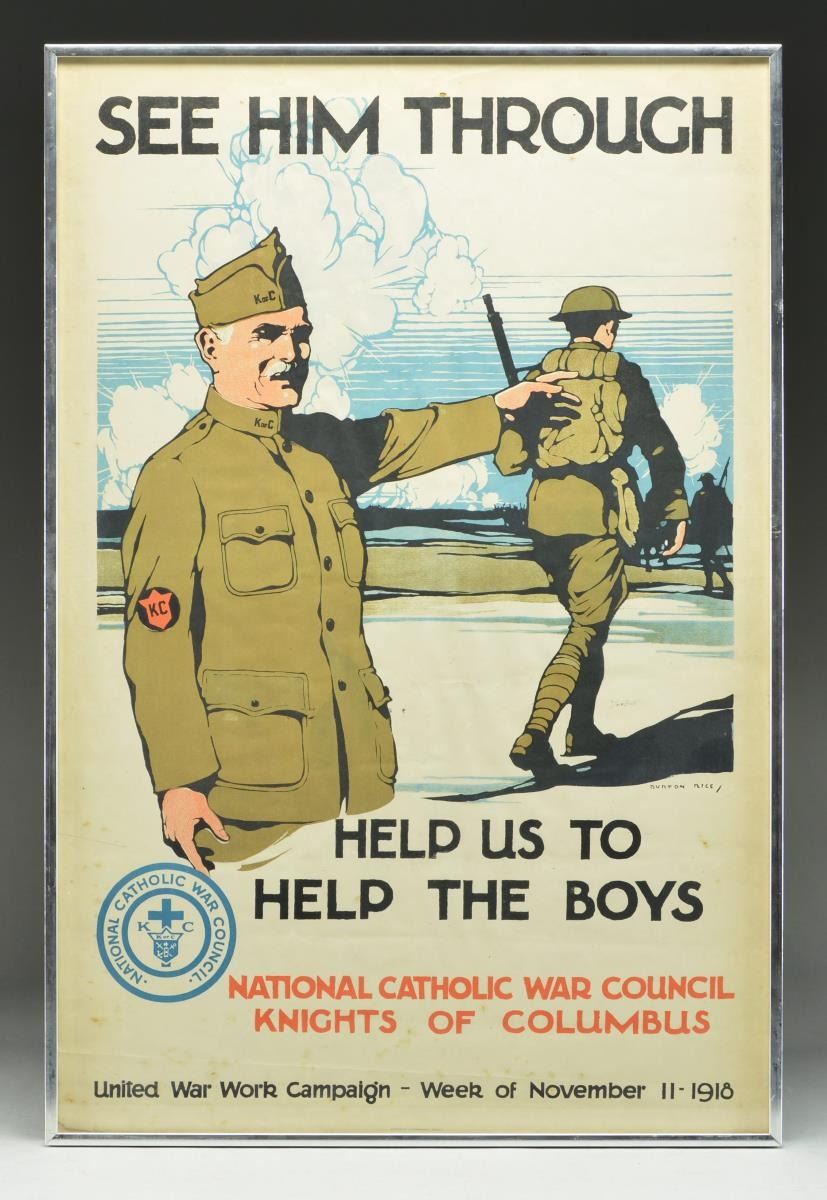 3) An interesting poster from the National Catholic War Counsel / Knights of Columbus showing in a polychrome format an elderly man in a K of C uniform assisting a soldier walking toward the front lines w/ stylized shell bursts. The legend "SEE HIM THROUGH" & "HELP US TO HELP THE BOYS". Also carrying the National Catholic War Council" logo & additionally marked at bottom "United War Work Campaign - Week of November 11-1918". Signed by Burton Rice. Marked at bottom center "AMERICAN LITHOGRAPHIC CO. N.Y.". The poster is mounted in a professional silver colored frame w/ glass front & measures approx. 20 1/2" W X 30 1/2" L. CONDITION: poster has staining in margin areas w/ sm. spots of mildew & folded lower edge.