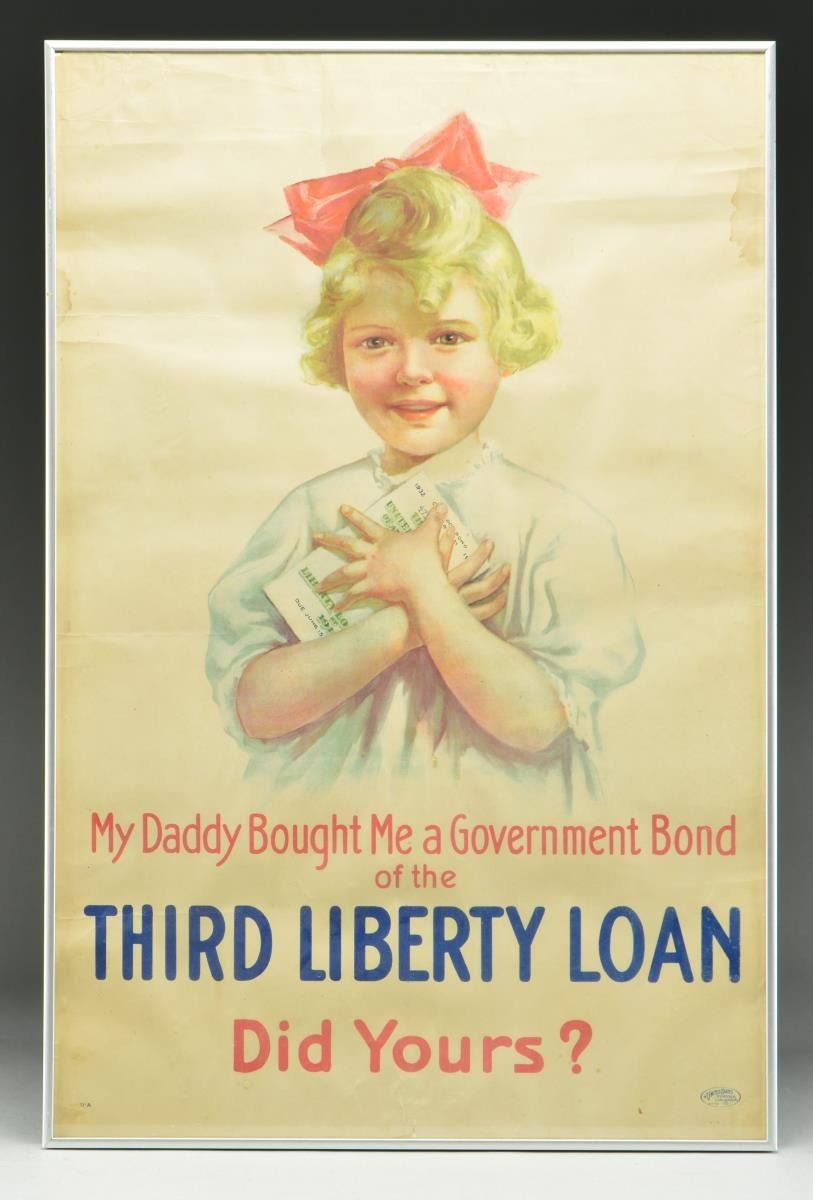 7) 3rd. Liberty Loan polychrome poster showing a blond female child holding a bond coupon w/ the maturity date 1932 visible. The poster is entitled "My Daddy Bought Me a Government Bond / of the / THIRD LIBERTY LOAN / Did yours?" Marked in lower right corner in oval "The UNITED STATES & Printing Lithograph Co. New York.". Poster has professional silver colored metal frame measuring approx. 20"W X30 1/2"L. CONDITION: poster has several sm. tears at the edge w/ foxing & scattered areas of staining. (02-19429-4/RW). $900-1,200.