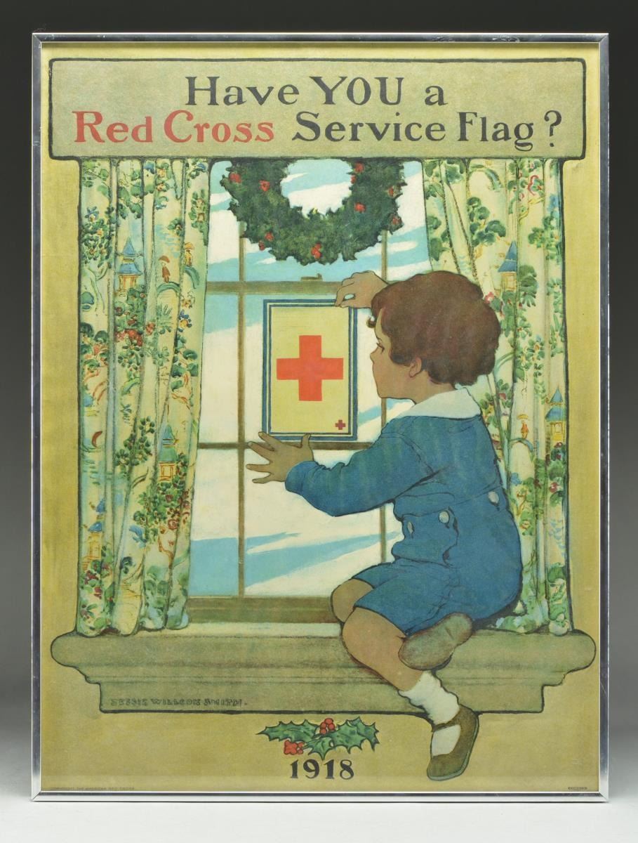 5) Polychrome image of young child installing a red cross service flag in the window of home underneath a Christmas wreath. The colorful view is dated 1918 & the entitled, "Have You a Red Cross Service Flag?" The artist is Jesse Willcox Smith. Poster is marked in the bottom left "Copyright, The American Red Cross" & marked in the bottom right "Forbes, Boston". Poster is mounted in professional silver frame measuring 20 1/2W X 21 1/2" L. CONDITION: poster in very good condition w/ very light edge wear.
