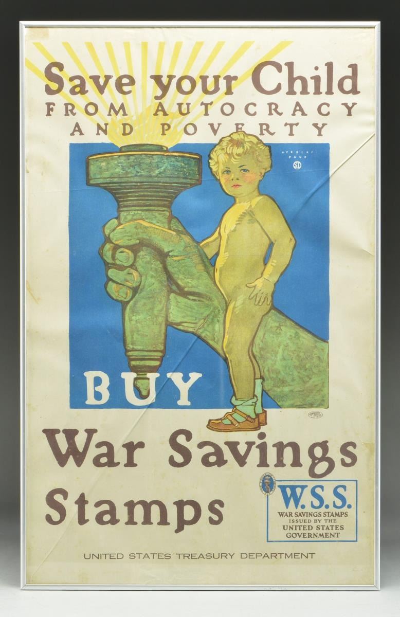 6) "United States Treasure Department' poster promoting the sale of war saving stamps. The poster shows a nude child standing w/ the Statue of Liberty hand w/ torch on a blue background; Poster is titled "Save your Child" / From autocracy / and poverty." and exhorts the public to "Buy War Savings Stamps". It includes the "boxed W.S.S." logo. Mounted in a 19"W X 29 1/2" L silver colored professional frame. CONDITION: glass front has long nearly full length diagonal crack. Poster has light wear and a few sm. tears.