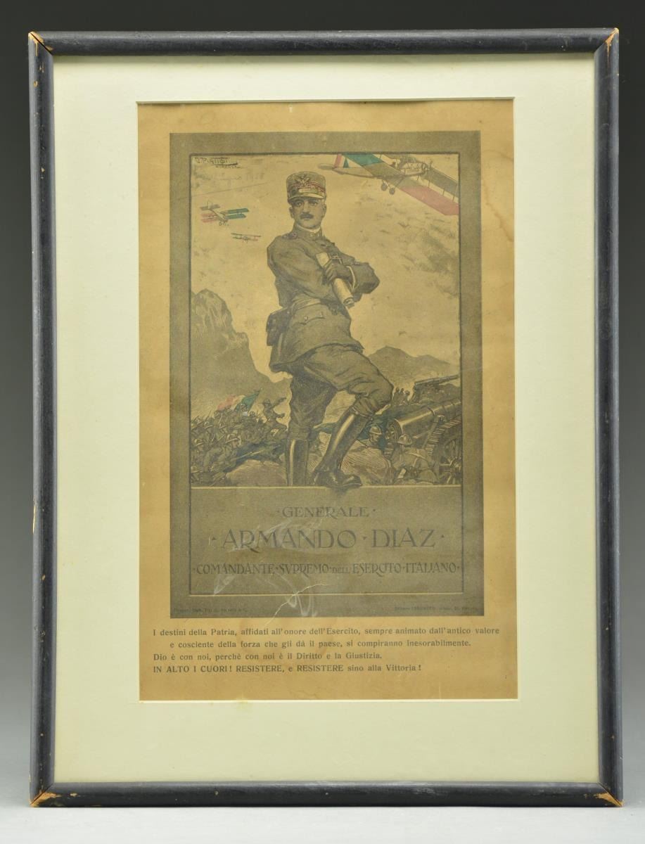 1) Italian patriotic poster showing a posed general names Armando Diaz, Supreme Commander of the Italian Army. The polychrome picture shows the general holding a rolled map in a dramatic pose w/ a background of mountains & showing attacking infantry, heavy artillery w/ air craft over head. All markings are in Italian. The poster is signed at the top left corner, "G. Piattoi" & Firndze". Poster is matted in wooden commercial frame measuring approx 13" W X 17"L. CONDITION: poster has good appearance but spots of light staining throughout; most notable in the margin areas. Frame has worn finish & notably open corners.