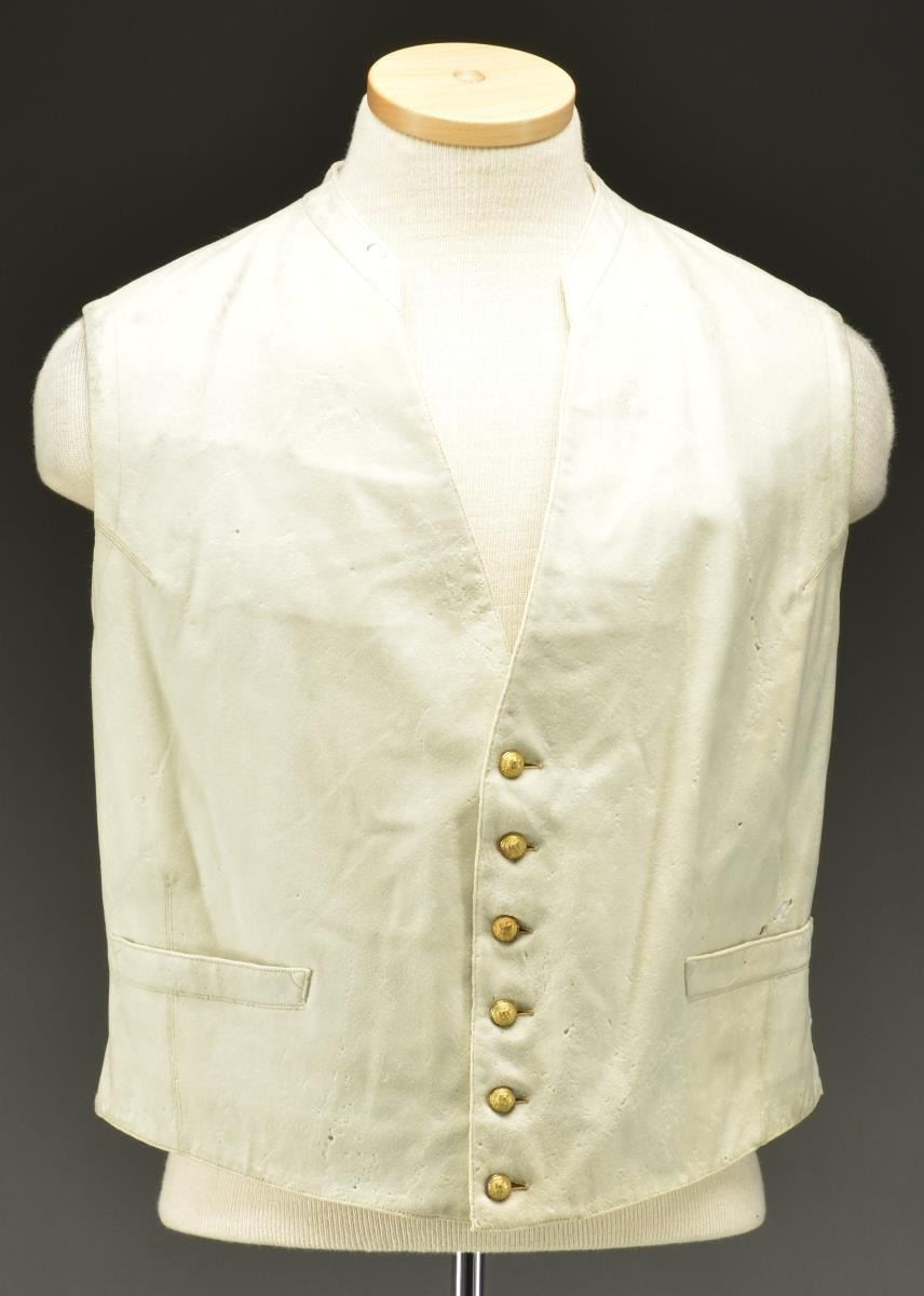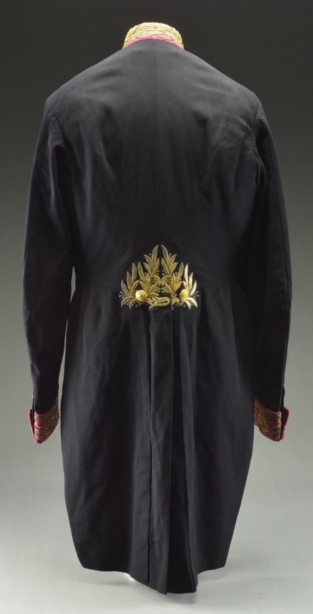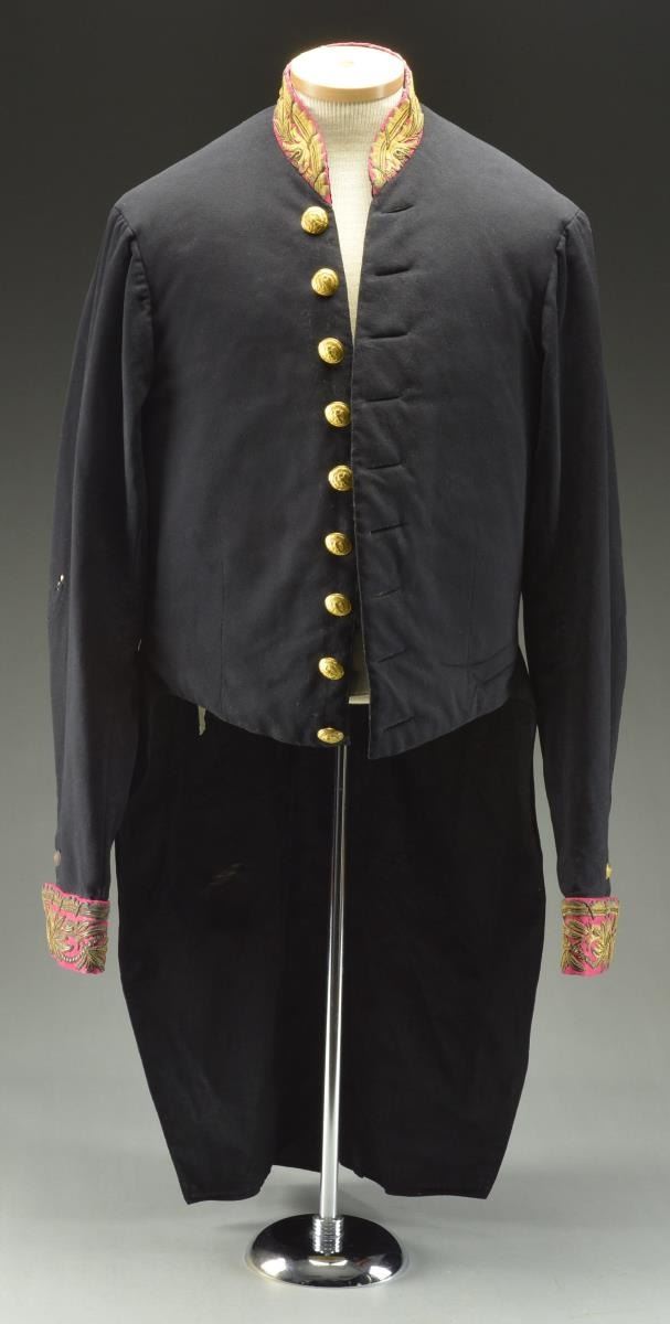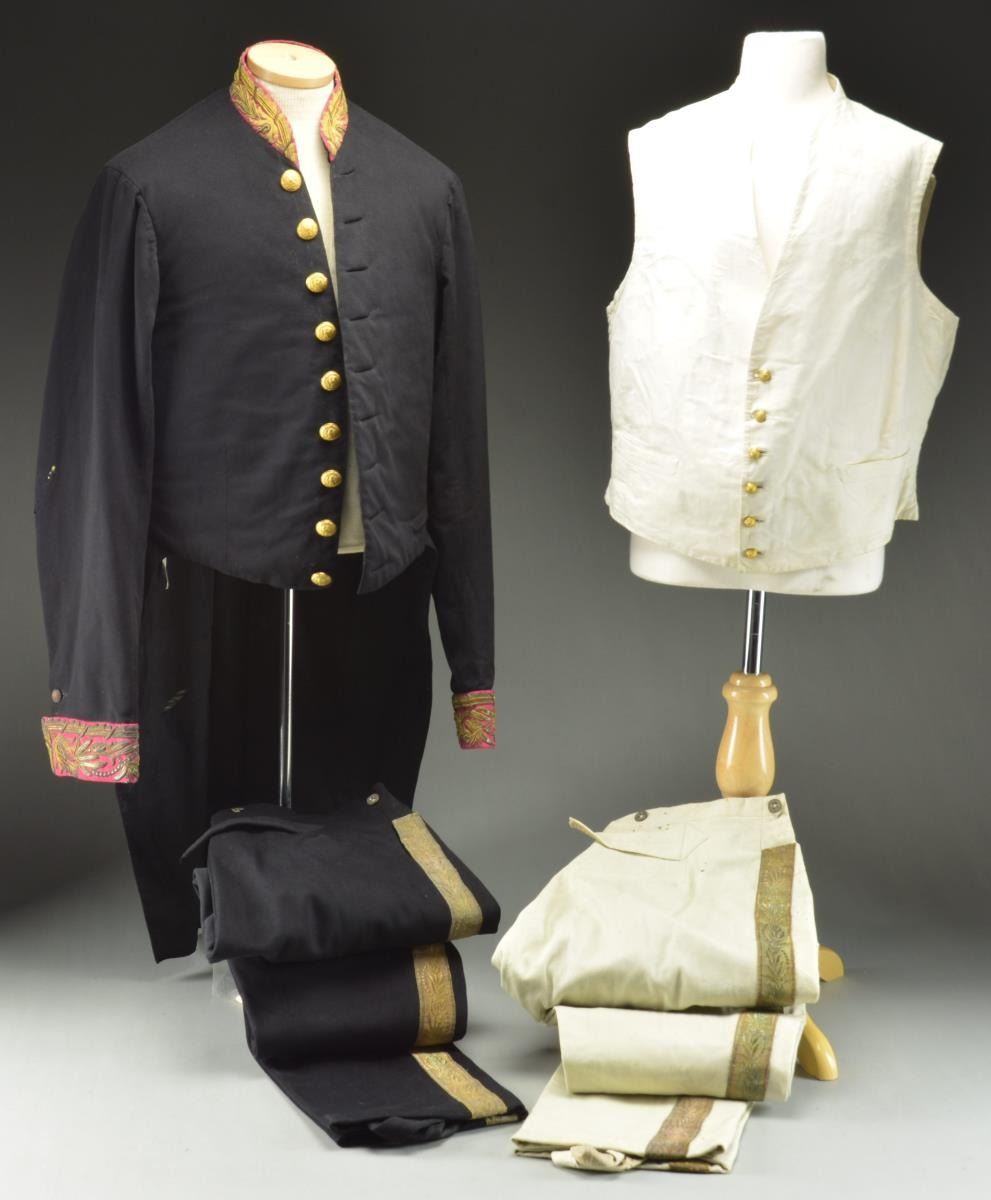 A very attractive uniform in an extremely fine black wool. Collar and cuffs are red with gold bullion foliate decoration. There are 9 heavily gilded French eagle buttons down the front with 2 at the top of the tails. The top of the tails is also decorated in finely executed gold bullion. This beautiful tailcoat comes with a white cotton vest having 6 smaller versions of the coat buttons and there is also a similar wool vest with similar buttons. There are a black pair of pants with 1 1/2" wide gold bullion tape down the outside of each leg and a pair of similar white wool pants with the same bullion trim. The label in the back of the coat reads “Plocq.Freres 10. Rue du 29 Juillet Paris.” CONDITION: the coat shows light wear overall with notable mothing only at the right elbow. Cotton vest shows light wear. Wool vest has several moth tracks. Black pants show light overall wear. White pants have significant moth damage. (02-17882/BF). $800-1,300.