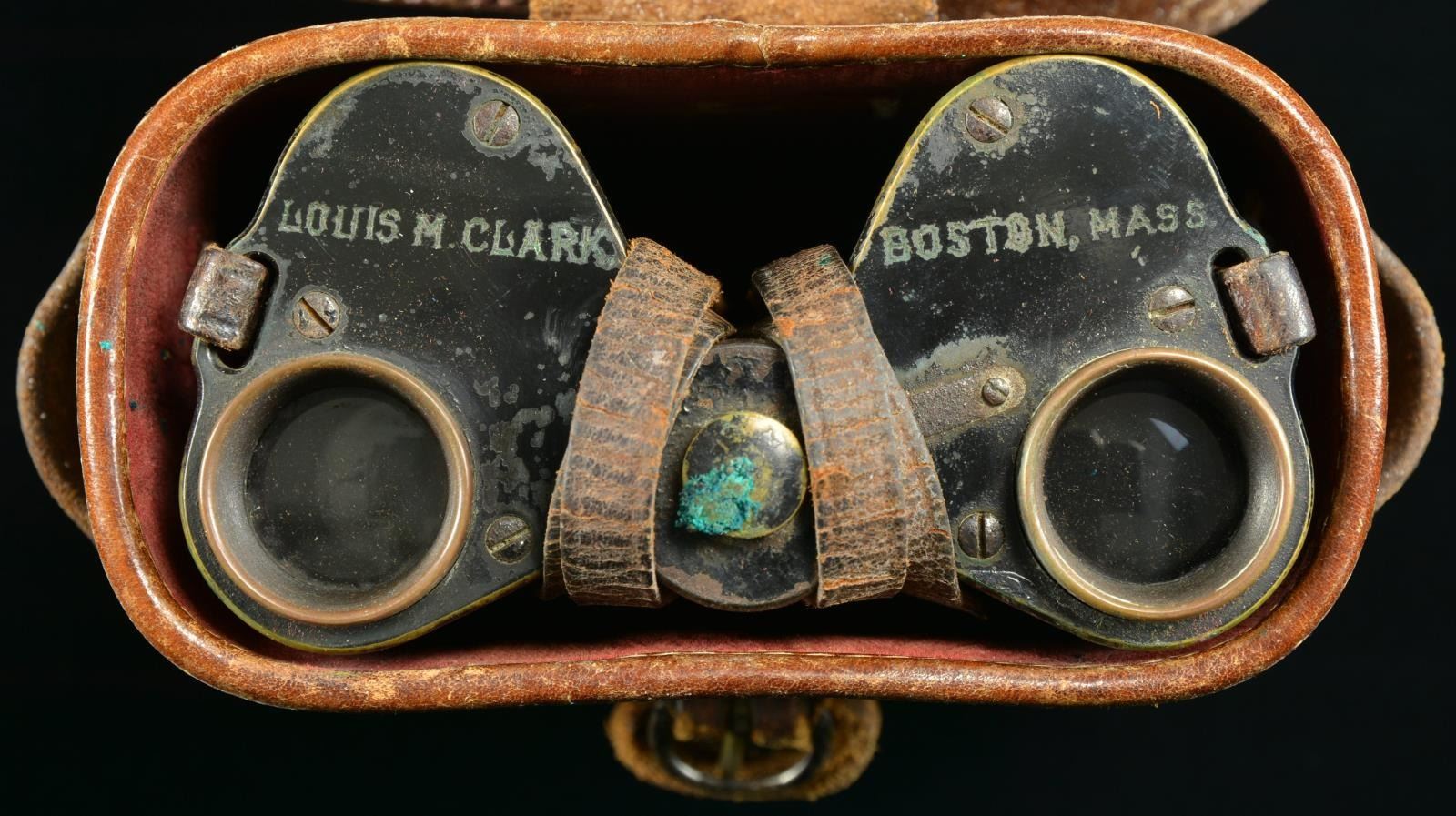 This interesting group includes 1 pair of Civil War era binoculars with “LEMAIRE FABI PARIS” written around the eyepieces. / 1 Pair of brass bodies French binoculars marked “N FRANCE (deer head) U.S.N. NO543”. This pair of binoculars is of an early style and likely dates prior to 1900. / 1 Pair of circa 1890 binoculars with a leather cover over brass and German silver. Binoculars are marked “MADE IN FRANCE”. / 1 Pair of German binoculars in original carrying case. Binoculars are black painted metal with a textured covering. They are marked on the crosspiece “HENSOLDT WETZLAB 38850 Jagd—Dialyt 7X42”. / 1 Small pair of binoculars in their original russet leather case. Binoculars are marked “LOUIS M. CLARKE BOSTON, MASS.” & “8 POWER. Bausch & Lamb Optical Co. New York. Rochester, N.Y. Chicago.” There is a paper tag identifying the owner of these as Andrew H. Addoms who graduated from the Naval Academy in 1914, was a Lieutenant on a sub-chaser in WWI, served on a gun boat in China and was a Captain in WWII. / 1 Pair of circa 1890-1915 binoculars marked on the crosspiece “VERDI PARIS”. Binoculars are housed in their original case. / 1 Pair of circa 1890 binoculars with a leather cover over metal. Binoculars are marked “MADE IN FRANCE” on the crosspiece and the eyecups are marked “SPORTIER PARIS” & “DAY & NIGHT GLASS”. Binoculars are housed in their original case with detached lid. / 1 Pair of US Military binoculars marked “BINOCULAR M1381 6X30” & “THIS INSTRUMENT HAS COATED OPTICS CLEAN LENSES CAREFULLY”. Binoculars have their original carrying case marked “CASE, CARRYING, M17.” CONDITION: binoculars show light to moderate wear on some of the earlier examples. Generally the optics seem fine but have not been cleaned or inspected. (02-17943/BF). $700-900.