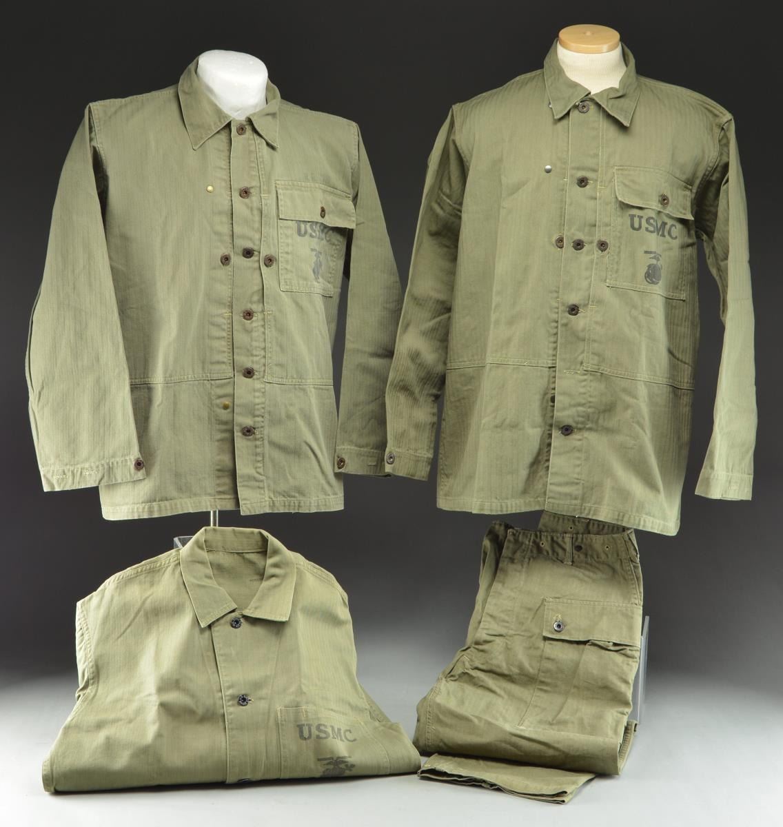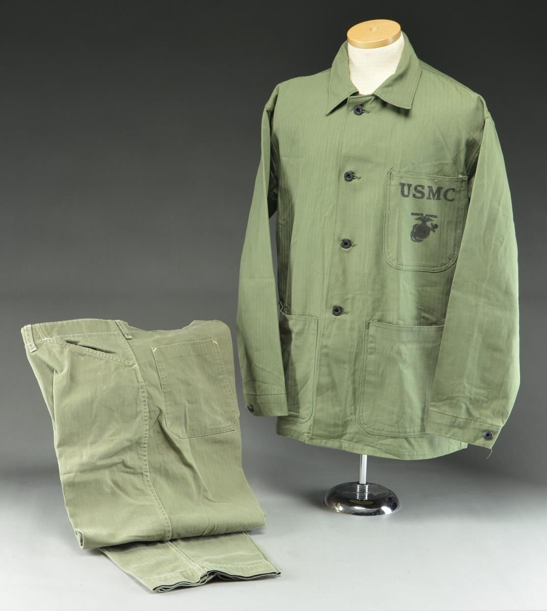 4) 1944. A 1944 pattern sage green utility jacket & pants with “US MARINE CORPS” riveted buttons. Cloth is classic herringbone weave. Inside of collar is stamped “38” and has the 2 riveted buttons as seen in the 1944 pattern. The front left breast pocket is stenciled “USMC (ega)”. CONDITION: jacket & pants both show significant field use but no damage. (02-18113-7/BF). $700-1,000.