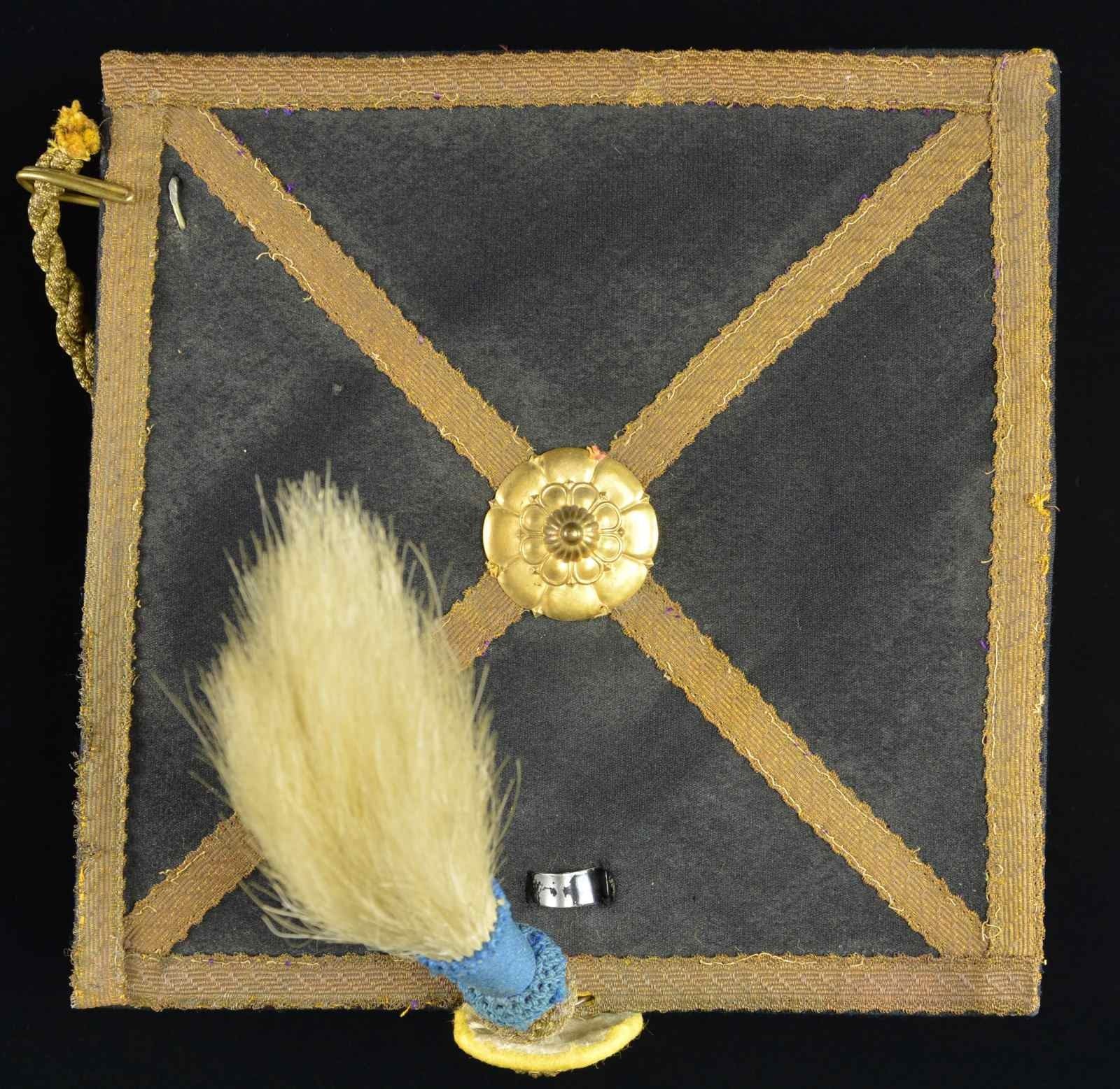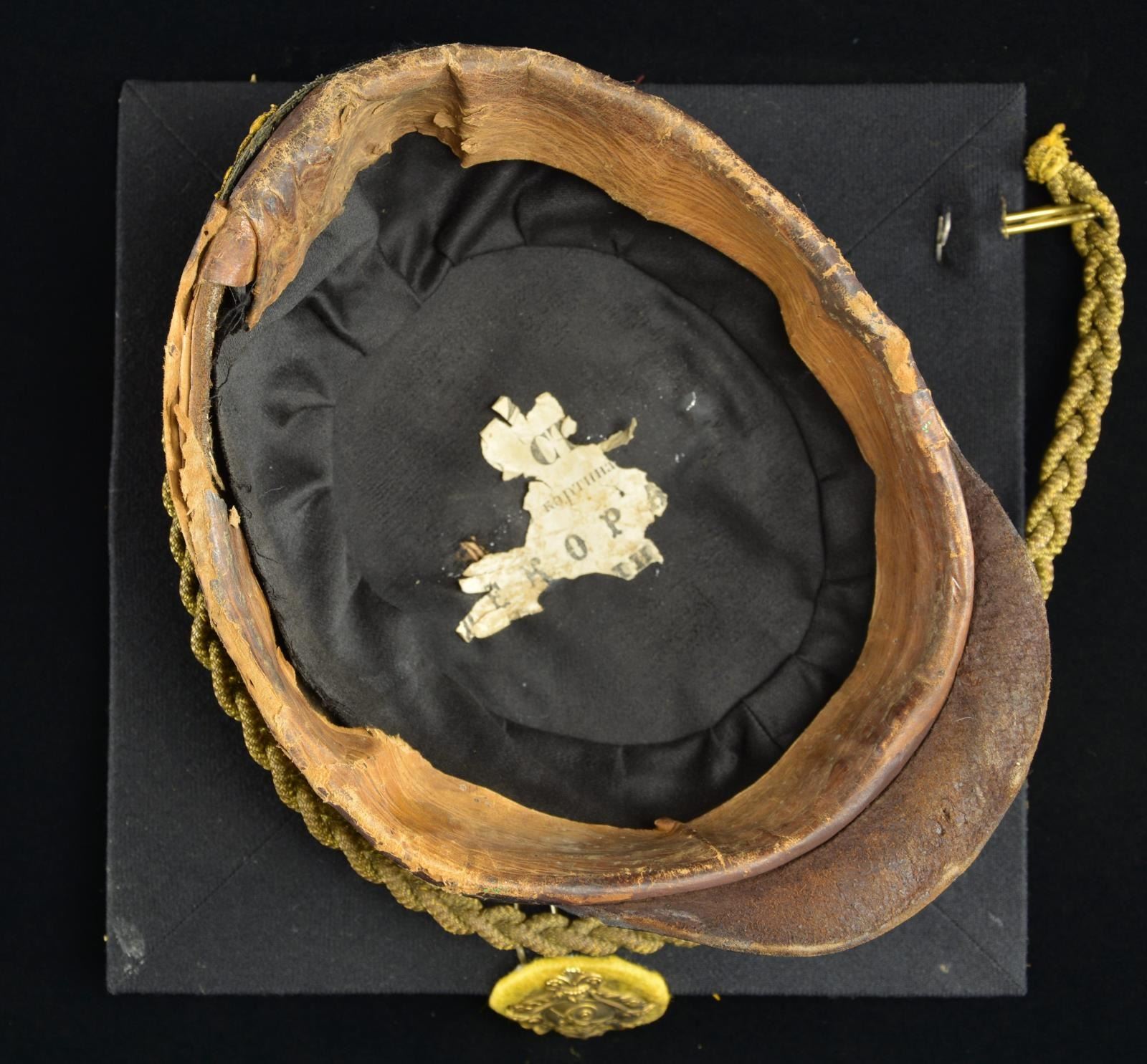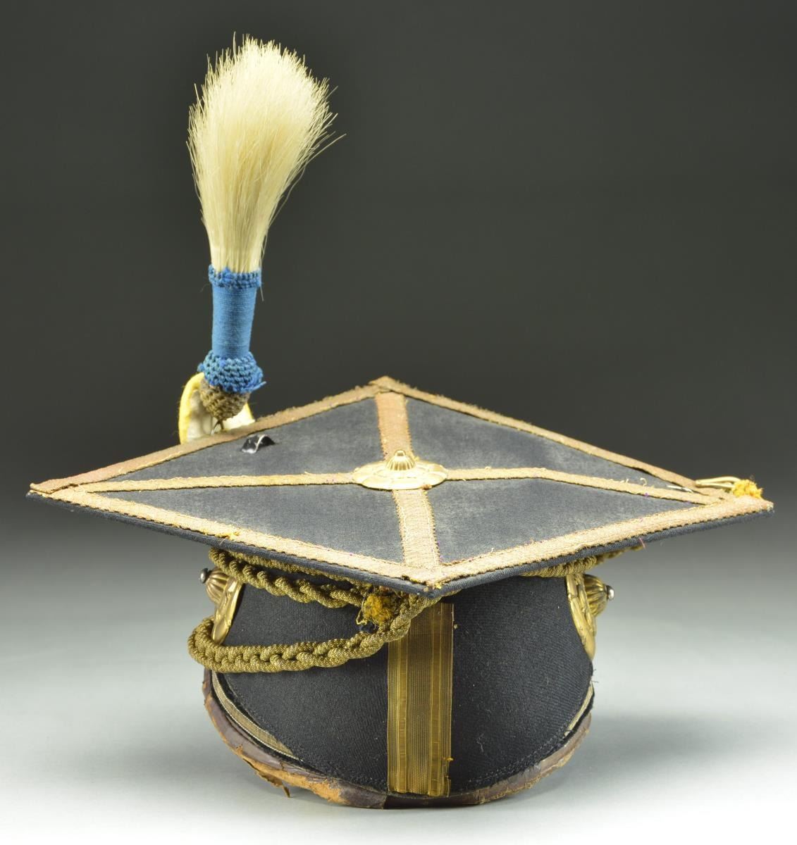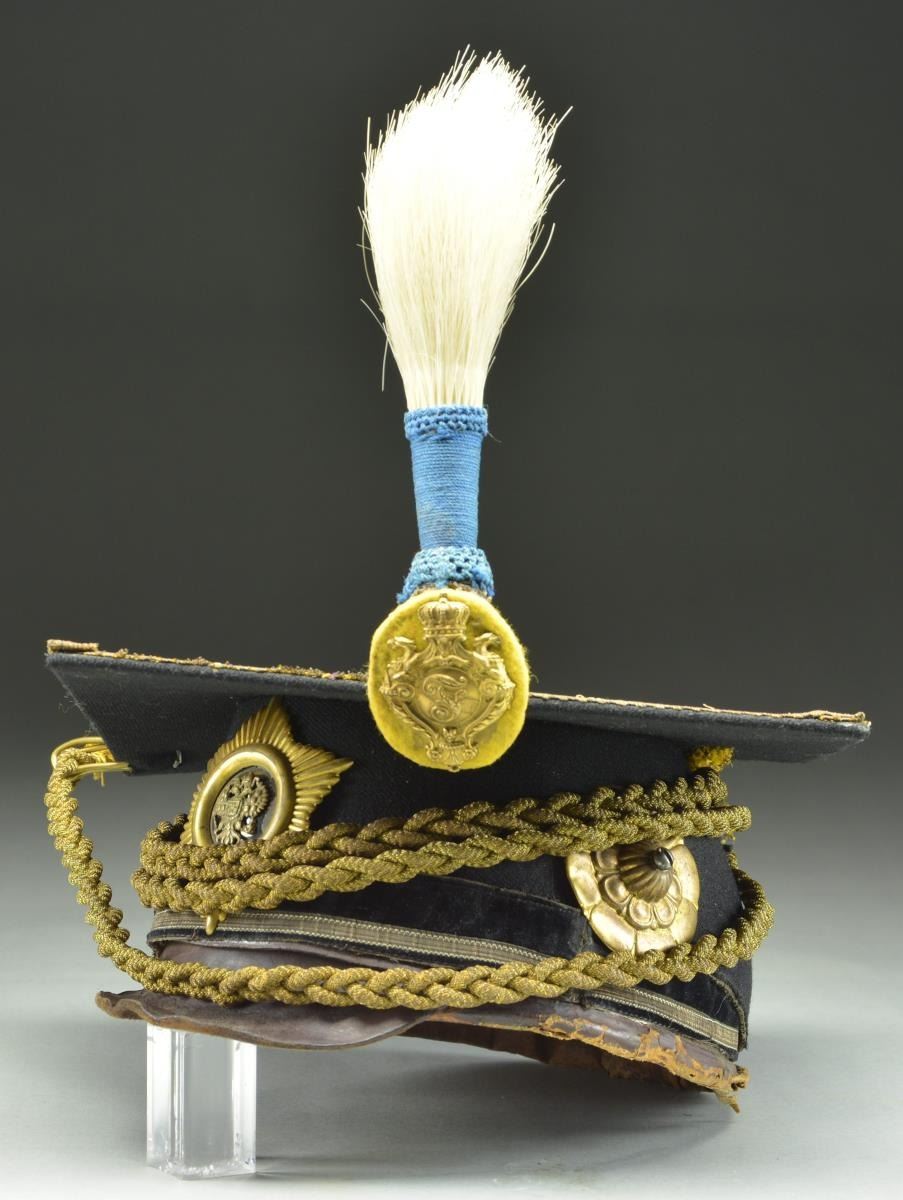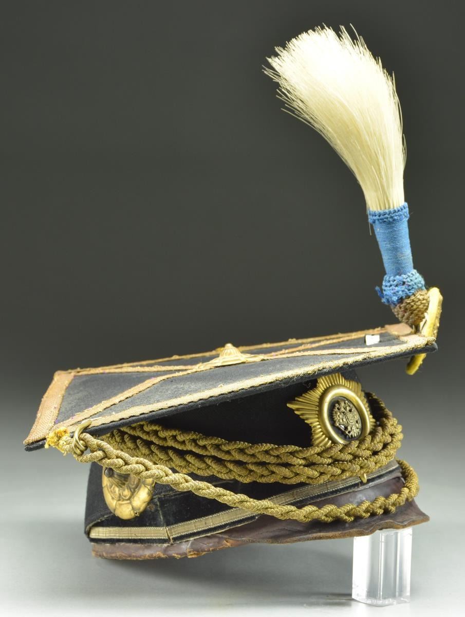 A fine & attractive example of a pre-WWI Russian tschapka. The square crown is bordered & crossed with gold bullion. There is a central medallion & a blue & white plume supported by a yellow-backed royal crest on the front left. The front plate is a 6-pointed multi-rate star with a central Russian eagle. Gold bullion cord runs around the hat twice & across the top. There is a leather visor & sweatband. The interior lining is black silk and there is a partial label. CONDITION: tschapka shows light overall wear. The visor is a bit stiff & dry. Sweatband has some deterioration. (02-19565/BF). $1,200-1,600.