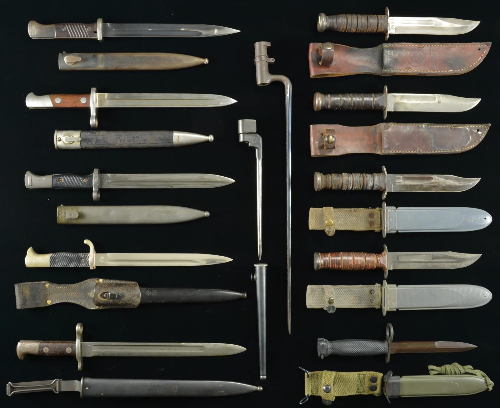 This group of edged weapons includes 1 Spanish M1893 Mauser bayonet with scabbard marked and dated 1905. / 1 US M1892 Krag bayonet with scabbard marked and dated 1897. / 1 Israeli M1949 type 3 Mauser bayonet with scabbard with numerous proof marks. / 1 German M1898 Mauser bayonet with scabbard of the WWII period with matching numbers. / 1 English No.4 MK II spike bayonet and scabbard. / 1 WWII German dress bayonet with scabbard and frog. Frog is marked “GEBR.GRAF 1938 SUCHENHEIM”. / 1 US 45/70 socket bayonet with no scabbard. / 1 U.S.N. MK II combat knife marked “KA-BAR OLEAN, N.Y.” & “USN”. The leather sheath is marked “U.S.N.” at the throat. / 1 U.S.M.C. KA-BAR fighting knife. Ricasso is marked “USMC KA-BAR OLEAN, N.Y.”. Original leather sheath is marked “KA-BAR (ega) USMC”. / 1 U.S.N. MK II combat knife marked on the underside of the cross guard “U.S.N. MK II R.C.C.”. Standard MK II sheath with gray composite body and cotton web belt loop. / 1 U.S.N. MK II combat knife marked on the underside of the cross guard “USN MK II KA-BAR”. Standard MK II sheath with gray composite body and cotton web belt loop. / 1 US M7 bayonet for the M16 rifle. Bayonet is marked on the underside of the guard “US M7”. Standard U.S. M8A1 sheath with cotton web belt loop. CONDITION: all knives and bayonets show light to moderate wear and are complete except as noted. (02-17932/BF). $800-1,300.
