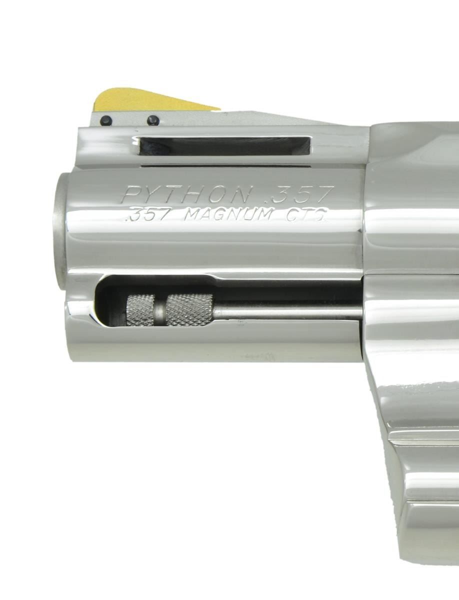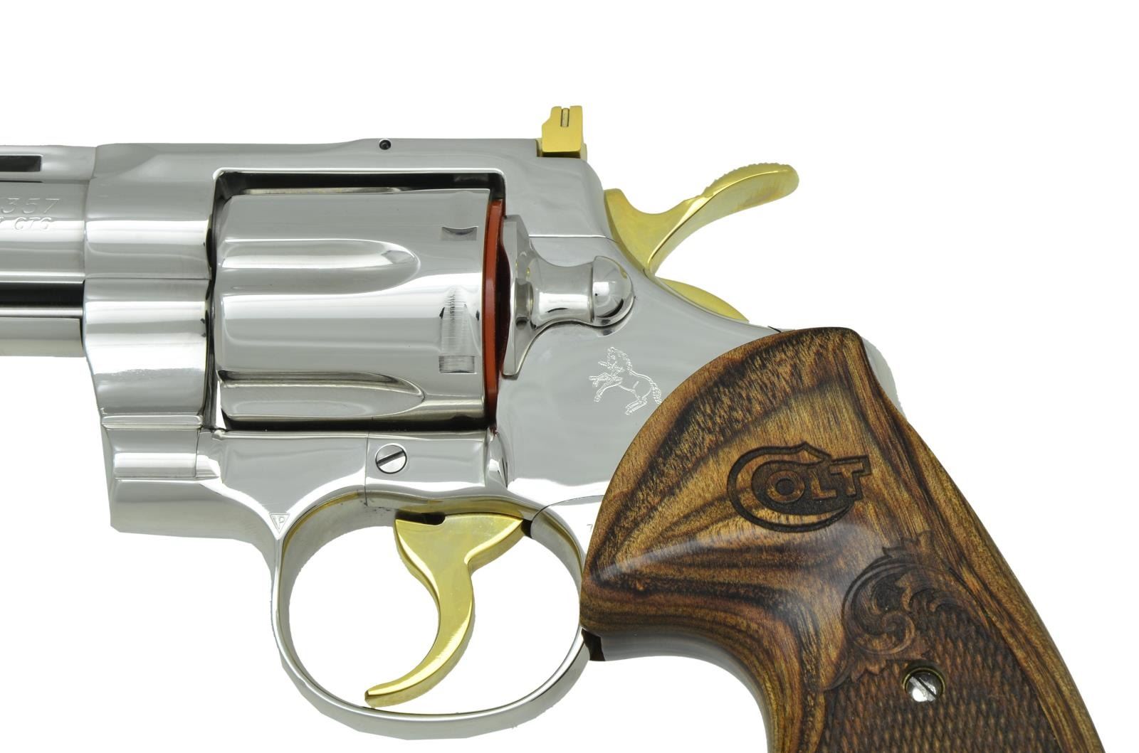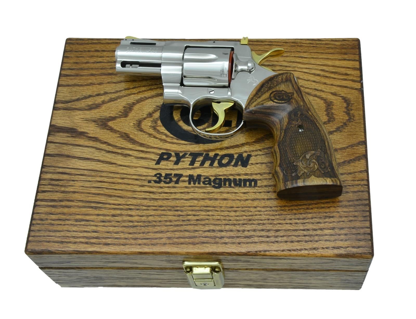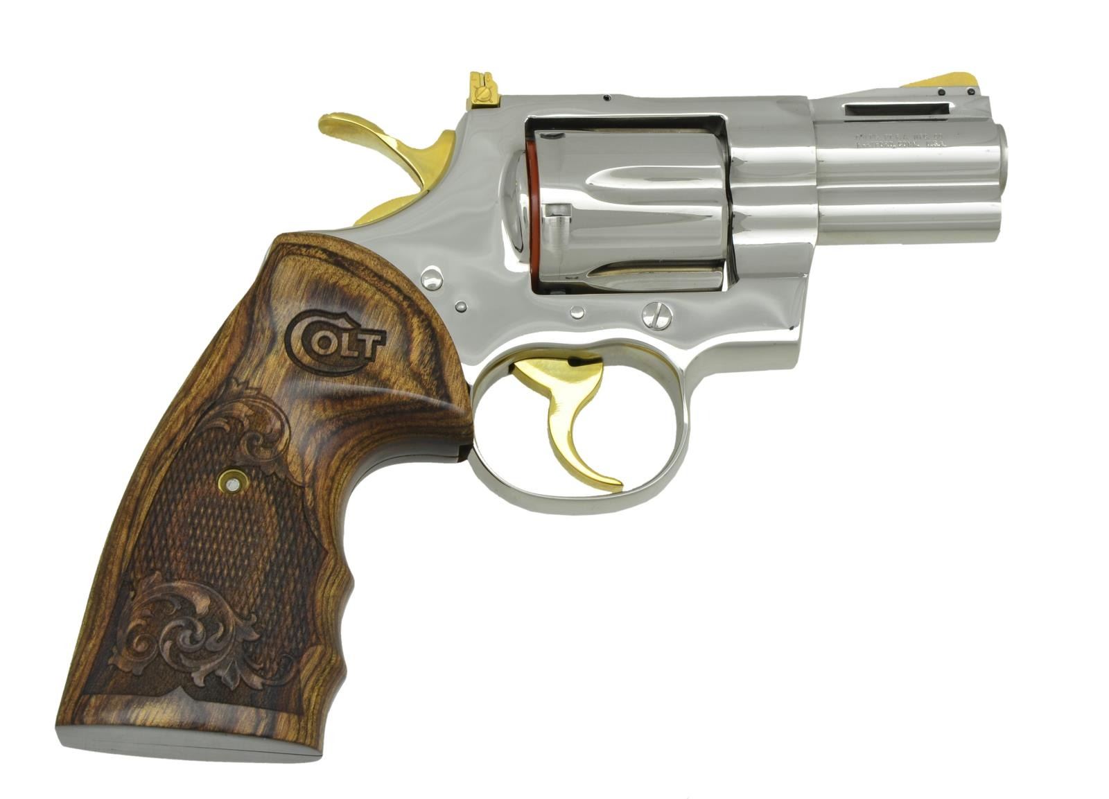 COLT PYTHON. Cal. 357 Mag. S# 13311EH. Bbl. 2-1/2” with ventilated rib and full lug. Balance of metal is nickel plated with 24 karat gold plated serrated ramp front sight, adjustable square notch rear sight, hammer & trigger. 6-shot fluted cylinder. 2-piece checkered laminated walnut finger groove Custom Shop grips. UNATTACHED ACCESSORIES: matching numbered hinged hardwood case with blue velvet interior containing manual. CONDITION: all aspects near excellent; appears new & unfired. (23-808/BH). MODERN. $5,000-7,000.