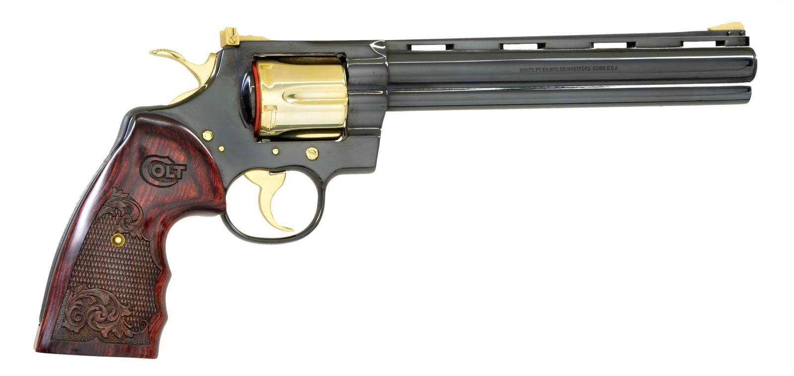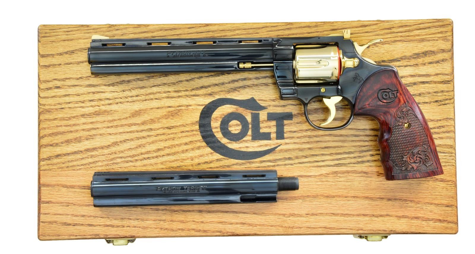PYTHON WITH EXTRA TARGET BARREL. Cal. 357 Mag. S# K19297. Bbl. 8” with ventilated rib & full lug. High polish blued metal finish is tastefully accented with gold plated sights, hammer, six shot fluted cylinder, ejector rod, cylinder latch plus all visible screws & pins. Serrated ramp front sight. Fully adjustable gold plated square notch rear sight. Checkered 2 piece finger groove laminated rosewood Custom Shop grips. UNATTACHED ACCESSORIES: hinged walnut case with blue velvet interior. 8” Python Target 38 Spl. Bbl. 2 Manilla envelopes containing Python front sight, front sight pins & Colt screwdriver / sight tool. CONDITION: all aspects near excellent, appears new & unfired. (23-831/BH) MODERN. $3,000-5,000.