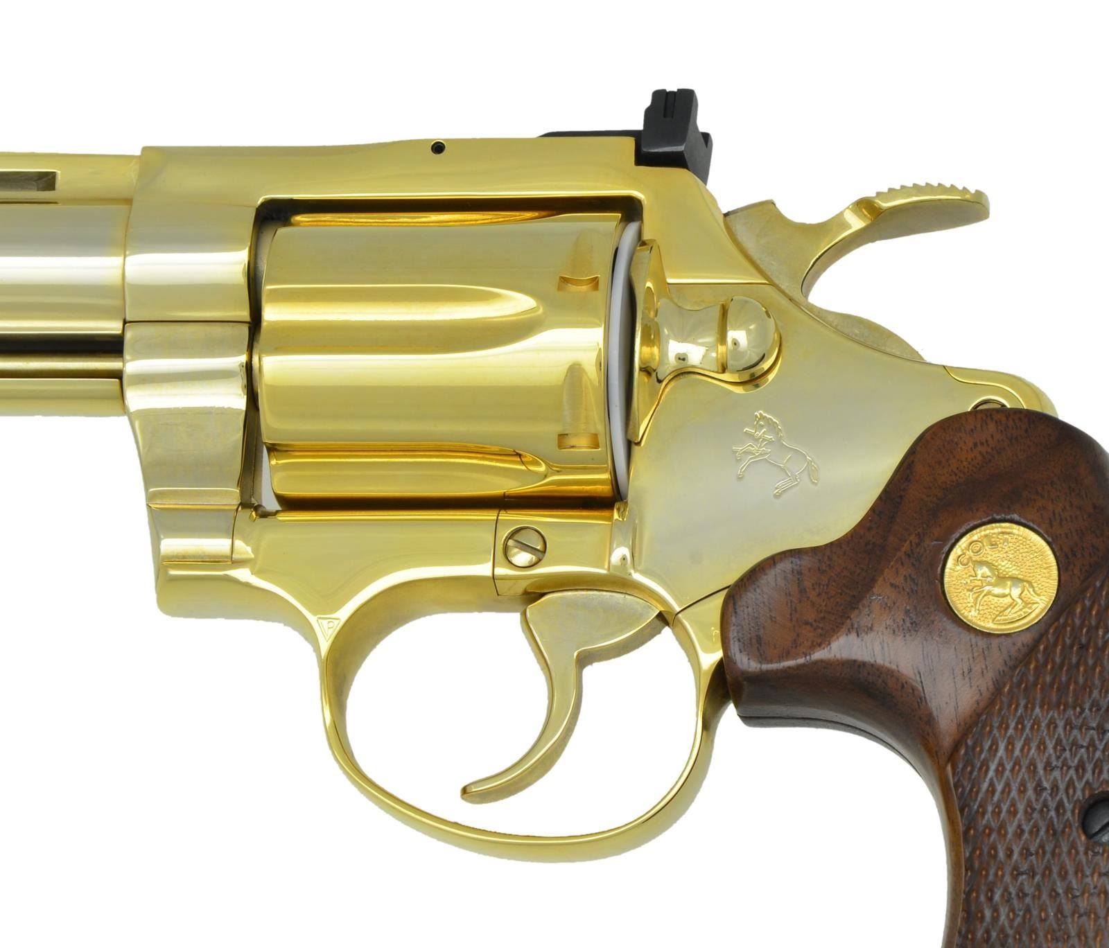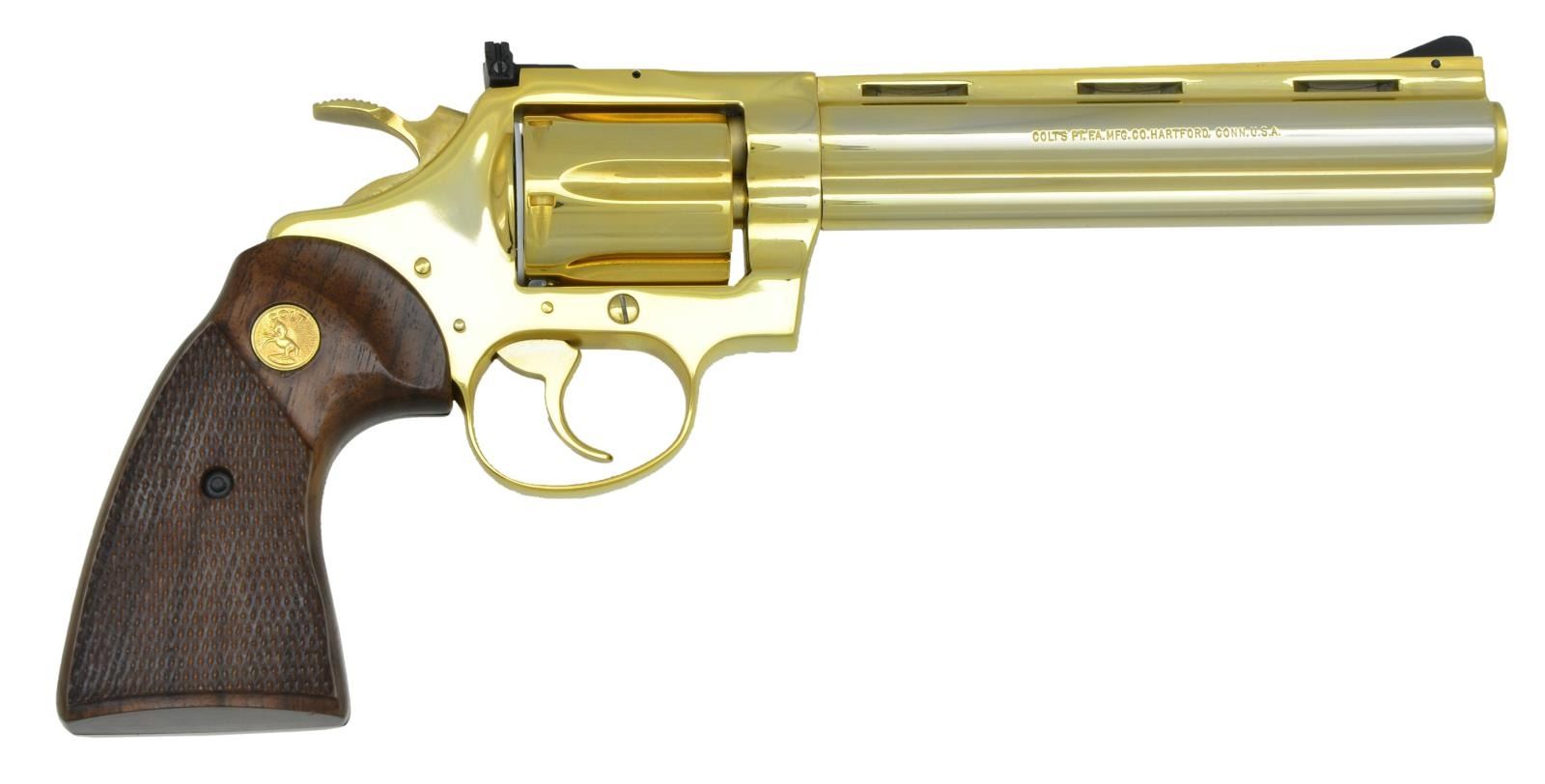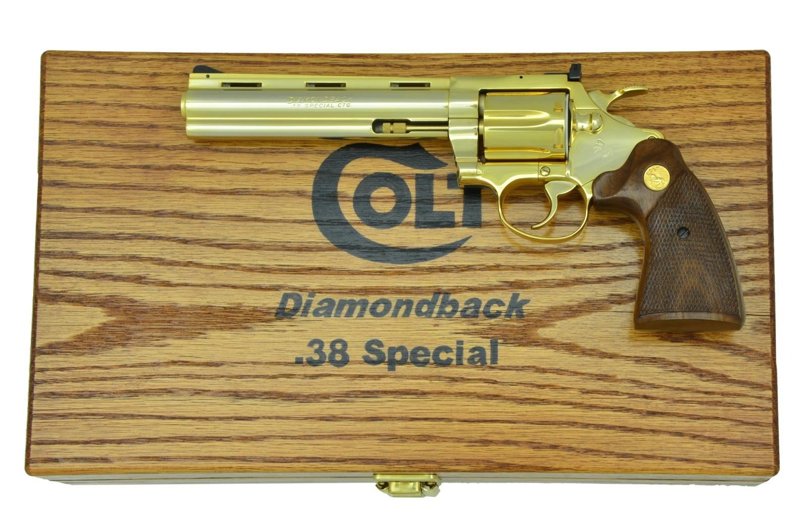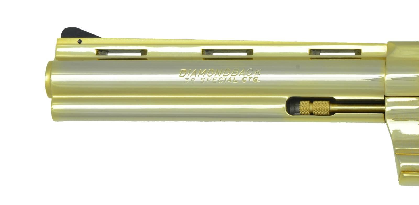 DIAMONDBACK DA REVOLER. Cal. 38 Spl. S# S63968. Bbl. 6” with ventilated rib and full lug serrated ramp front site. Square notch adjustable rear sight. Six shot fluted cylinder. 24 karat gold plated finish on all metal surfaces. 2 piece checkered walnut grips with Colt medallions. UNATTACHED ACCESSORIES: Colt custom shop hinged hardwood case with purple velvet interior containing key. Case has label serialized to gun. Label also states “Diamondback 6” .38/ “24 KT. Gold plated “/ custom shop black buffalo grips”. CONDTITION: all aspects near excellent; appears new & unfired. (23-830/BH). MODERN. $3,500-5,000.