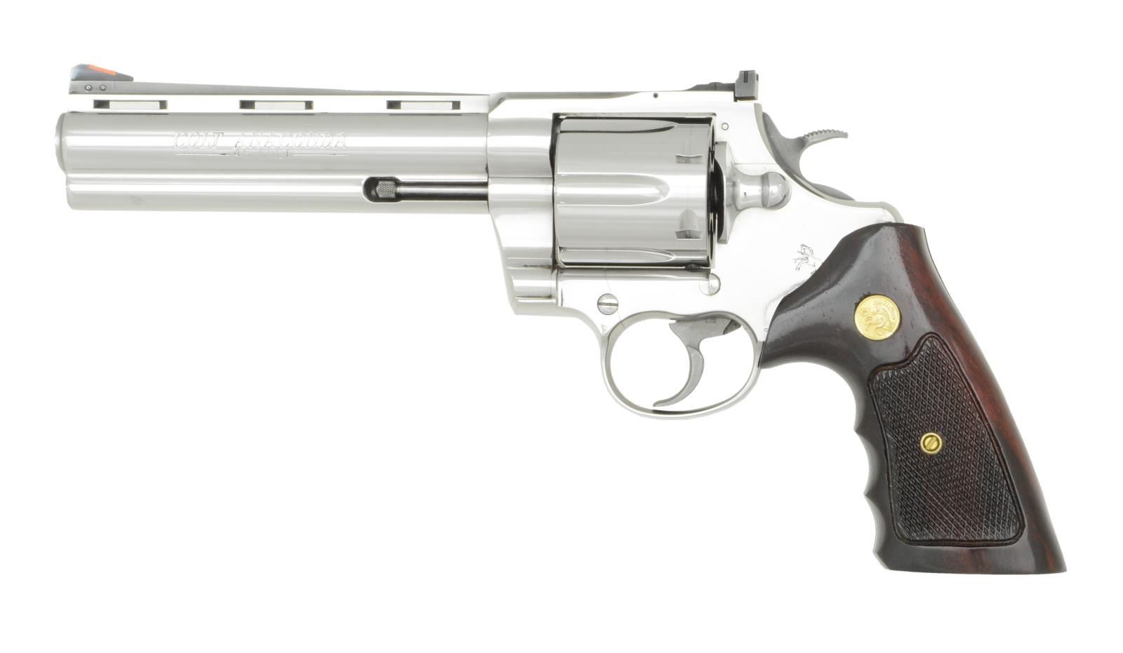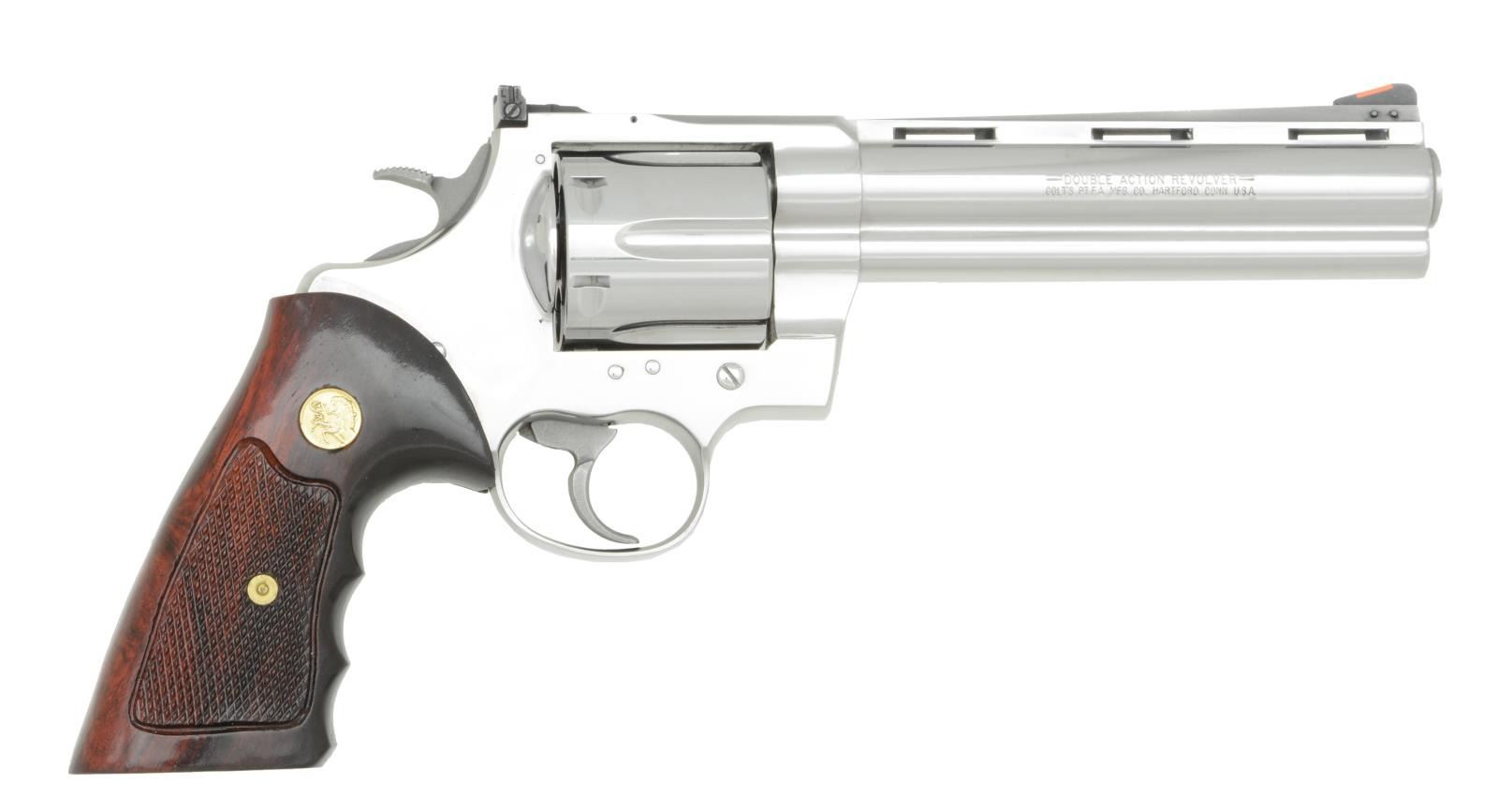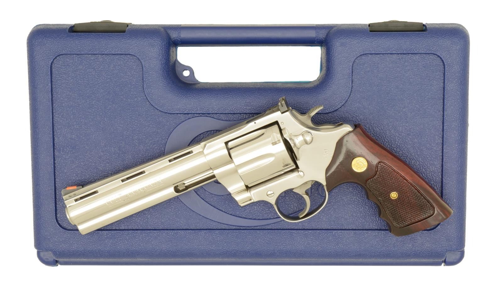Cal. 45 Colt. S# MM61241. Bbl. 6" VR having orange insert blued blade & full lug. Mfg. 1994 (1990-1999) in rare cal. offering w/ white outline Accro rear sight & bright polished finish. Matte finished top of bbl. & frame, w/ wide trigger & tear drop shaped hammer; both grooved. Aftermarket dark rosewood appearing grips (very slight looseness) w/ finger grooves & gold Colt medallions. UNATTACHED ACCESSORIES: matching numbered Colt blue plastic case w/ packaging. CONDITION: very faint cyl. turn line, all other aspects near excellent including bore. (23-815/NW). MODERN. $2,000-2,750.