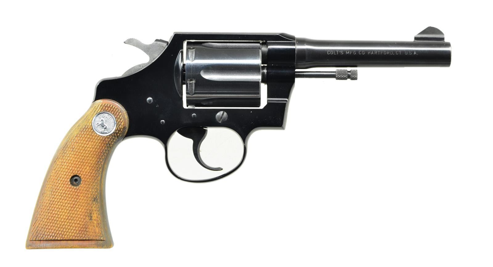 Cal. 38 Spl. S# 49083LW (1956). Bbl. 4" w/ open sights. 6 Shot fluted cyl. Blued finish. 2 Piece square butt checkered grips w/ Rampant Colt medallions. UNATTACHED ACCESSORIES: Colt zippered rug. CONDITION: Near excellent blue w/ light scratches & cyl. turn line. Very good grips w/ a couple of notable gouges. Near excellent bore. (23-804/MD). CURIO. $700-1,000.