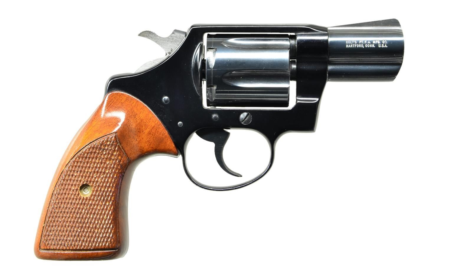 Cal. 38 Spl. S# M61513 (1975). Bbl. 2 1/8" w/ open sights. 6 Shot fluted cyl. Blued finish; markings have added white highlight. 2 Piece checkered bordered walnut grips. UNATTACHED ACCESSORIES: Colt style wood grain box w/ missing end label. Box contains styrofoam inserts, paperwork & 2 piece laminated wood grips w/ gold Colt medallions. Box in fair condition showing wear, tears, tape repairs & detached side flap. CONDITION: Near excellent metal finish w/ light marks & cyl. turn line. Near excellent grips. Near excellent bore. (23-807/MD). MODERN. $700-1,000.