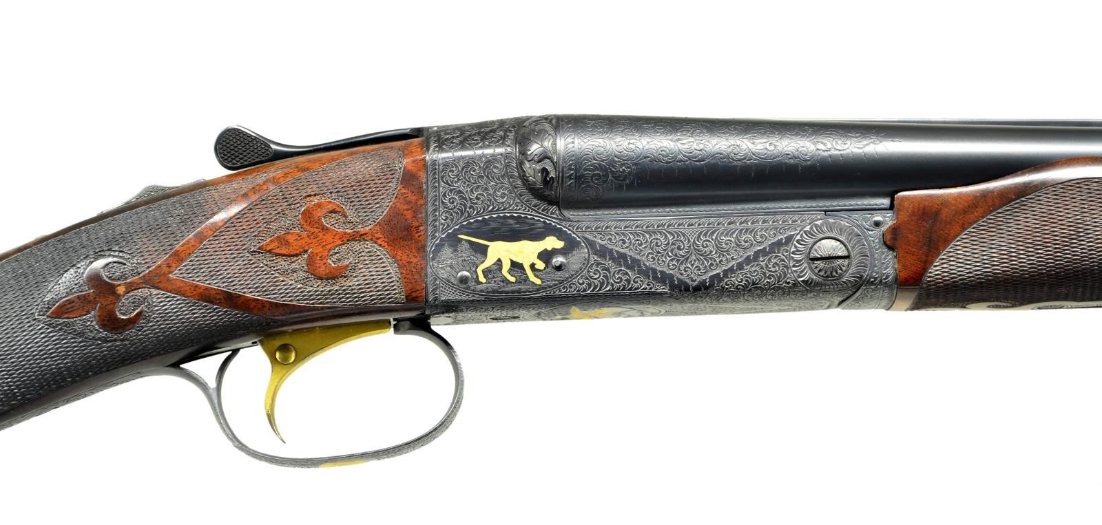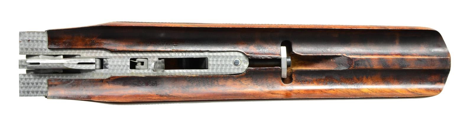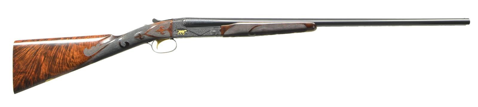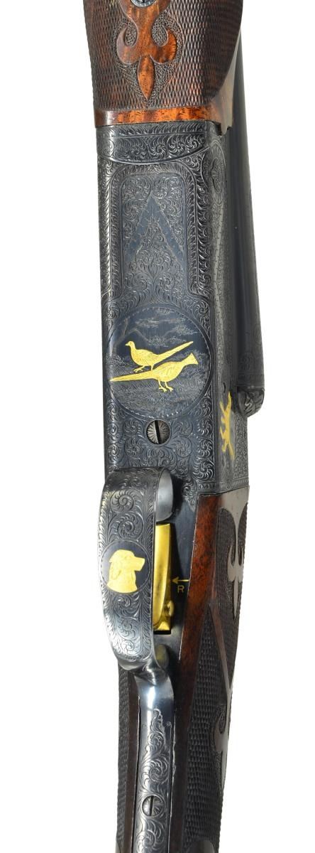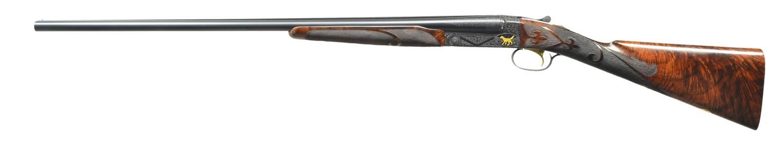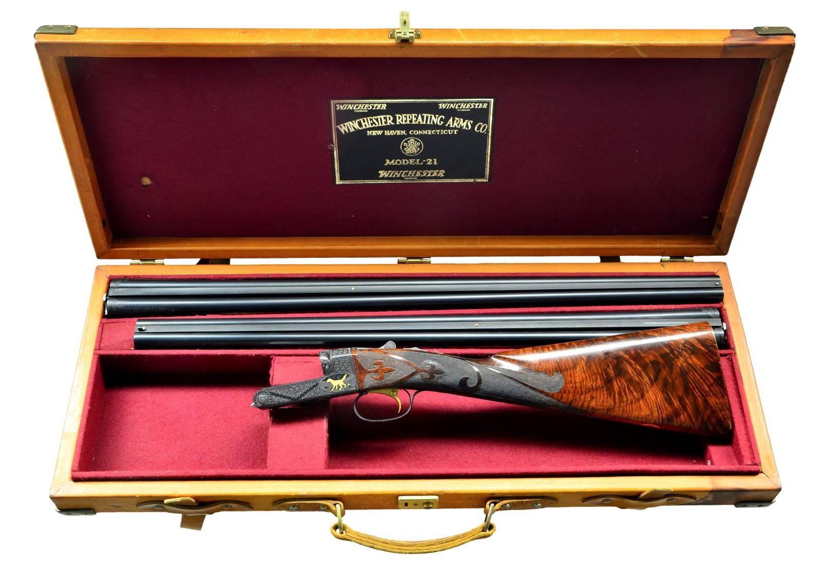 DOUBLE SHOTGUN WITH TWO BARREL SETS AND ORIGINAL CASE. Cal. 20 Ga., 3". S# W32312 (1974). Both barrel sets, one 26" the other 28", are fitted with matted game ribs engraved "CUSTOM BUILT BY WINCHESTER" in milled out portion of ribs. Breech ends are engraved with 3" triangles of scroll. Engine turned barrel flats are stamped with S#, gauge and chamber info. Bottoms of 26" barrels are marked "WS-1" & "WS-2". 28" barrels are marked for IC & MOD. Blued flatsided small size model 21 action features non automatic safetys ("SAFE" inlaid in gold) and goldplated single selective trigger. Action is engraved and gold inlaid in usual Grand American Style with near full coverage varying size scroll within line and feather borders. This scroll surrounds gold inlaid bird and dog scenes with setter on left side of action and pointing pointer on right. A pair of pheasant on ground under a tree are in circular vignette on trigger plate. The portrait of a spaniel is on trigger guard bow. Fences are semi relief carved with oak leaves. Wonderfully crotch figured American walnut straight grip buttstock measures 14" over checkered wood butt and is "B" carved with fleur de lis in checkering which also has fluroishes into butt. A gold oval on toeline is engraved "NEJ". Matching braced beavertail ejector forends with inlet ebony tips and engine turned internals have usual "J" are spring release with knurled roller secondary latch. Wood of forends is not numbered. Irons are stamped "1" & "2" on tips matching numbers on loops. MEASUREMENTS: 26" BBLS: Bore Diameter: L .614". R. .614". Restriction: L .005" (IC). R .007" Flare (skeet). Wall thickness: L .021". R .017". WEIGHT: 6 lb. 4 oz. 28" BBLS: Bore Diameter: L .614". R .614". Restriction: L .020" (Mod). R .010" (IC). Wall thickness: L .030". R .029". STOCK: DAH: 2 5/16". DAC: 1 5/8". CAST: about 1/8" off. LOP: 14". WEIGHT: 6 lb. 9 oz. UNATTACHED ACCESSORIES: gun and extra barrels are housed in what appears to be its original leather case with brass corners, lined in burgundy cloth. A leather Winchester label is in lid. Case contains 2 piece rosewood and brass cleaning rod with mop, brush & jag in black leather case, and some cleaning rags. Factory letter. CONDITION: very fine as refinished most likely by factory. Barrels retaining nearly all their reblack, there is some light subsequent silvering on top lever and safety button. Stocks retain most of a light oil refinish with one or two bumps and marks. Checkering shows light wear and darkening and has not been recut. Bores are bright and shiny without noted problems, mechanically fine. Case leather shows some water staining, straps and handle are good, interior has some rubs through and light soiling, label has some bumps. PROVENANCE: a factory letter to Ed Ulrich 1996 with extract of original records confirming two barrel sets, chambers, ribs and straight grip, with final inspection date of March 6, 1974. (22-5859/MGM). MODERN. $12,000-18,000.