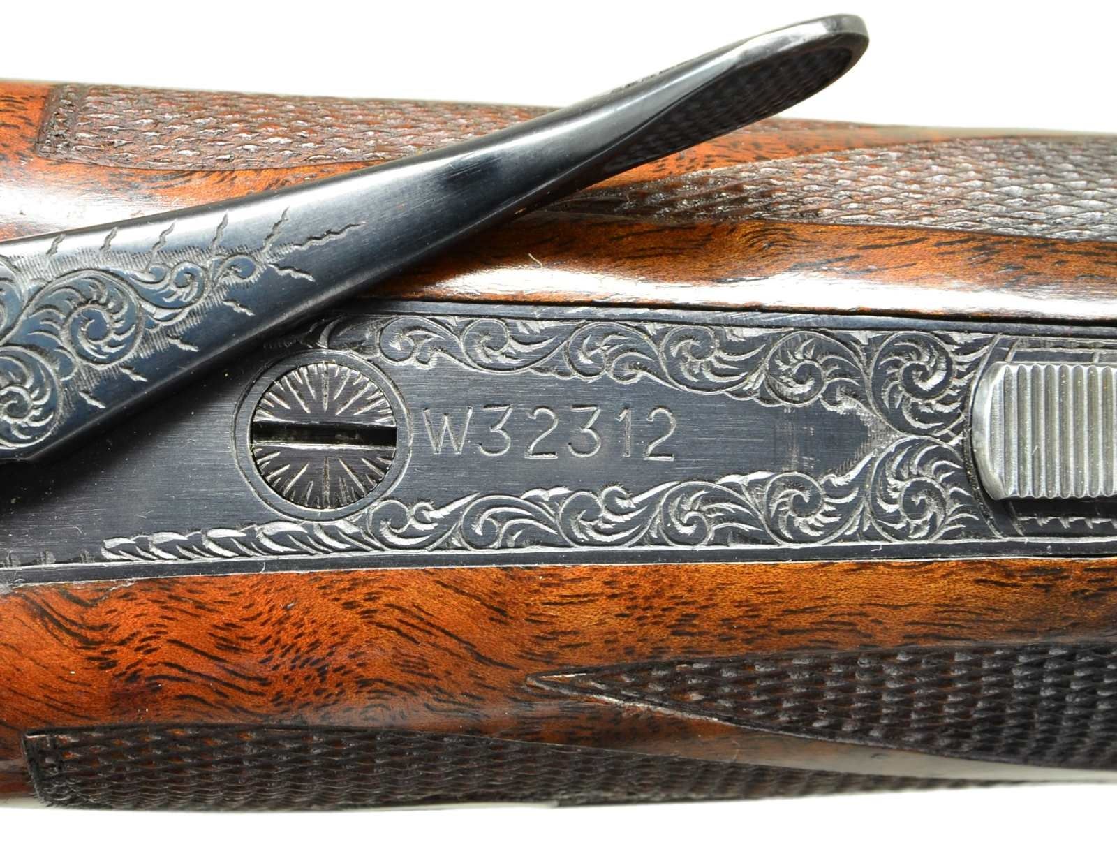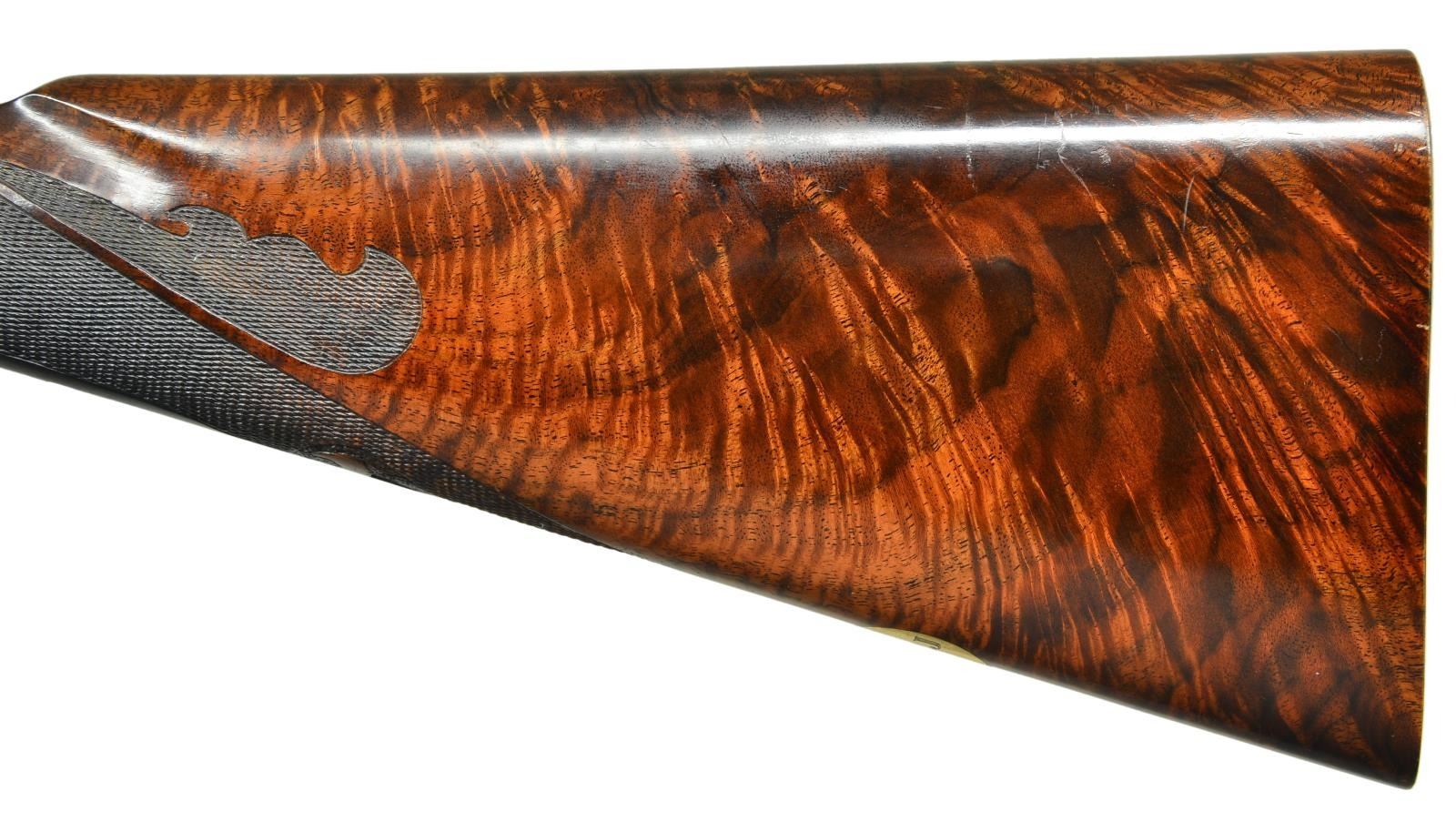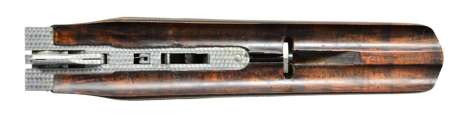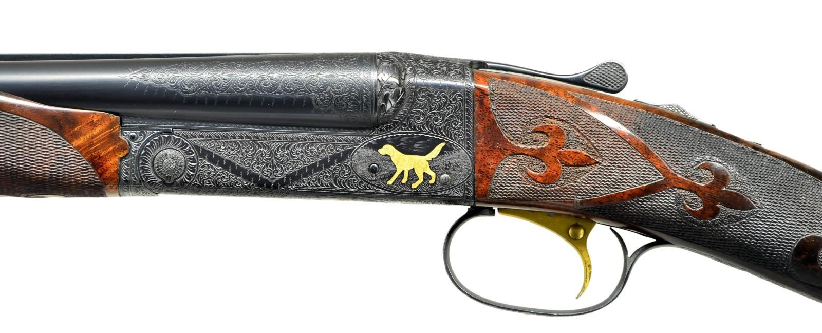 DOUBLE SHOTGUN WITH TWO BARREL SETS AND ORIGINAL CASE. Cal. 20 Ga., 3". S# W32312 (1974). Both barrel sets, one 26" the other 28", are fitted with matted game ribs engraved "CUSTOM BUILT BY WINCHESTER" in milled out portion of ribs. Breech ends are engraved with 3" triangles of scroll. Engine turned barrel flats are stamped with S#, gauge and chamber info. Bottoms of 26" barrels are marked "WS-1" & "WS-2". 28" barrels are marked for IC & MOD. Blued flatsided small size model 21 action features non automatic safetys ("SAFE" inlaid in gold) and goldplated single selective trigger. Action is engraved and gold inlaid in usual Grand American Style with near full coverage varying size scroll within line and feather borders. This scroll surrounds gold inlaid bird and dog scenes with setter on left side of action and pointing pointer on right. A pair of pheasant on ground under a tree are in circular vignette on trigger plate. The portrait of a spaniel is on trigger guard bow. Fences are semi relief carved with oak leaves. Wonderfully crotch figured American walnut straight grip buttstock measures 14" over checkered wood butt and is "B" carved with fleur de lis in checkering which also has fluroishes into butt. A gold oval on toeline is engraved "NEJ". Matching braced beavertail ejector forends with inlet ebony tips and engine turned internals have usual "J" are spring release with knurled roller secondary latch. Wood of forends is not numbered. Irons are stamped "1" & "2" on tips matching numbers on loops. MEASUREMENTS: 26" BBLS: Bore Diameter: L .614". R. .614". Restriction: L .005" (IC). R .007" Flare (skeet). Wall thickness: L .021". R .017". WEIGHT: 6 lb. 4 oz. 28" BBLS: Bore Diameter: L .614". R .614". Restriction: L .020" (Mod). R .010" (IC). Wall thickness: L .030". R .029". STOCK: DAH: 2 5/16". DAC: 1 5/8". CAST: about 1/8" off. LOP: 14". WEIGHT: 6 lb. 9 oz. UNATTACHED ACCESSORIES: gun and extra barrels are housed in what appears to be its original leather case with brass corners, lined in burgundy cloth. A leather Winchester label is in lid. Case contains 2 piece rosewood and brass cleaning rod with mop, brush & jag in black leather case, and some cleaning rags. Factory letter. CONDITION: very fine as refinished most likely by factory. Barrels retaining nearly all their reblack, there is some light subsequent silvering on top lever and safety button. Stocks retain most of a light oil refinish with one or two bumps and marks. Checkering shows light wear and darkening and has not been recut. Bores are bright and shiny without noted problems, mechanically fine. Case leather shows some water staining, straps and handle are good, interior has some rubs through and light soiling, label has some bumps. PROVENANCE: a factory letter to Ed Ulrich 1996 with extract of original records confirming two barrel sets, chambers, ribs and straight grip, with final inspection date of March 6, 1974. (22-5859/MGM). MODERN. $12,000-18,000.