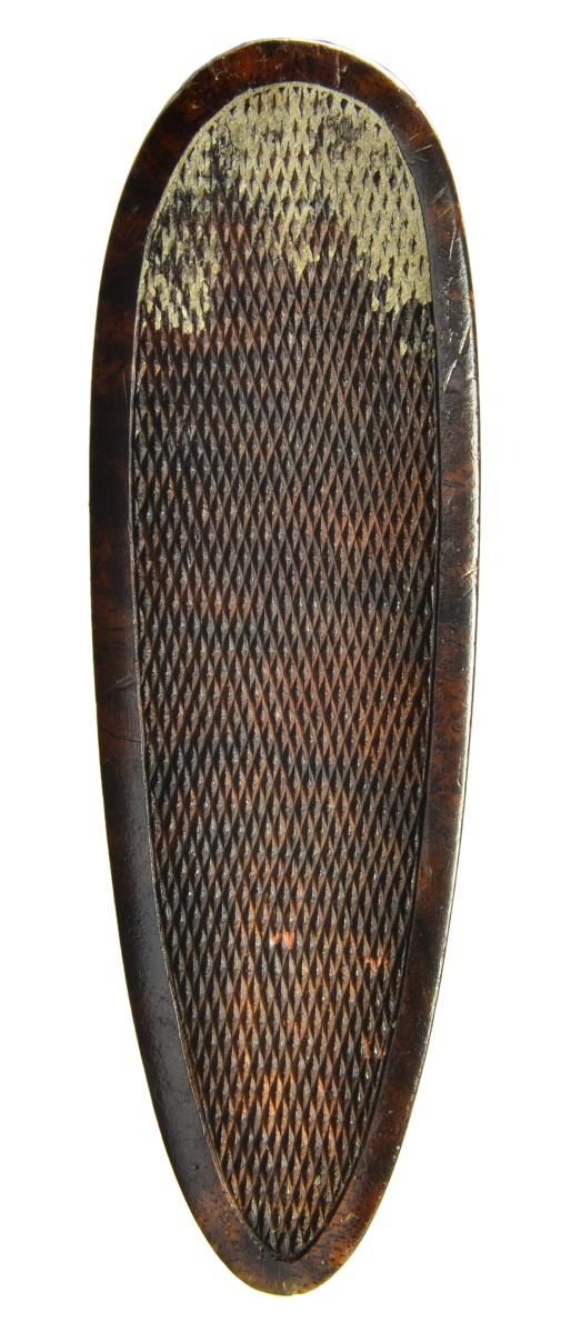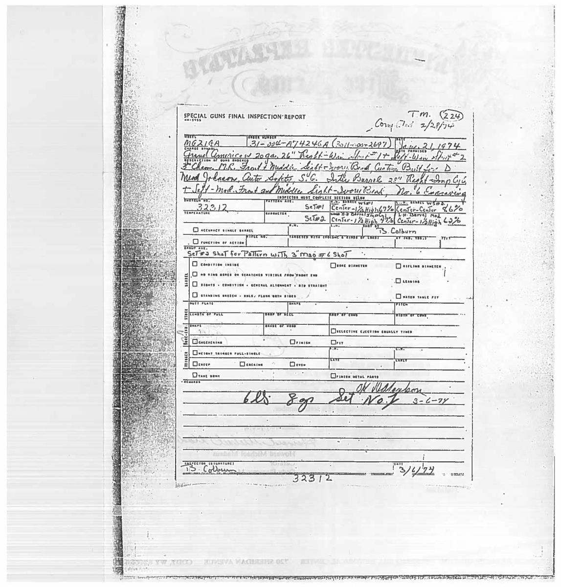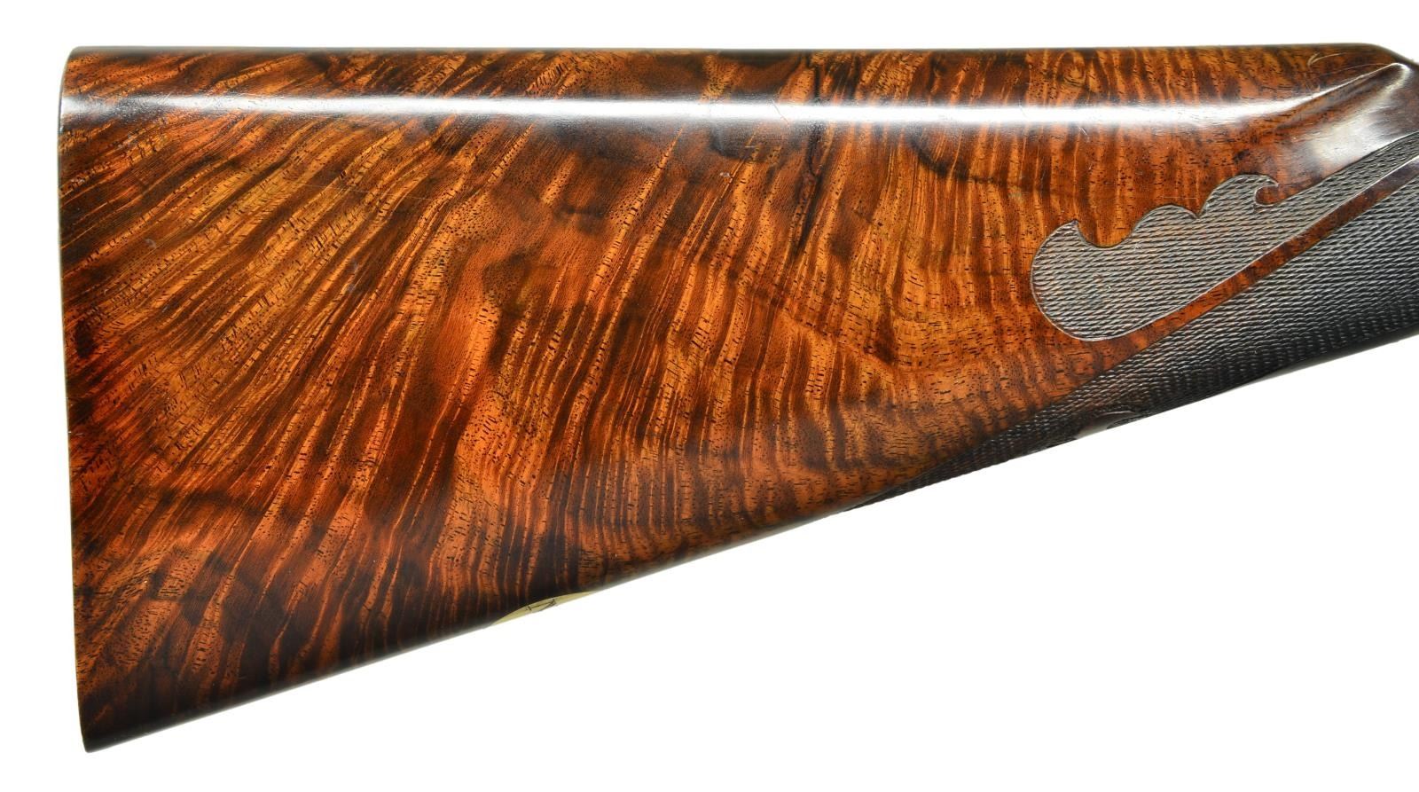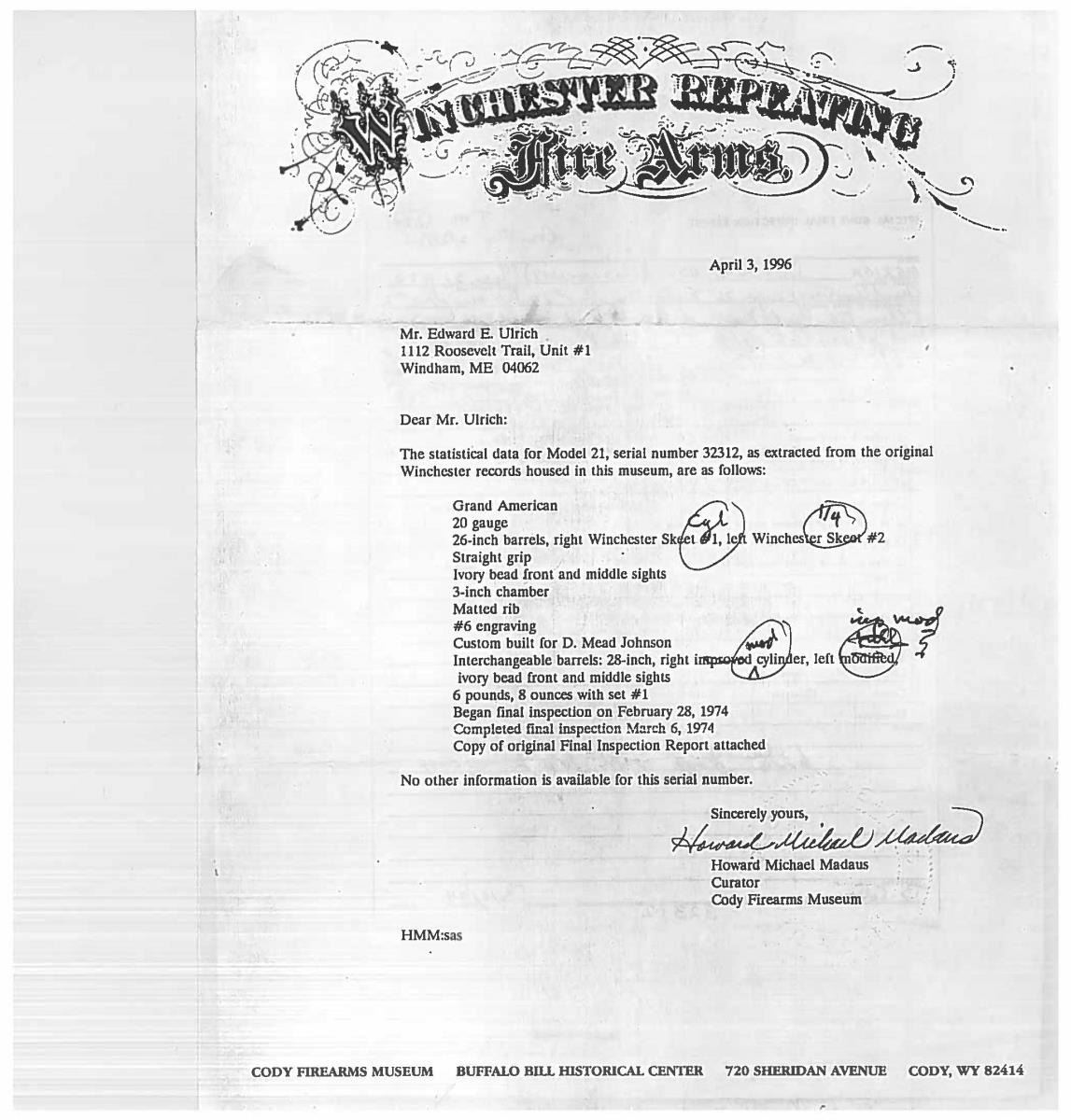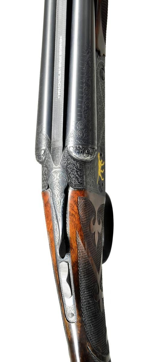 DOUBLE SHOTGUN WITH TWO BARREL SETS AND ORIGINAL CASE. Cal. 20 Ga., 3". S# W32312 (1974). Both barrel sets, one 26" the other 28", are fitted with matted game ribs engraved "CUSTOM BUILT BY WINCHESTER" in milled out portion of ribs. Breech ends are engraved with 3" triangles of scroll. Engine turned barrel flats are stamped with S#, gauge and chamber info. Bottoms of 26" barrels are marked "WS-1" & "WS-2". 28" barrels are marked for IC & MOD. Blued flatsided small size model 21 action features non automatic safetys ("SAFE" inlaid in gold) and goldplated single selective trigger. Action is engraved and gold inlaid in usual Grand American Style with near full coverage varying size scroll within line and feather borders. This scroll surrounds gold inlaid bird and dog scenes with setter on left side of action and pointing pointer on right. A pair of pheasant on ground under a tree are in circular vignette on trigger plate. The portrait of a spaniel is on trigger guard bow. Fences are semi relief carved with oak leaves. Wonderfully crotch figured American walnut straight grip buttstock measures 14" over checkered wood butt and is "B" carved with fleur de lis in checkering which also has fluroishes into butt. A gold oval on toeline is engraved "NEJ". Matching braced beavertail ejector forends with inlet ebony tips and engine turned internals have usual "J" are spring release with knurled roller secondary latch. Wood of forends is not numbered. Irons are stamped "1" & "2" on tips matching numbers on loops. MEASUREMENTS: 26" BBLS: Bore Diameter: L .614". R. .614". Restriction: L .005" (IC). R .007" Flare (skeet). Wall thickness: L .021". R .017". WEIGHT: 6 lb. 4 oz. 28" BBLS: Bore Diameter: L .614". R .614". Restriction: L .020" (Mod). R .010" (IC). Wall thickness: L .030". R .029". STOCK: DAH: 2 5/16". DAC: 1 5/8". CAST: about 1/8" off. LOP: 14". WEIGHT: 6 lb. 9 oz. UNATTACHED ACCESSORIES: gun and extra barrels are housed in what appears to be its original leather case with brass corners, lined in burgundy cloth. A leather Winchester label is in lid. Case contains 2 piece rosewood and brass cleaning rod with mop, brush & jag in black leather case, and some cleaning rags. Factory letter. CONDITION: very fine as refinished most likely by factory. Barrels retaining nearly all their reblack, there is some light subsequent silvering on top lever and safety button. Stocks retain most of a light oil refinish with one or two bumps and marks. Checkering shows light wear and darkening and has not been recut. Bores are bright and shiny without noted problems, mechanically fine. Case leather shows some water staining, straps and handle are good, interior has some rubs through and light soiling, label has some bumps. PROVENANCE: a factory letter to Ed Ulrich 1996 with extract of original records confirming two barrel sets, chambers, ribs and straight grip, with final inspection date of March 6, 1974. (22-5859/MGM). MODERN. $12,000-18,000.