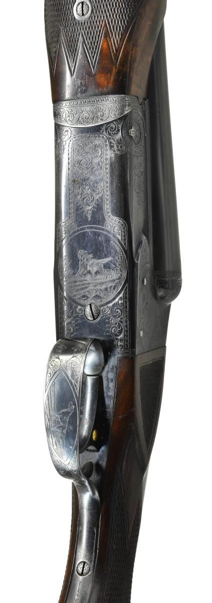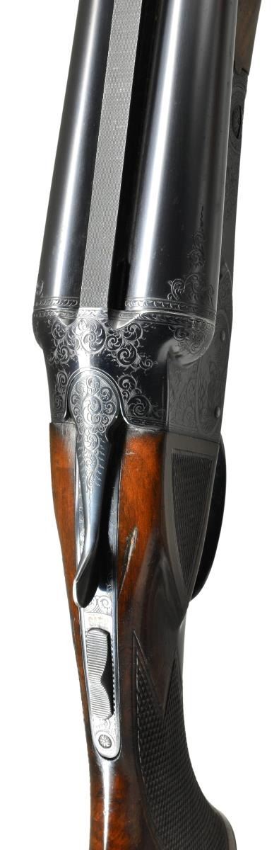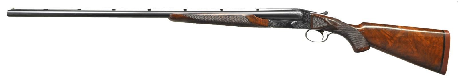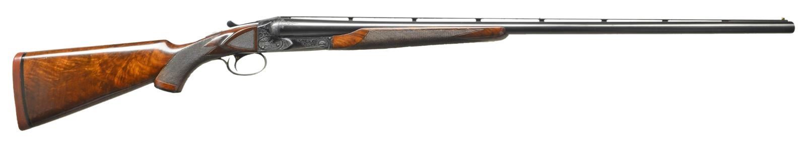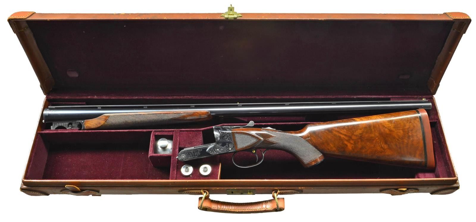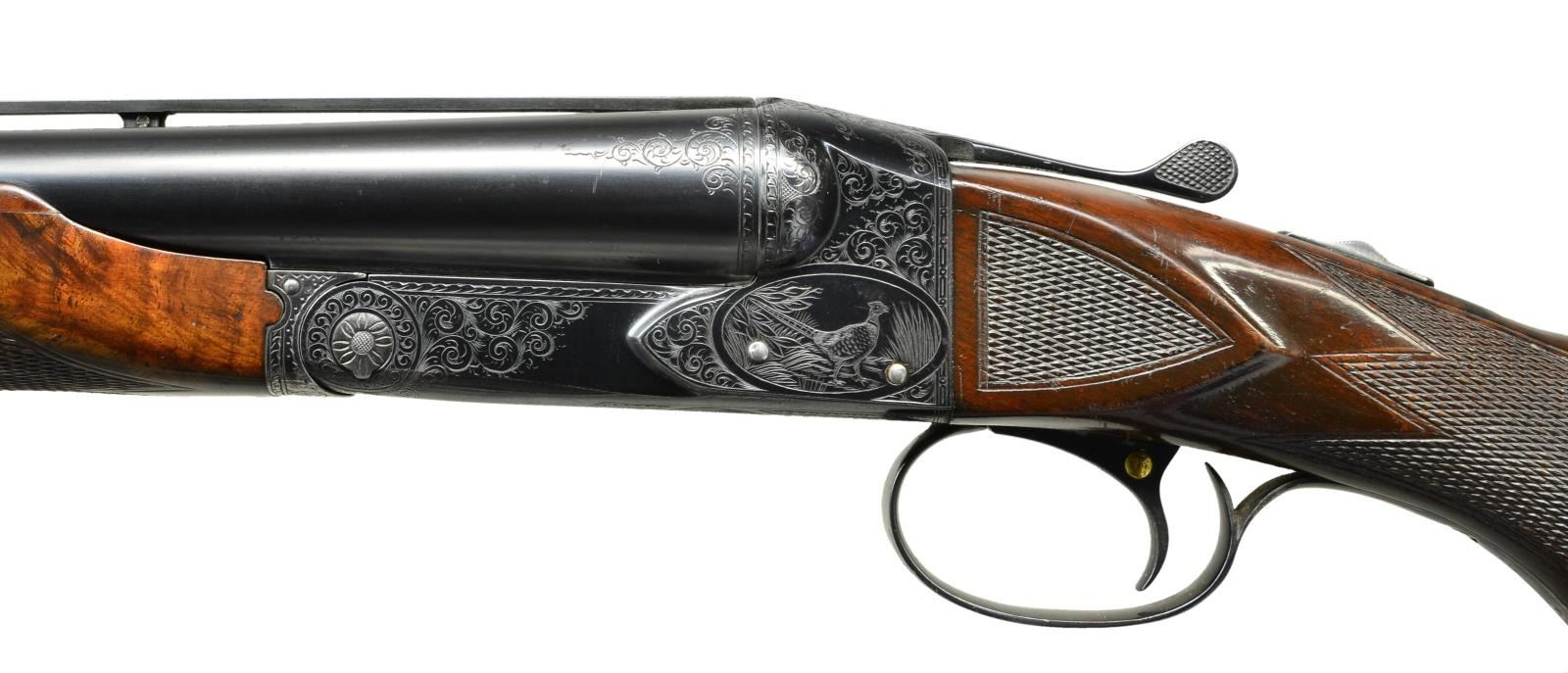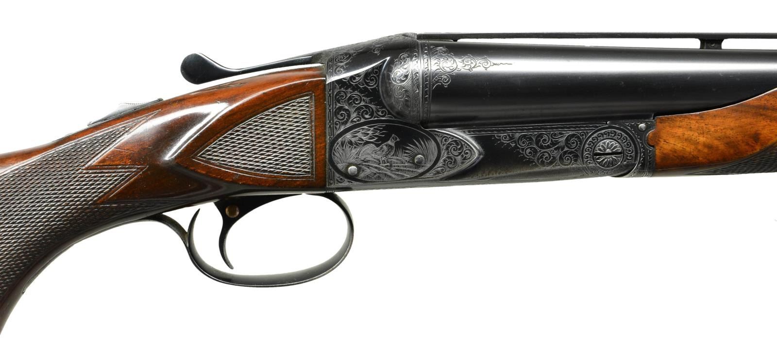 TRAP OR PIGEON GUN WITH CASE. Cal. 12 Ga., 2 3/4". S# 25645. (1951). This attractive gun has nearly all available factory options except for Monte Carlo stock. It has 32" barrels fitted with raised ventilated rib holding two white beads. There are 1" triangles of scroll engraving at breech ends in usual No. 5 style. Engine turned barrel flats are stamped with S#, gauge and chamber info along with Winchester proofs. Barrels are marked for mod and full chokes. Blued standard boxlock type action features automatic safety, and single selective trigger. All correct marks are on watertable. Action is engraved in classic No. 5 style, with about 60% coverage well cut scroll surrounding game scenes within ovals. Pheasant on left, ruffed grouse on right and setter retrieving bird on trigger plate. A standing setter is on trigger guard bow. Nicely crotch figured American walnut, Winchester capped pistol grip buttstock measures 14 3/8" over red Winchester solid pad. Side panels are checkered and multi-point pattern checkering is at grip. Matching, braced, long beavertail ejector forend has usual J spring release with secondary knurled button latch. MEASUREMENTS: BBLS: Bore Diameter: L .0727. R .0727. RESTRICTION L .032. (full). R. .0775 (IC). Wall thickness L .032. R .030. STOCK: DAH: 2 7/16". DAC: 1 1/2". CAST: neutral. LOP: 14 3/8". WEIGHT: 8 lb. 3 oz. UNATTACHED ACCESSORIES: gun is housed in what is most likely its original Abercrombie & Fitch VC leather case, also marked "Made in England". Case has stitched leather corners and is lined in burgundy velvet. Case contains cleaning equipment, A&F marked snap caps, square oil bottle, bench and wiping cloths. CONDITION: fine, original as found. Barrels retaining over 90% original blue with some marks and light splotches. Action shows some silvering on fences and on bottom from normal hand wear, bottom of forend iron is considerably silvered. Trigger retains about 60% blue, silvered on bow and considerably on tang. Stocks retain about 90% original varnish with a large number of marks, scratches and minor dings, checkering shows light wear. Bores are bright and shiny without any noted problems, action is tight, mechanically fine. Case leather is darkening, shows a large number of marks and rubs. Newer straps are good as is replaced handle. Interior cloth is fine with rubs and compressions, accessories are good. (22-5839/MGM). CURIO. $9,000-14,000.