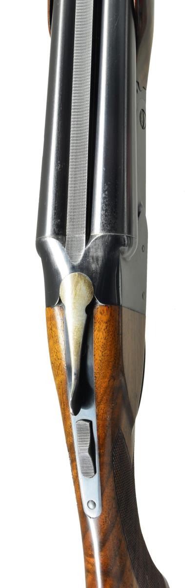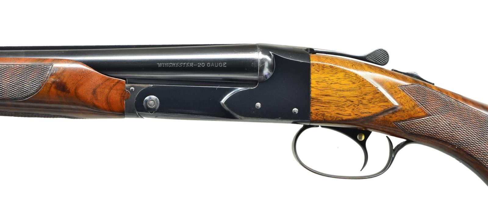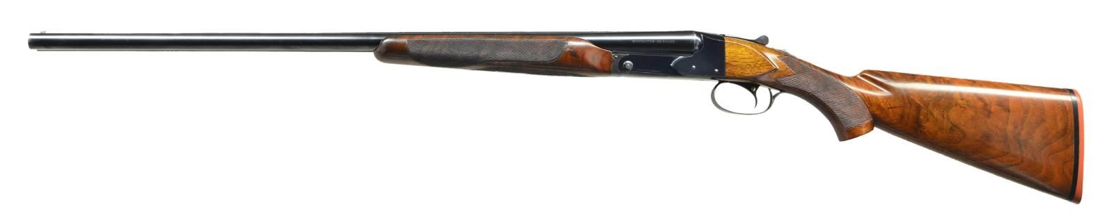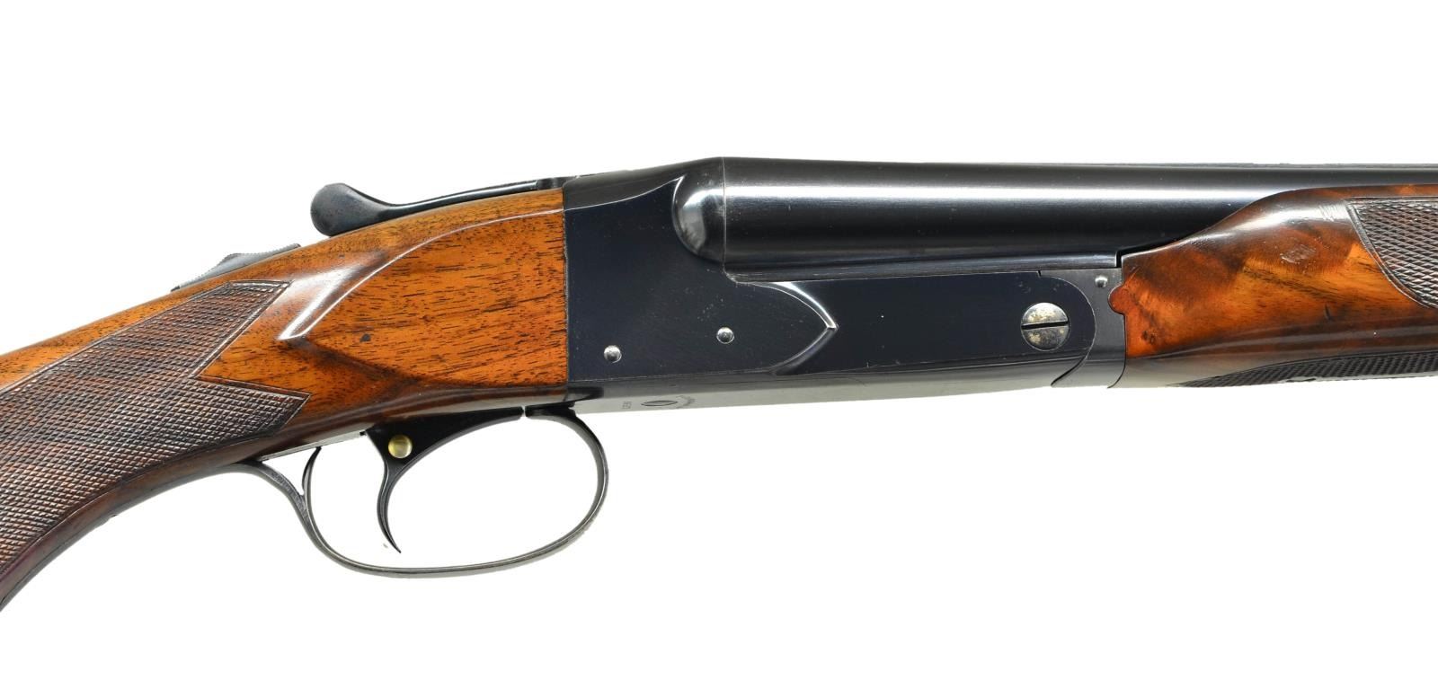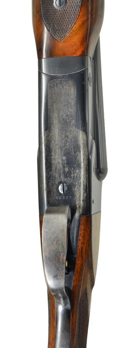 SHOTGUN. Cal. 20 Ga 2-3/4. S# 9423. Bbls. 26’’ w/ fixed WS-1 & WS-2 chokes. Red target front sight w/ steel mid bead. Blued boxlock action w/ single selective trigger & ejectors. Floorplate is marked “TOURNAMENT SKEET”. Beavertail forearm w/ kidney pattern checkering & uncapped pistol grip stock of checkered fancy black walnut. LOP: altered to 14-3/8’’ over a thin red Old English pad. DAC: 1-9/16’’. DAH: 2-3/8’’. Neutral cast. WEIGHT: 6 lbs, 9.8 ozs. CONDITION: over 80% original blue. Bbls. have spots of thinning near muzzle. Action shows flaking & spots of corrosion on floorplate & trigger guard. Top lever has faded to gray. Upper areas of receiver show small wear spots. Original wood finish shows scattered scratches & marks. Top lever sits slightly left of center. Very good bores. (23-733/DS). CURIO. $4,000-6,000.