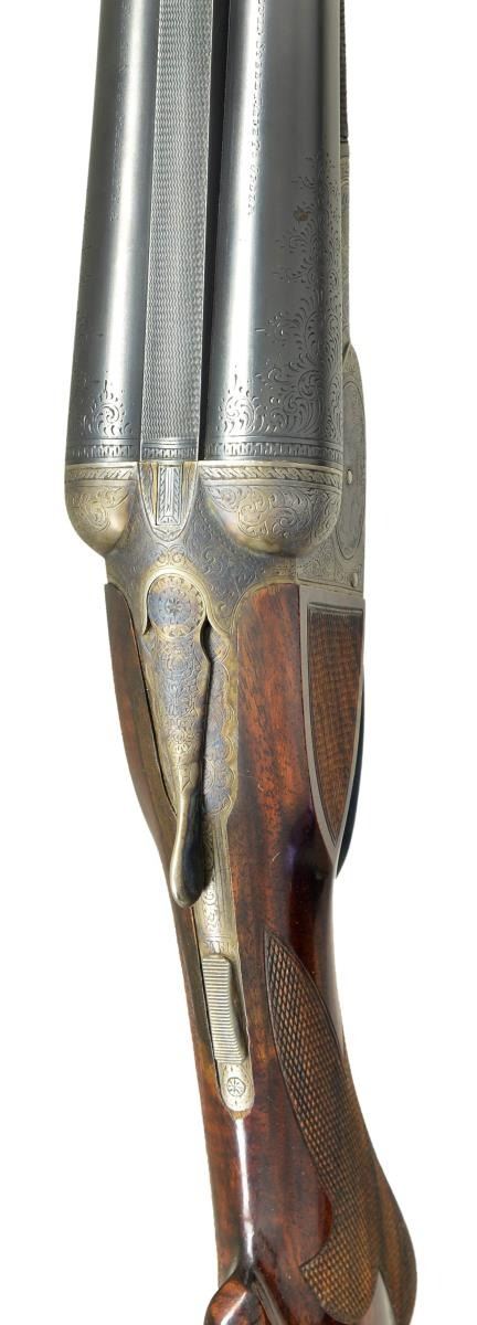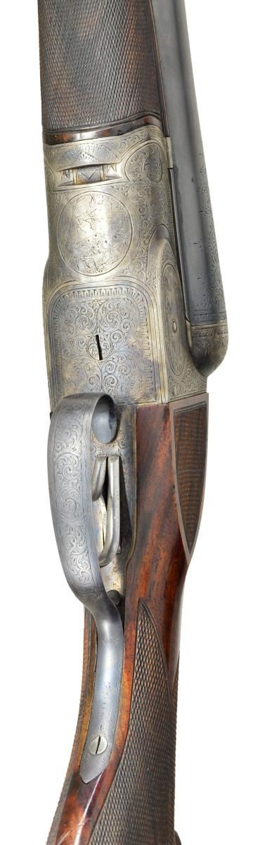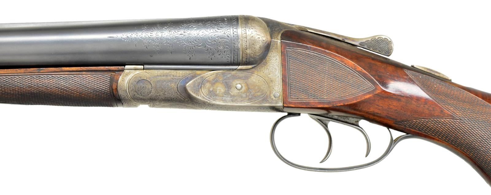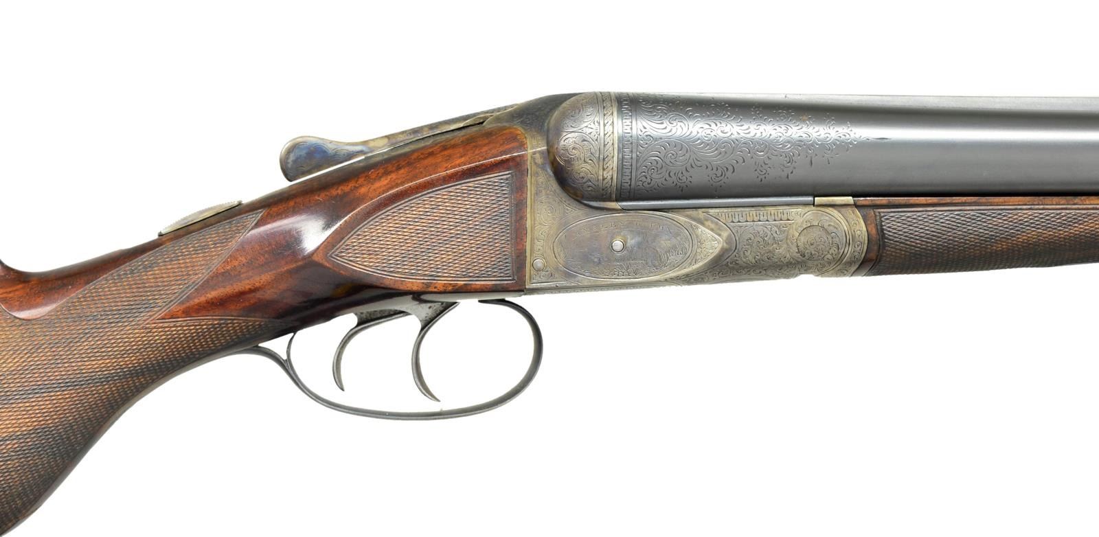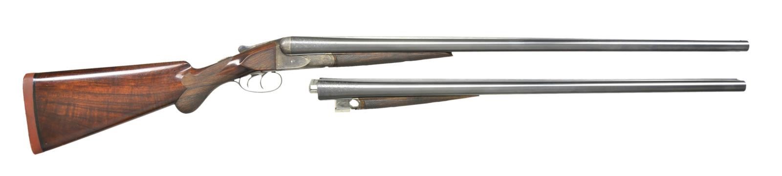 SETS. Cal. 12 Ga., 2 5/8". S# 7904. (CA 1908). The 30" barrel set with matted rib is engraved "Fluid Steel Made To Order" "By A. H. Fox Gun Co. Phila. U.S.A." on tops. Second 28" barrel set has similar rib but "To Order" and "By" are not in barrel legend. Both barrel sets are engraved with 3" triangles of scroll at breech ends. 30" barrels have S# engraved on otherwise unmarked barrel flats. 28" barrels are stamped with S# "2" and "D". Case hardened early Fox action with classic rotary bolt has S# engraved on watertable. Patent dates are also engraved. Action is fitted with early style ejectors with large diameter trip pins. Action features automatic safety and double triggers and is engraved in early "D" style with near full coverage, open shaded scroll with some geometric borders which surrounds game scenes. Feeding quail are on left and rabbits on right. A pair of pointing setters under a large tree are on bottom of action. "ANSLEY H. FOX" is above each game scene. Blued trigger guard with scroll on bow has S# on tang. Replacement buttstock of well figured and streaked European walnut measures 15 1/4" over Silver type pad, side panels are checkered and grip checkering is in "D" pattern. Matching splinter forends are nearly fully checkered, forend for 30" barrels is stamped with S# and engraved "PATENTS PENDING". Forend for 28" barrels has some border engraving on iron and is stamped "PATENTS PENDING" and with S# along with "2". MEASUREMENTS: 30" BBLS: Bore Diameter: L .730". R .731". Restrictions: L .031" (full). R .020" (mod). Wall thickness: L .034". R .030". STOCK: DAH: 2 1/4". DAC: 1 7/16". CAST: neutral. LOP: 15 1/4". WEIGHT: 8 lb. 2 oz. 28" BBLS: L .725". R .725". Restriction: .012" (mod) .002" (IC). Wall thickness: L .042". R .040". STOCK: DAH: 2 3/8". DAC: 1 7/16". CAST: neutral. LOP: 15 1/4" WEIGHT: 8 lbs. 0 oz. UNATTACHED ACCESSORIES: extra barrel set. CONDITION: fine as refurbished. Both barrel sets retaining nearly all rust reblue. Action retains nearly all of case hardening recolor that is rather drab. Newer buttstock retains nearly all of its hand rubbed oil finish with a few light scratches. Checkering is lightly worn, checkering of original forend wood recut, wood refinished. Bores are bright and shiny in both barrel sets, action is tight, ejectors are in time on both barrel sets. (22-5855/MGM). CURIO. $10,000-15,000.