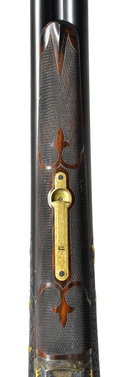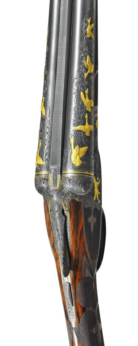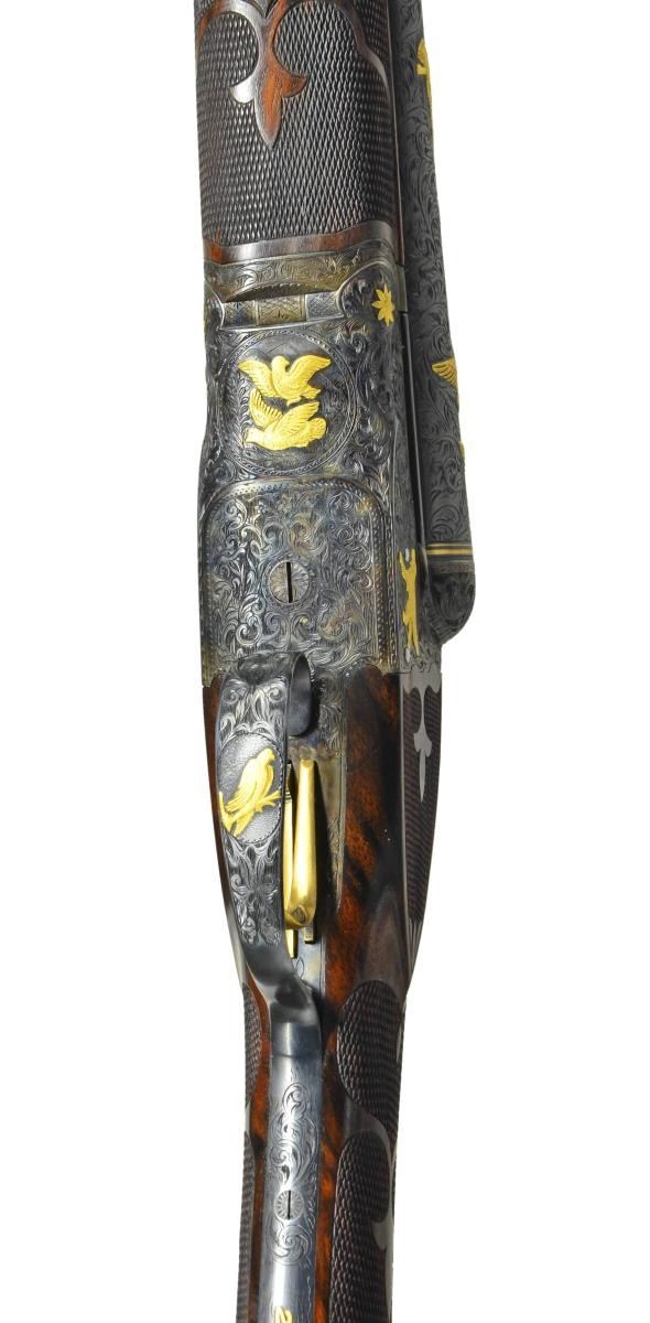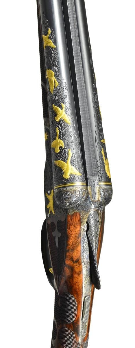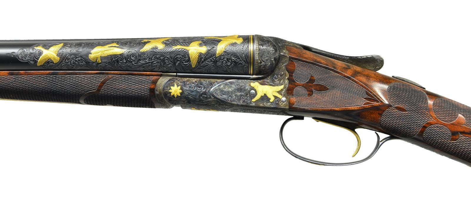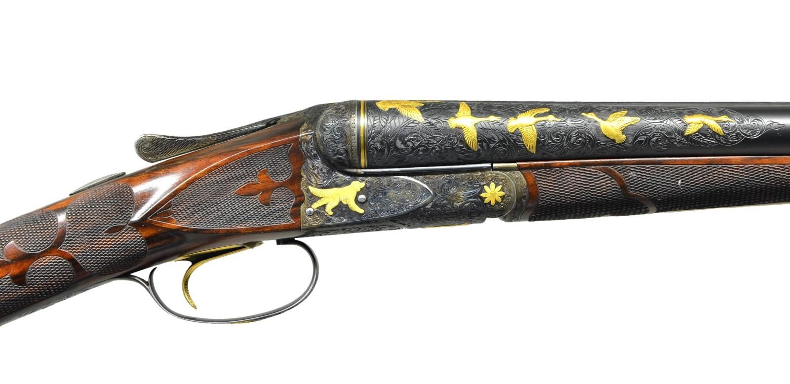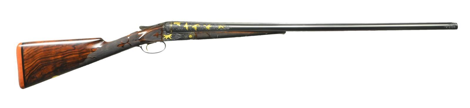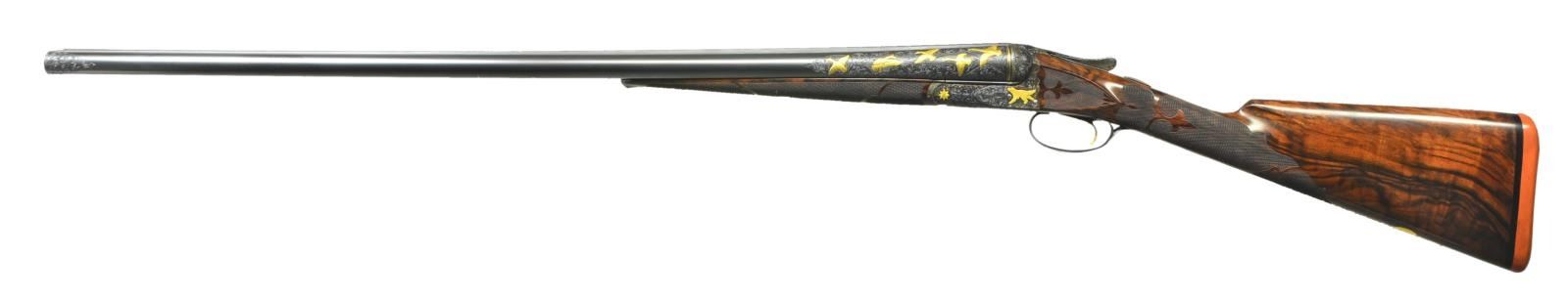 TRIGGER UPGRADE SHOTGUN. Cal. 12 Ga., 2 5/8". S# 22324 (1916). The 32" barrels with matted rib holding two white beads are engraved "Krupp Fluid Steel Made By" "A. H. Fox Gun Co. Phila. PA." on tops. Breech ends of barrels are engraved for 6 1/2" along their length with large shaded scroll. This scroll is background for flocks of relief gold inlaid ducks in various poses on each side for a total of ten inlaid figures. Matching scroll engraving extends 1 1/2" back from muzzles. Barrel flats are stamped with S#, and Fox proof. "F" is engraved. Krupp Steel info is stamped on bottoms of barrels. Case hardened Fox action has patent dates and S# stamped on watertable "F SPECIAL" is engraved within vine borders. Action has double ogee filed back and rebated frame. It is engraved with full coverage scroll matching barrels. Relief gold inlays consist of dogs on both sides, flowers on hinge pin ends, a pair of quail on bottom and a hawk perched on a branch on trigger guard bow. S# is in gold on tang. Action features non automatic safety and Kautzky single selective trigger which is gold plated. The engraver's signature "W. H. Gough" is in front of trigger. It is highly doubtful that this famed engraver was responsible for the work on this gun, however work is done in his style. Well made straight grip buttstock of attractively marbled and lightly figured European walnut measures 15" over Silver type pad. Side panels are checkered and have fleur de lis intrusions. Grip checkering is of fancy pattern with ribbons and fleur de lis. A vacant gold oval is on toeline. Matching long splinter ejector forend has gold plated Deeley type release and inlet schnabled horn tip. MEASUREMENTS: BBLS: Bore Diameter: L .725". R .725". Restriction: L .033" (full). R .020" (mod). Wall thickness: L .032". R .033". STOCK: DAH: 2 3/4". DAC: 1 15/16". CAST: neutral. LOP: 15". WEIGHT: 7 lb. 12 oz. CONDITION: very fine as custom upgraded with only a very few essembly and handling marks on all wood and metal finishes. Bores are bright with a few scattered pits mostly in right barrel. Action is tight, mechanically fine. (22-5619/MGM). CURIO. $7,000-11,000.