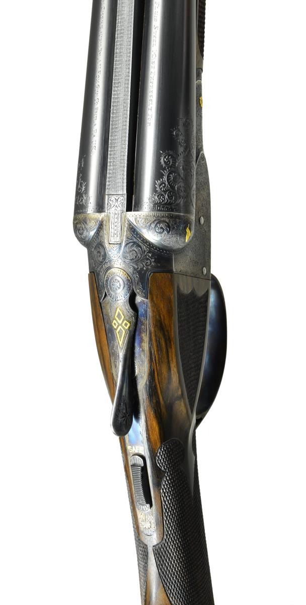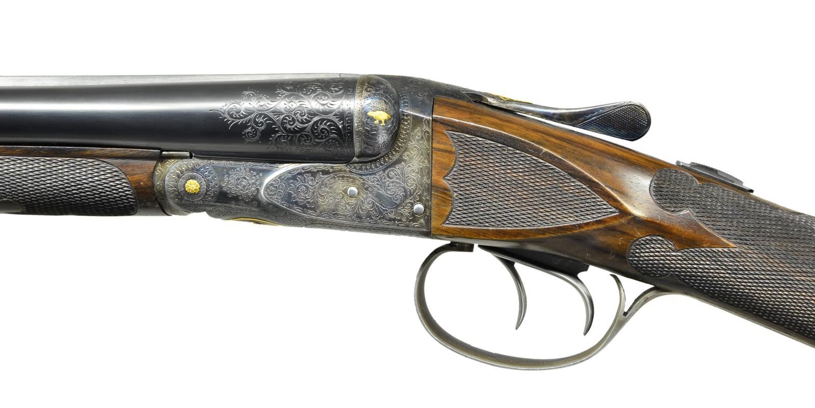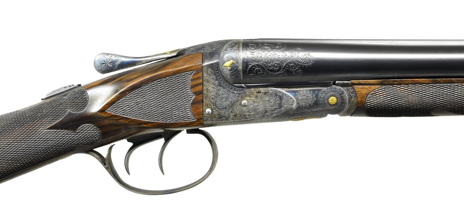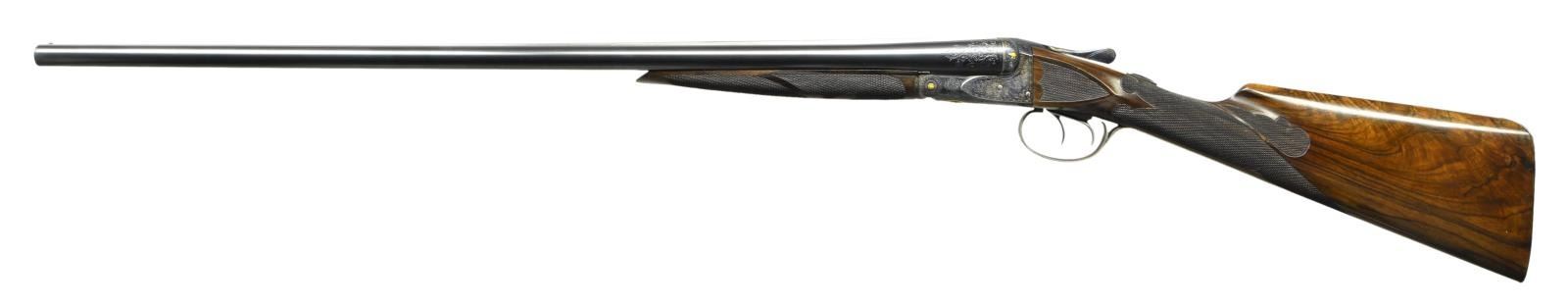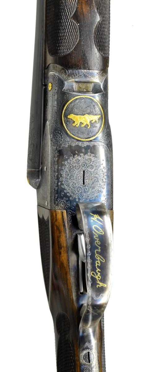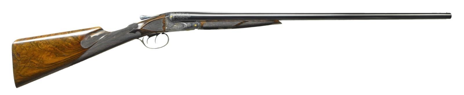 TO "DE SPECIAL". Cal. 20 Ga., 2 3/4". S# 200232. The 28" barrels with slightly raised matted rib are engraved "Krupp Fluid Steel Made Expressly For" "Mr. Harry Overbaugh By A. H. Fox Gun Co. Philia. PA. U.S.A.". There are 2" triangles of scroll at breech ends and 1/8" engraved bands at muzzles. S# is engraved on barrel flats and bottoms of barrels are hand engraved with Krupp Steel information. Small size case hardened Fox action features automatic safety "SAFE" inlaid in gold and double triggers. Action is engraved with 80% coverage small scroll with geometric borders "ANSLEY H. FOX" is in scrolled ribbon on each side. Engraving is enhanced by scattered relief gold accents with a quail on left fence and snipe on right. Hinge pin ends have gold flowers, top lever is inlaid with geometric design. Bottom of action has circular scene of two setters in gold, within gold circle. Trigger guard bow is flush gold inlaid with the signature "H. Overbaugh", S# is in gold on tang. All information on watertable including grade, patent dates and S# are hand engraved. Attractive straight grip buttstock of nicely crotch figured and well streaked European walnut measures 14 3/8" over engraved skeleton steel buttplate. Side panels are checkered in "D" style. Grip checkering is also of "D" style with flourishes toward comb separated by an uncheckered ribbon. Matching splinter ejector forend with engraved patent information on iron, inlet horn tip and gold starburst on central escutcheon has Sterlingworth type friction release. MEASUREMENTS: BBLS: Bore Diameter: L .619"'. R .619". Restriction: L .016" (mod). R .007" (IC). Wall thickness: L .033". R .027". STOCK: DAH: 2 5/8". DAC: 1 9/16". CAST: neutral. LOP: 14 3/8". WEIGHT: 6 lb. 4 oz. CONDITION: very fine as custom finished. Metal parts retaining approximately 90% of their fine finishes, some high edge wear is noted. Stocks have a few scattered marks mostly on left side of butt associated with light field use. Bores are bright and shiny, mechanically good. (22-5620/MGM). CURIO. $6,000-10,000.