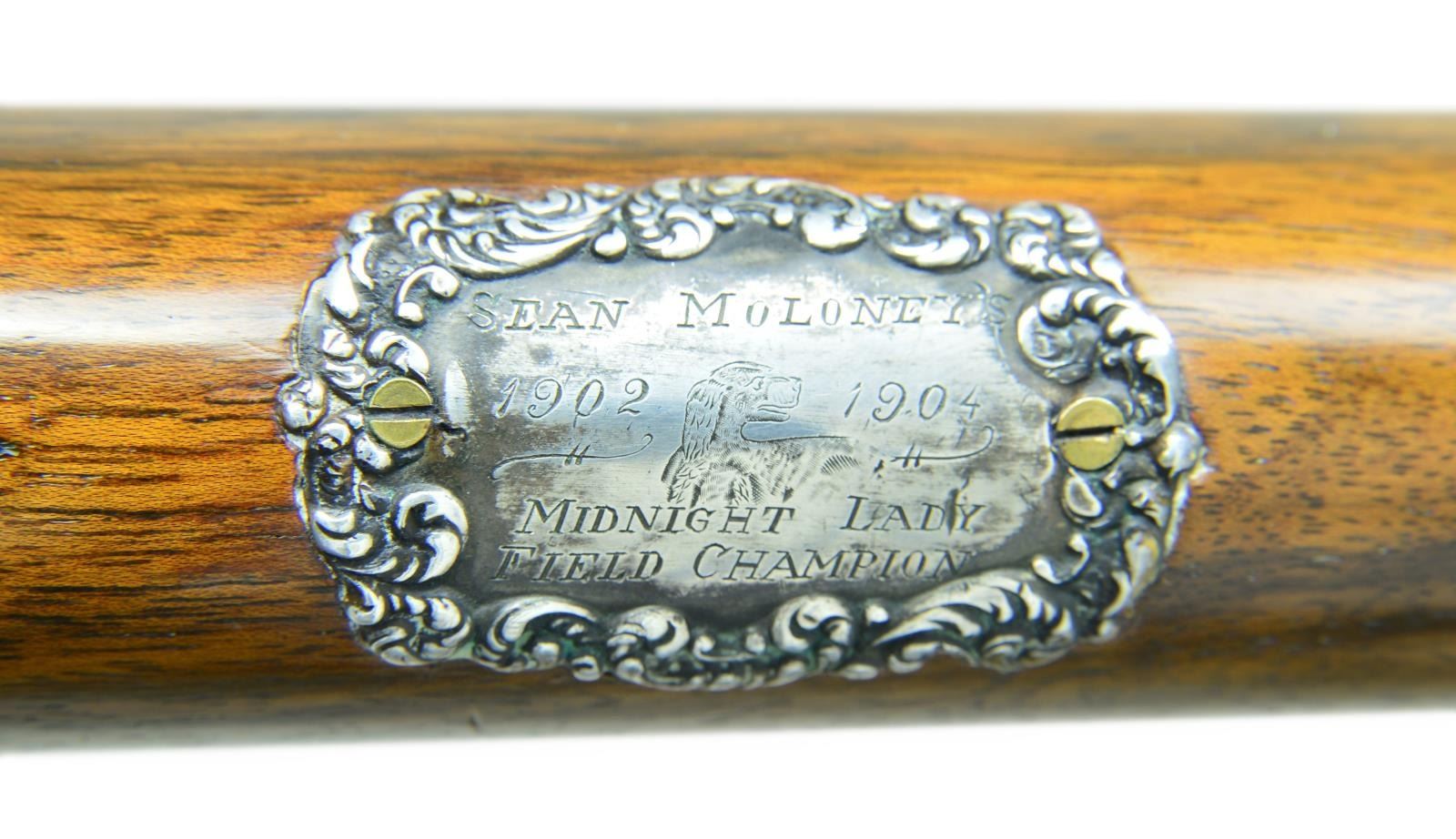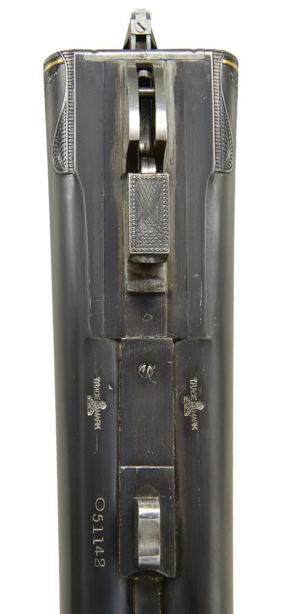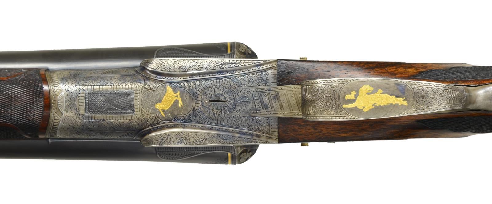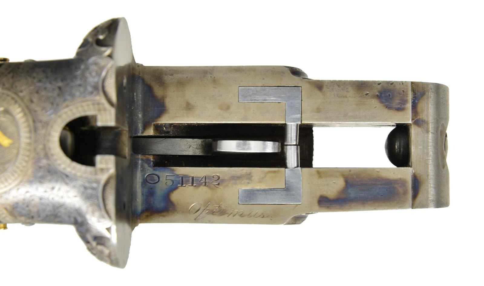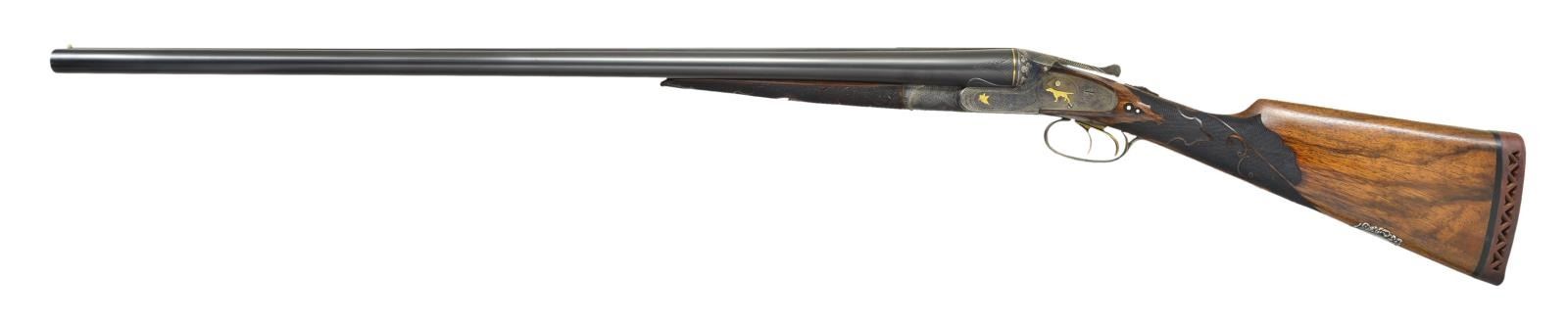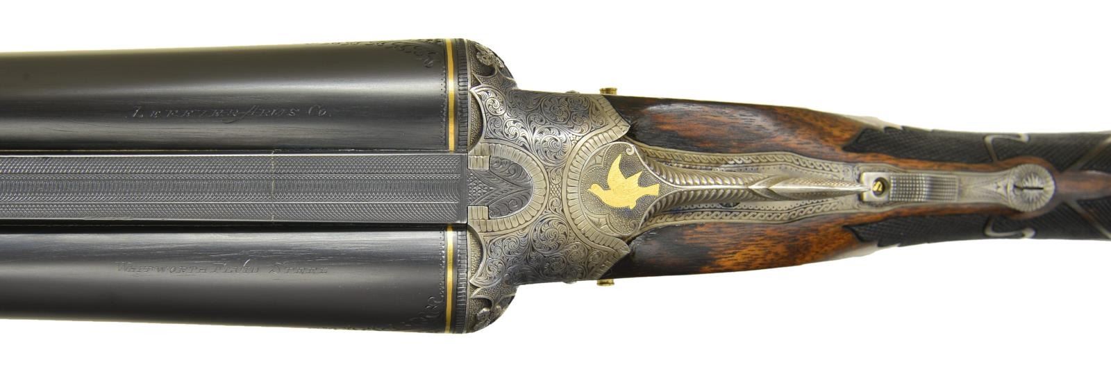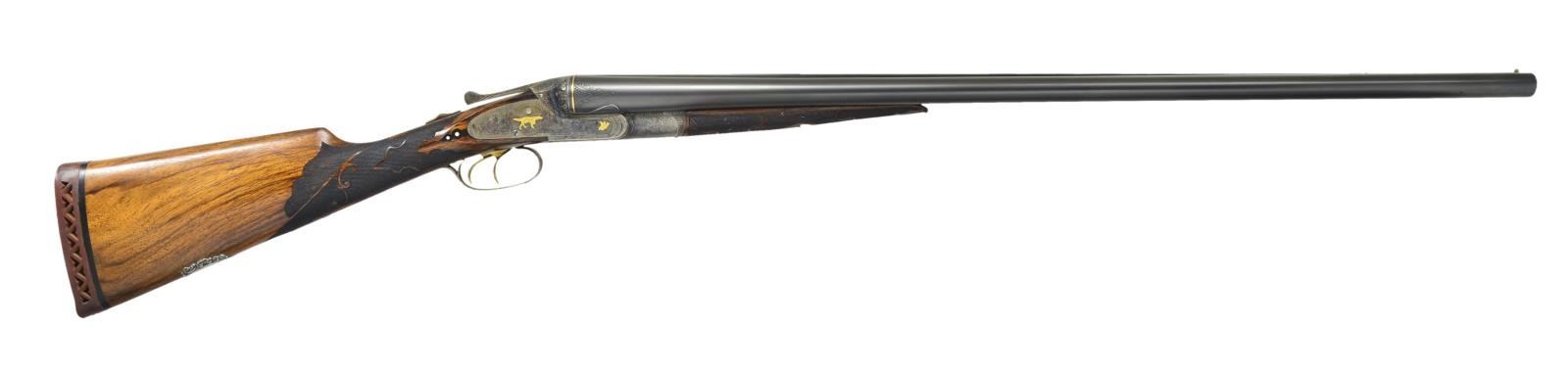 Cal. 12 Ga. 2 3/4". S# 051142. The Optimus grade Lefever is avidly sought after. Original examples are very rare. Probably more upgrades have been created than originals were ever made by the Lefever Arms Co. Most upgrades are easily spotted. In the case of this gun only a few minor issues exist giving a clue that it is not factory work. The 30" steel barrels with slightly raised flat matted rib are newly engraved "Lefever Arms Co." "Whitworth Fluid Steel" on tops. The area in which engraving has been done shows removal of metal to obliterate original markings. (Clue #1). Gold bands are around breech ends and 1 1/2" triangles of geometric and scroll engraving are in front of bands. Barrels do have correct high grade Lefever style raised ogee decorations as found on most Lefever guns above grade "E". Bottoms of barrels are stamped with Whitworth trademarks. (Lettering fonts don't match known examples and wheat sheafs have incorrect proportions. Clue #2). S# has lazy "0" stamped in front, as do most Optimus grade guns. Case hardened action has watertable stamped with S# including "0". Watertable is also engraved "Optimus" in script. (This engraving is sharp and easily felt with ones finger. Clue #3). Action with automatic safety "S" inlaid in gold, features usual pin type cocking indicators, high grade adjustable sears and gold plated double triggers with checkered finger blades. Action also features three cloverleaf relief carved fences, rebated lockplate tails and file decorated top lever as found on most Optimus guns. Action is engraved with near full coverage very well cut open shaded scroll within line and geometric borders and some foliate accents. Central ovals are embellished with flush gold inlaid dogs (pointing pointer on left and setter on right). Tips of lockplate are also gold inlaid with flying woodcock on left and quail on right. This engraving is a perfect match for Optimus grade S# 533XX as illustrated in "LEFEVER: GUNS OF LASTING FAME" by Bob Elliott on page 71. The gold inlay of pointing pointer and flying woodcock are also identical including background of dog scene. The gold woodcock on the bottom of the action and the flying pigeon on top lever are also nearly identical to those illustrated on page 78. (There is almost always some notable difference in engraving between high grade guns. Clue #4). Trigger guard is decorated with more scroll and gold inlaid setter bitch with pups. S# is on trigger guard tang. Straight grip buttstock of lightly marbled and streaked European walnut measures 14" over red open sided "HAWKINS" pad. Ebony clockhand drop points are inset with two white dots in usual high grade Lefever fashion. Fancy Optimus style checkering pattern has ribbons through fields and flourishes toward comb. A very convincing touch is the relief cast large silver oval on toeline engraved "SEAN MuLONEY'S" "1902 (engraved setter head) 1904" "Midnight Lady" "Field Champion". Medallion is affixed with two brass screws. Matching splinter forend has engraved "clamshell" release as only found on late Lefevers of grade "E" and above along with shaped horn forend tip. MEASUREMENTS: BBLS: Bore Diameter: L 728". R 728". Restriction: L .037" (full). R .030" (IMod) Wall thickness: L .033". R .035". STOCK: DAH: 2 5/8". DAC: 1 1/2". CAST: neutral. LOP: 14". WEIGHT: 7 lb. 9 oz. CONDITION: very fine as custom finished, barrels retaining nearly all very fine rust blue, edges of rib somewhat rounded, matting softened. Action retains nearly all of a case hardening recolor with some high edge wear, color is not quite correct for an original Lefever. Gold inlay remains sharp and bright. (Clue #5.) Stocks retain most of an oil refinish with some scattered subsequent marks. Checkering darkened to simulate wear. Bores are shiny with minor scattered pits throughout. Action is tight, barrels are on face, in frame ejectors are in time. A very well done upgrade. (22-5625/MGM). CURIO. $10,000-20,000.