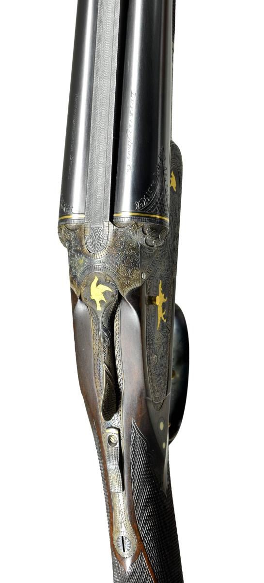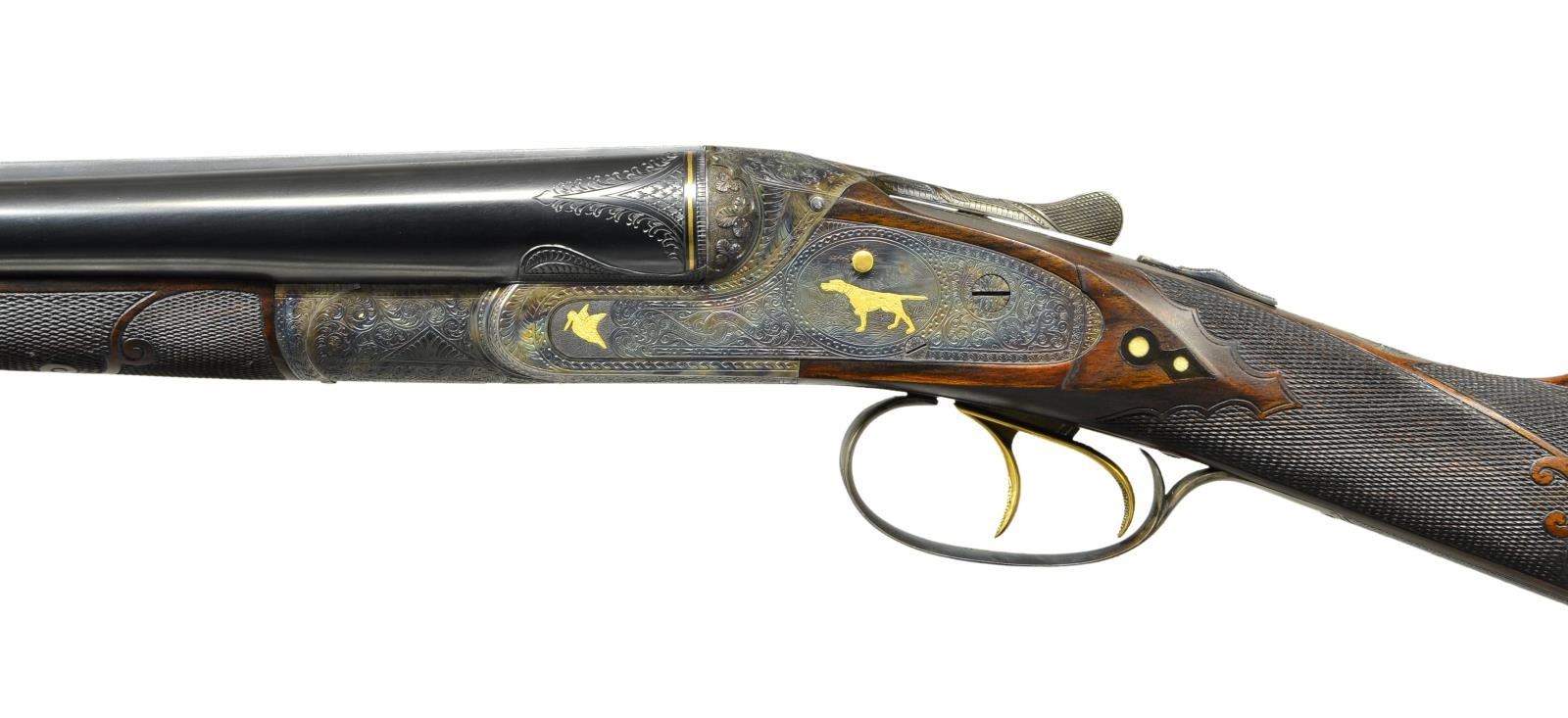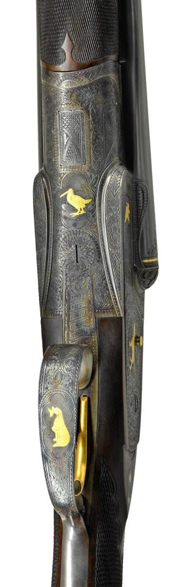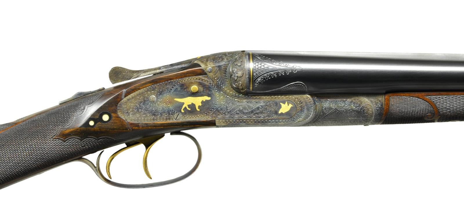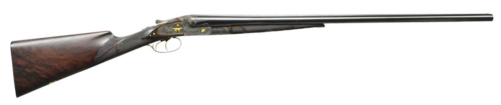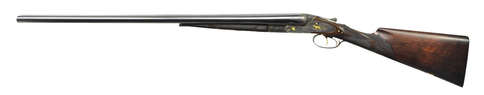 Cal. 16 Ga. 2 1/2". S# 054508. Small bore Optimus guns are exceedingly rare and generally speaking, ones only hope of finding an example is to buy or create an upgrade. This attractive small bore gun has 28" barrels with slightly raised matted rib holding two white beads. Tops of barrels are engraved "Lefever Arms Co." "Whitworth Fluid Steel". Gold bands are around breech ends and there are triangles of engraving in front of bands. High grade Lefever barrel ogees have been cut in. Bottoms of barrels are newly stamped with sheaf of wheat trademarks. Case hardened sideplate action with S# and "Optimus" on watertable features automatic safety "S" inlaid in gold, gold plated cocking indicators and triggers (finger blades checkered). Action is well filed with nicely shaped beads, rebated lockplates, shamrocks on fences and chevrons on top lever. Action and lockplates are engraved with near full coverage, nicely cut shaded scroll within geometric and line borders with some foliate accents. This well done engraving surrounds flush gold inlaid dog scenes on lockplates with pointing pointer on left and setter on right. Forward part of plates is gold inlaid with flying snipe on left and quail on right. Bottom of action has gold inlaid walking snipe and a flying pigeon is in gold on top lever. Trigger guard bow is inlaid with a setter retrieving a bird. S# is on tang. Newly made straight grip buttstock of lightly marbled and figured European walnut measures 14 3/8" over checkered wood butt with horn heel and toe plates. Flush inlet clock hand horn drop points have white dot accents. The checkering is of Optimus pattern with scrolled ribbons and flourishes toward comb. Matching splinter forend has flush gold inlaid setters head on steel escutcheon along with a fancy horn forend tip. MEASUREMENTS: BBLS: Bore Diameter: L .670". R .670". Restriction: L .031" (full). R .031" (full). Wall thickness: L .029". R .030". STOCK: DAH: 2 7/16". DAC: 1 1/2". CAST: neutral. LOP: 14 3/8". WEIGHT: 6 lb. 7 oz. CONDITION: exceptionally fine as refurbished retaining nearly all custom finishes on both wood and metal with only a few very minor handling marks. Bores are bright. Action is tight, mechanically good. (22-5604/MGM). CURIO. $7,000-10,000.
