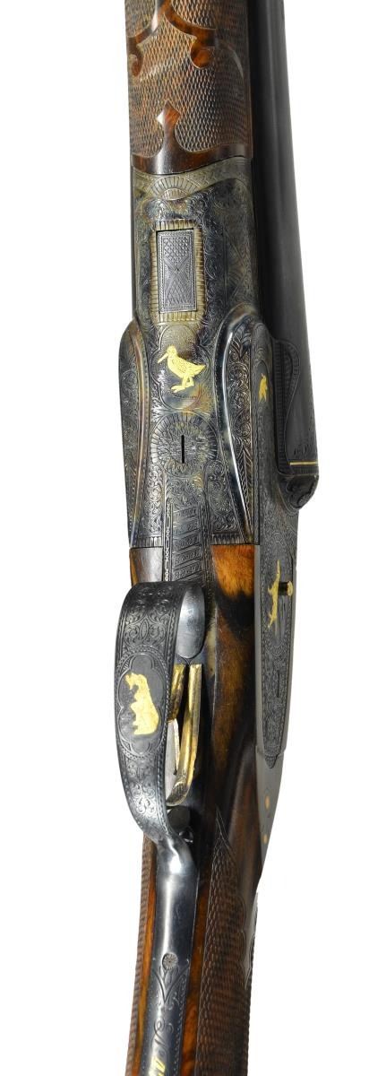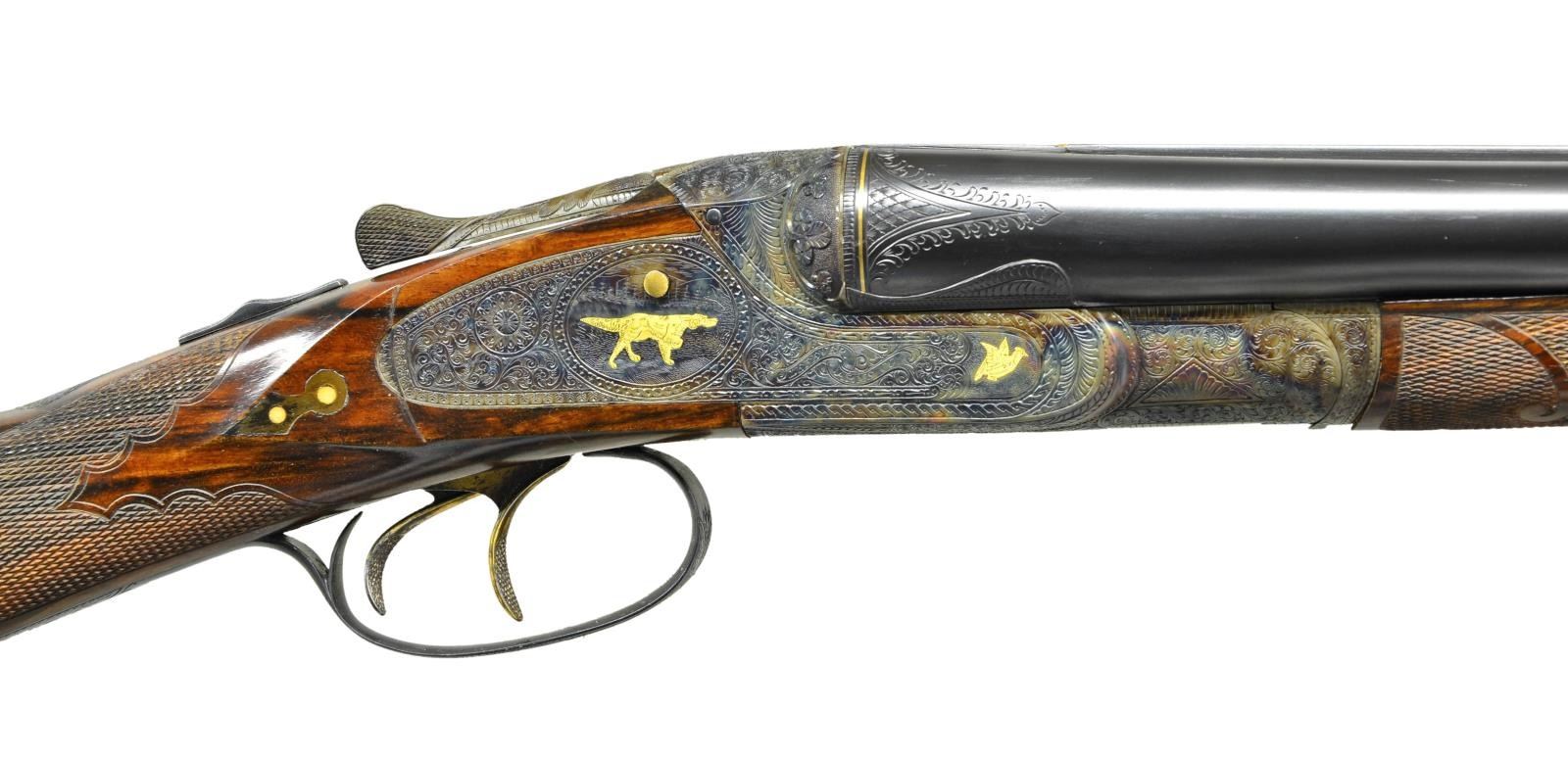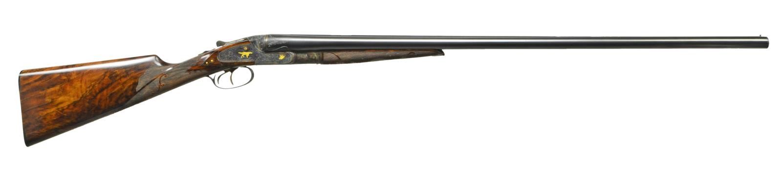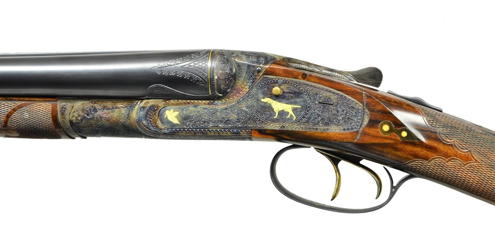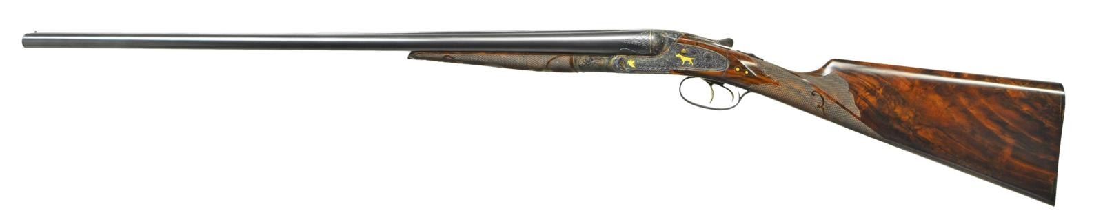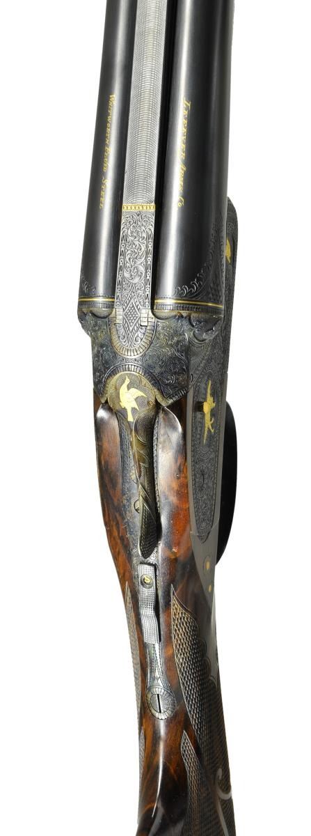UPGRADE. Cal. 16 Ga., 2 5/8". S# 047930. Small bore Optimus guns are exceedingly rare and generally speaking, ones only hope of finding an example is to buy or create an upgrade. This attractive small bore gun has 30" barrels with slightly raised matted rib holding one steel bead. Tops of barrels are gold inlaid "Lefever Arms Co." "Whitworth Fluid Steel". Gold bands are around breech ends and there are triangles of engraving in front of bands. High grade Lefever barrel ogees have been cut in. Bottoms of barrels are newly stamped with sheaf of wheat trademarks (some distortion noted in bores). Case hardened sideplate action with S# and "Optimus" on watertable, features automatic safety "S" inlaid in gold, gold plated cocking indicators and triggers (finger blades checkered). Action is well filed with nicely shaped beads, rebated lockplates, shamrocks on fences and chevrons on top lever. Action and lockplates are engraved with near full coverage, nicely cut shaded scroll within geometric and line borders. This well done engraving surrounds flush gold inlaid dog scenes on lockplates with pointer on left and setter on right. Forward part of plates is gold inlaid with flying snipe on left and quail on right. Bottom of action has gold inlaid walking snipe and a flying pigeon is in gold on top lever. Trigger guard bow is inlaid with a setter retrieving a bird. S# is on tang. Newly made straight grip buttstock of well marbled and figured European walnut measures 14 5/8" over checkered wood butt with horn heel and toe plates. Flush inlet clock hand horn drop points have white dot accents. The checkering is of Optimus pattern with scrolled ribbons and flourishes toward comb. Matching splinter forend has flush gold inlaid setters head on steel escutcheon along with a fancy horn forend tip. MEASUREMENTS: BBLS: Bore Diameter: L .671". R .671". Restriction: L .023" (mod). R .012" (light mod). Wall thickness: L .029" R .033". STOCK: DAH: 2 9/16". DAC: 1 7/16". CAST: neutral. LOP: 14 5/8". WEIGHT: 7 lb. 0 oz. CONDITION: exceptionally fine as refurbished retaining nearly all custom finishes on both wood and metal with only a few very minor handling marks. Bores are bright. Distortion is noted from newly stamped trademarks in both barrels. Action is tight, mechanically good. (22-5628/MGM). CURIO. $7,000-11,000.