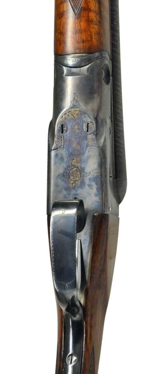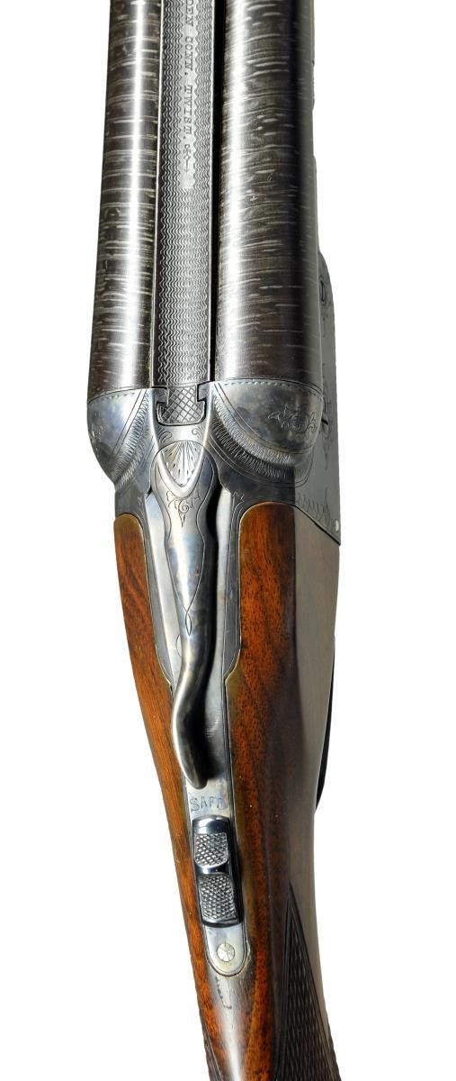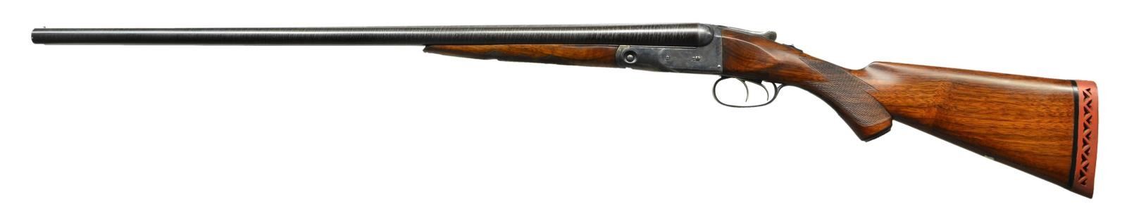 Cal. 16 Ga. S# 67057. Bbl. 28” plain twist. Box lock action w/ “P” grade engraving consisting of simple scroll highlights & borders. Dog leg top lever, double triggers & extractors. Splinter forearm & hard rubber capped stock of checkered walnut has German silver shield on toe line. LOP: shortened to 14 1/8” over an aftermarket Hawkins pad. Bore diameter: Right .669, Left .670. Bore constriction: Right .018, Left .018. Wall thickness Right .025, Left .025. Mfg. 1892. CONDITION: nicely restored gun. Bbls. retain nearly all gray toned rebrowned finish. Action has near excellent restored case colors. Sanded & refinished wood has very good semi gloss finish w/ freshened checkering. Lightly pitted bores. (23-467/DS). ANTIQUE. $3,000-4,500.