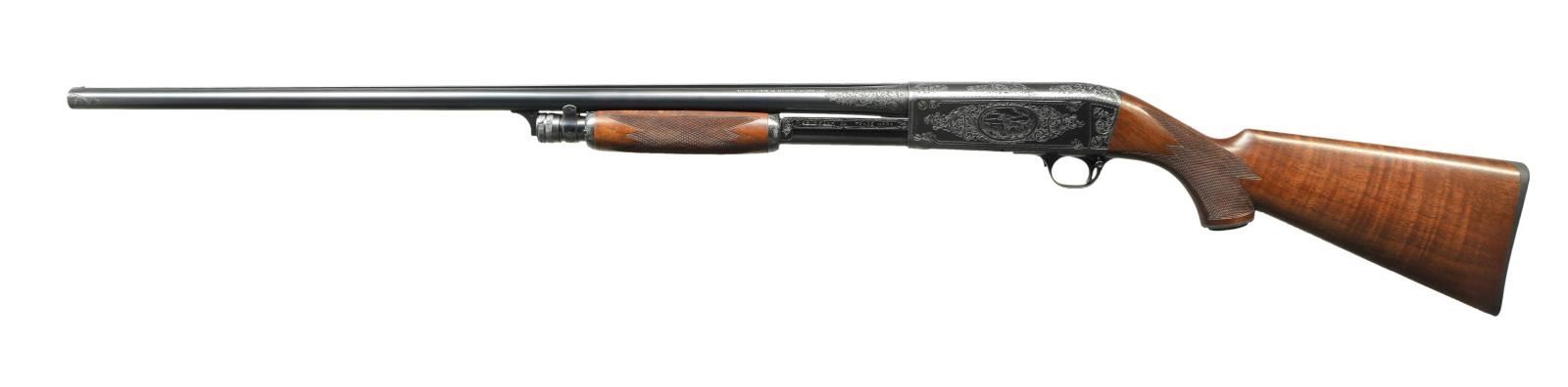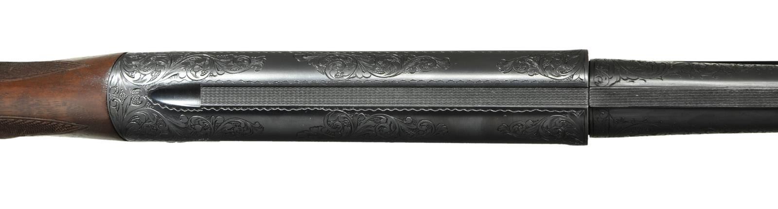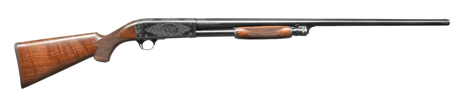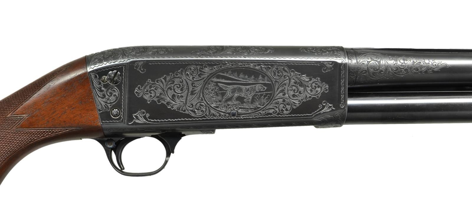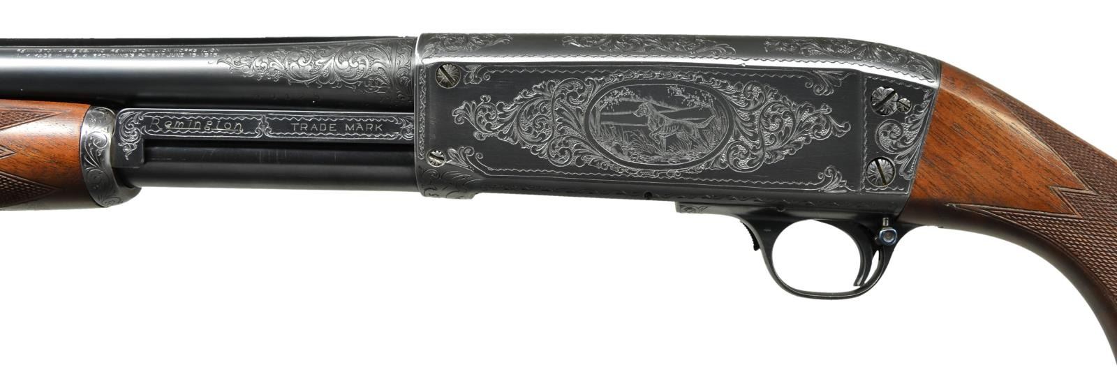 Cal. 20 Ga. S# 60425. Bbl. 28" solid rib w/ steel bead & fixed full choke. Action has 75% coverage of fine hand engraving. Viginette on side right features a woodland scene w/ a pointing setter. Left side features a pointer in a woodland scene. Scenes are surrounded by wedges of vine type foliate scroll w/ punch dot backgrounds. Complimenting engraving is found on breech end of bbls., forearm iron & bbl. hanger. Small round forearm & pistol grip custom stock of satin finished fancy walnut having factory style point pattern hand checkering. Reproduction grip cap & buttplate. LOP: 13 5/8". WEIGHT: 6 lbs, 2 ozs. Approx. 48,000 model 17 bottom ejection pump shotguns were mfg. 1917-1933. Date code on bbl. indicates December 1930 mfg. CONDITION: near excellent as refurbished. Metal retains nearly all custom blue. Wood has excellent custom finish. Very good bright bore. (23-466/DS). CURIO. $5,000-8,000.