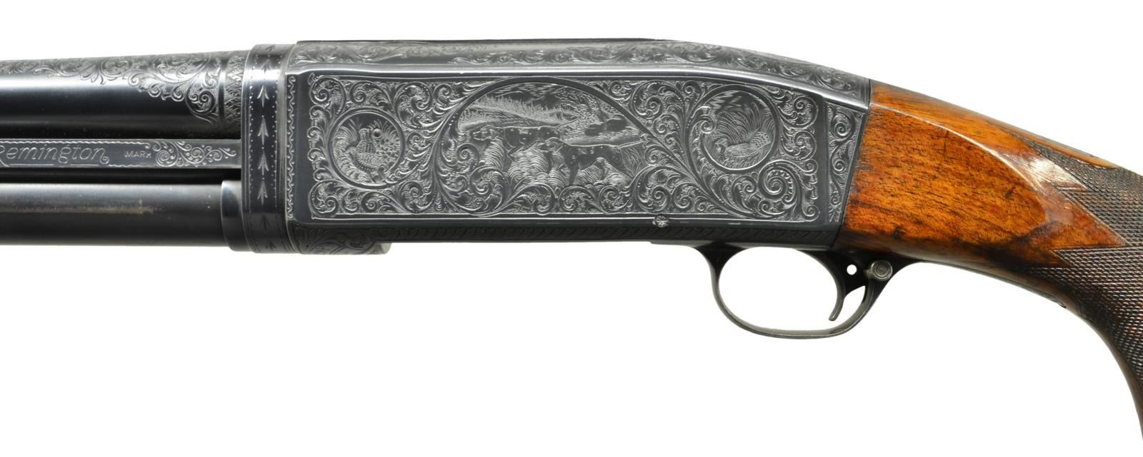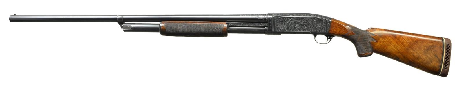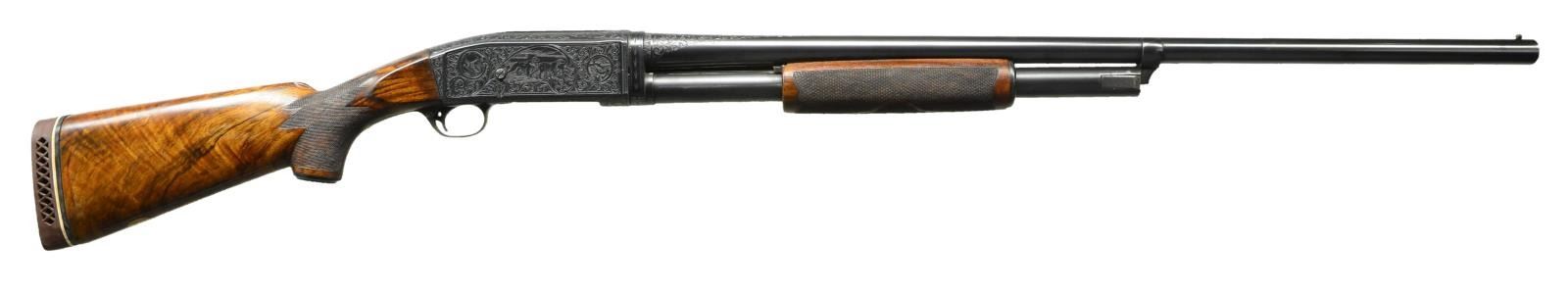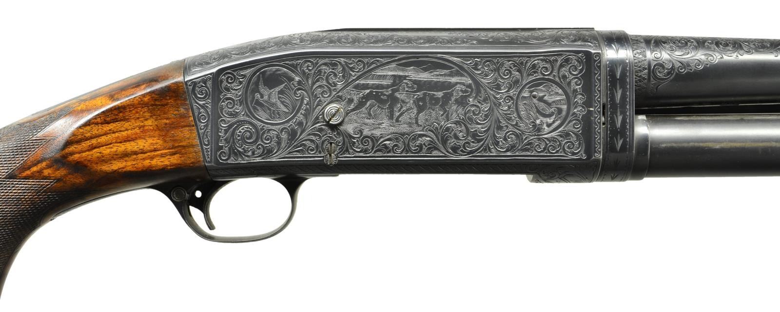 Cal. 12 ga. S#. 415. Bbl. 30" plain with fixed Full choke. Bottom ejection action has full coverage "F" grade Premier engraving. Right side features a scene with 2 pointing setters between circular vignettes of a woodcock and snipe. Left side scene features 2 pointers with vignettes of quail and partridge. Scenes are surrounded by vine type foliate scroll with stippled backgrounds and fancy borders that extend to upper and lower action areas. Breech end of bbl. and slide bar have complementing scroll. Round forend and hard rubber capped pistol grip stock are of fancy hard shell walnut. Forend has segmented checkering with scalloped borders, wrist of stock has point pattern checkering. Stock has an oval nameplate on toeline. LOP. 13 1/2" over a shaved to fit aftermarket. White Line pad. Approx. 24,000 Model 29s were mfg. 1929-1933. CONDITION: Over 90% original blue showing light edge and slide wear. Forend finish shows light wear and crazing. Refinished stock dents and marks , slightly thinned checkering and rounding at toe. Very good bright bore. (22-6037/DS). CURIO. $5000-7500.
