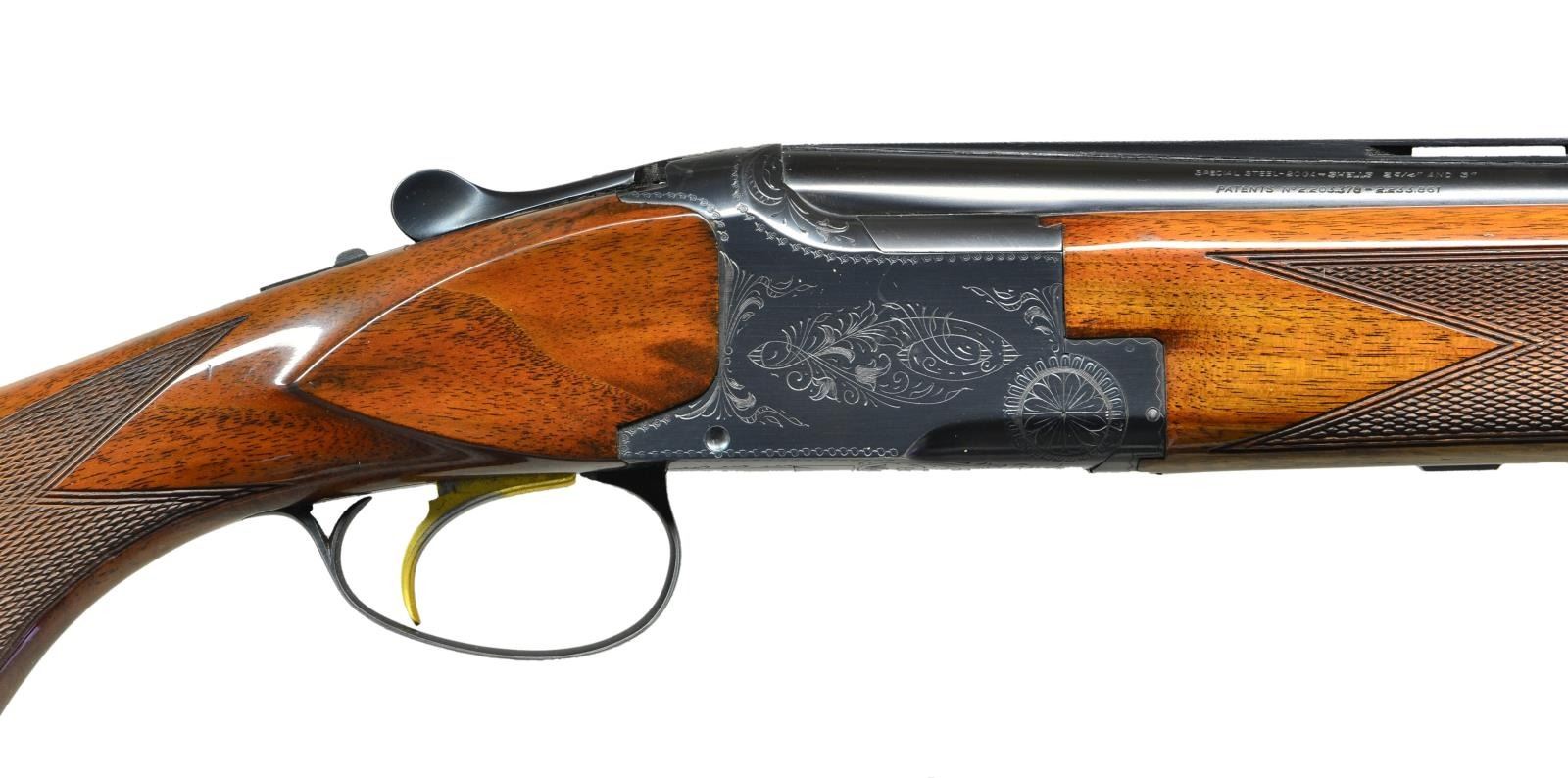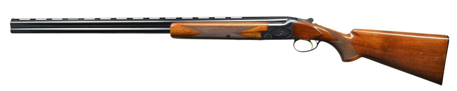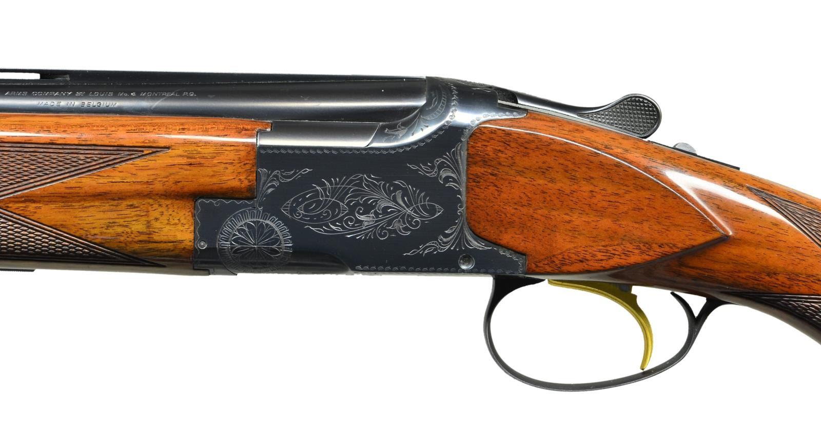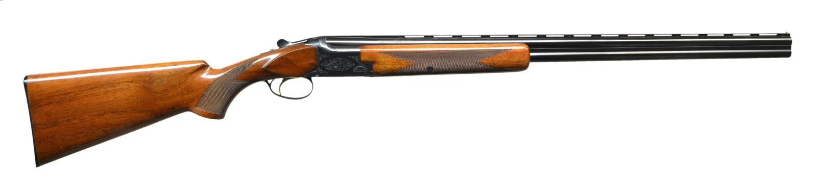 SHOTGUN. Cal. 20 ga. 2 3/4" & 3". S#: 57730V69. Bbls: 28" with vent rib, steel bead and fixed Mod & Full chokes. Blued action has grade 1 engraving, gold finished SST & ejectors. Lightning forend & flat knob short tang stock of gloss finished checkered walnut. LOP: 14 1/8" over original buttplate. 1969 Belgian mfg. CONDITION: Over 97% original blue shows light edge wear. Original wood finish shows numerous small marks on left side near the buttplate. Bright near excellent bores. (22-5942/DS). CURIO. $1750-2500.