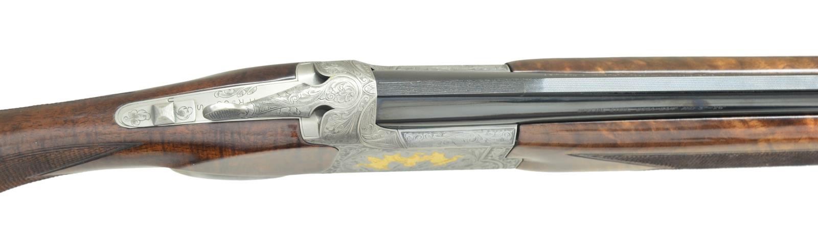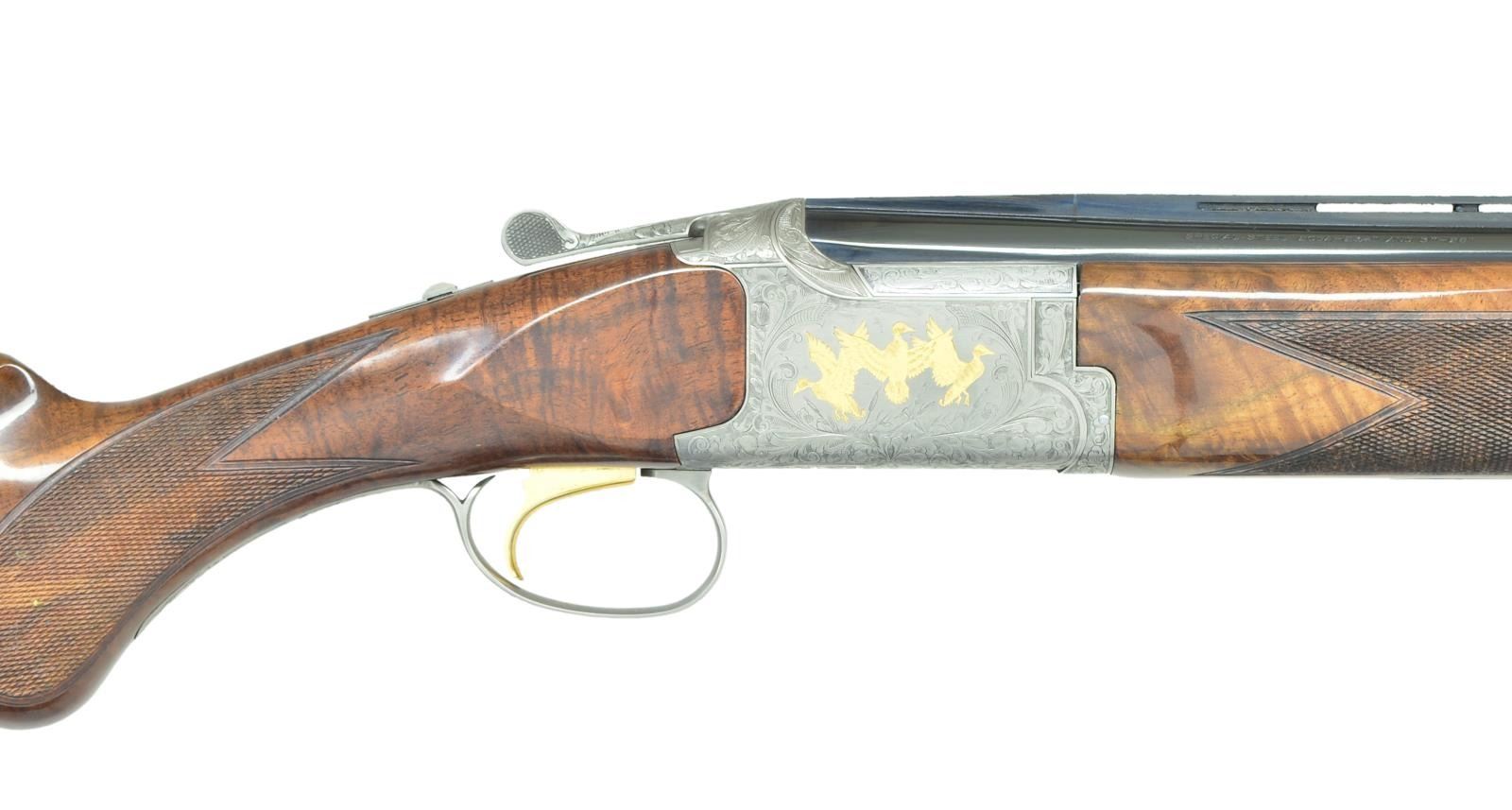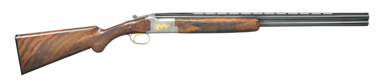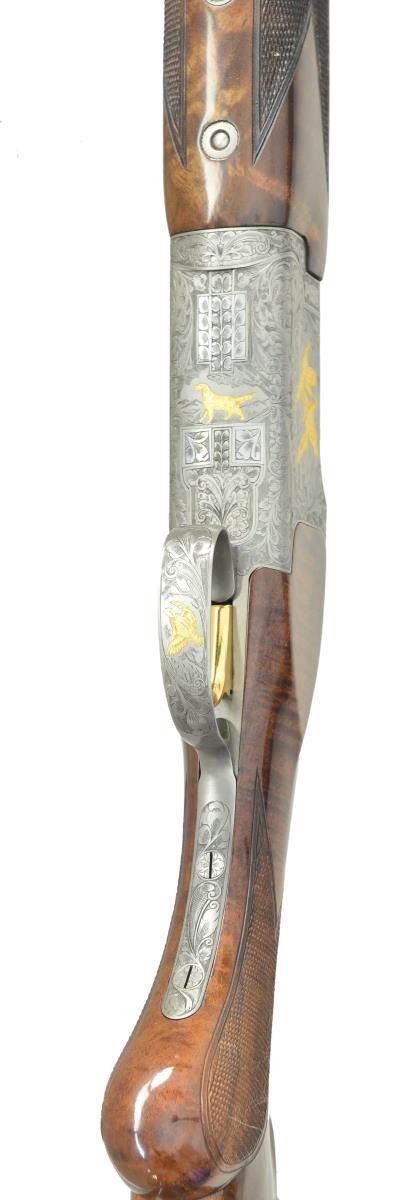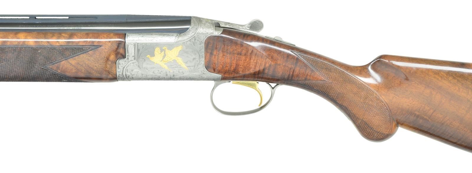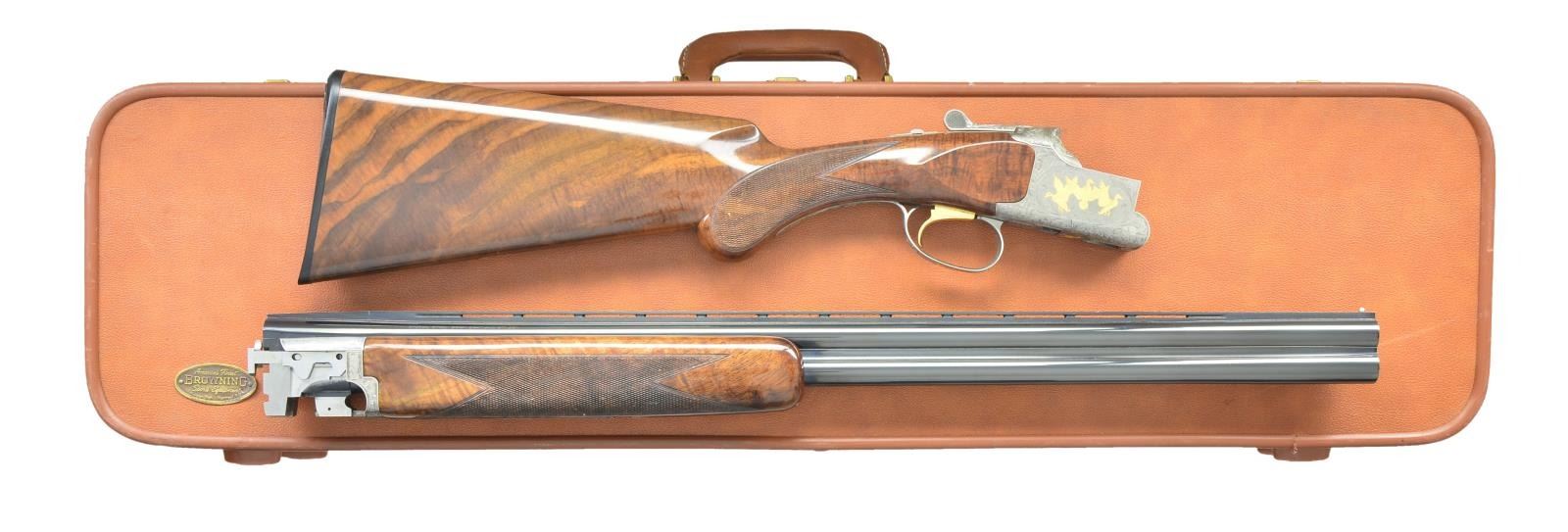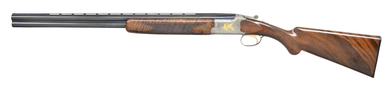 Cal. 20 Ga 2/3” & 3”. S# 28414PR963. Bbls. 26” vent rib w/ steel bead. Invector interchangeable chokes, IC&M tubes included. Satin finished boxlock action. Ornamentation features gold plated mallards on right, pheasants on left, setter on floorplate w/ a quail on the trigger guard. Scenes are surrounded by vine type foliate scroll that continued to forearm irons & breech section of bbls. Gold plated SST & selective ejectors. Lightning forearm & round knob long tang pistol grip stock of gloss finished fancy walnut w/ point pattern checkering. LOP: 14 1/8” over original buttplate. Mfg. 1987. UNATTACHED ACCESSORIES: Browning Airways luggage case containing instruction manual & case keys. CONDITION: near excellent retaining 99% wood & metal finish. Bright near excellent bores. (22-5945/DS). MODERN. $3,000-4,500.