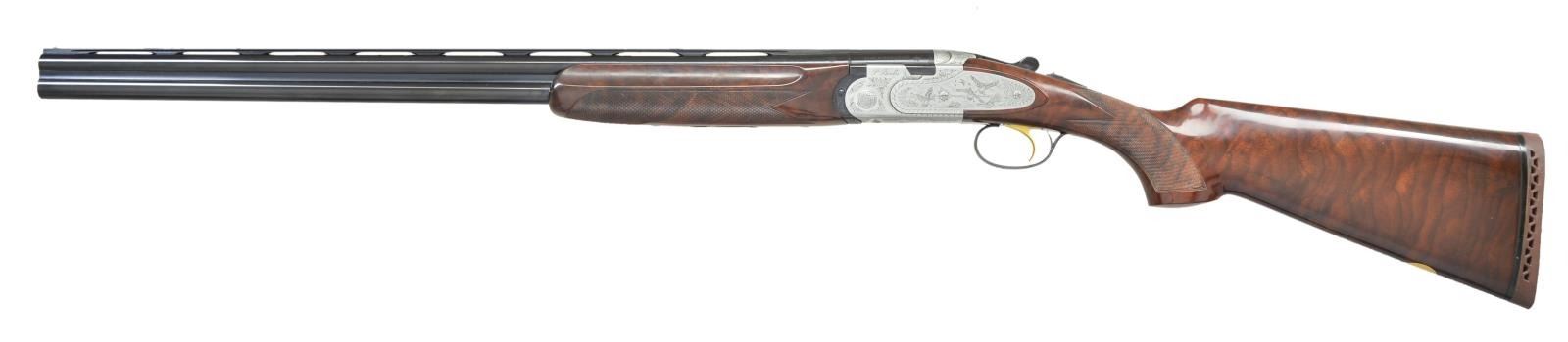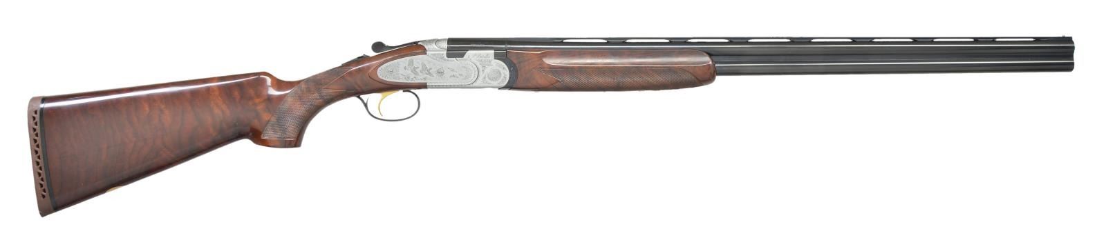 Cal. 20 Ga., 3". S# F29219B. Bbl. 26” vent rib w/ steel bead. Fixed IC & Mod chokes. Satin finished sideplated box lock action. Engraving features flying prarie chickens on the right lock plate, flying mallards on the left sideplate w/ a woodcock on the floorplate. Seams are highlighted by wedges of arabesque scroll. Gold finished SST & selected ejectors. Trim beavertail forearm & uncapped pistol grip stock of fancy walnut have gloss finish, cut checkering & oval nameplate in toe line. LOP: 14 5/8" over original Beretta pad. WEIGHT: 5lb., 13.2oz. UNATTACHED ACCESSORIES: Beretta blue molded case containing case instructions. CONDITION: near excellent retaining virtually all wood & metal finish. Buttplate shows heat distortion at heel & toe. Bright near excellent bores. (22-5951/DS). MODERN. $3,500-5,000.
